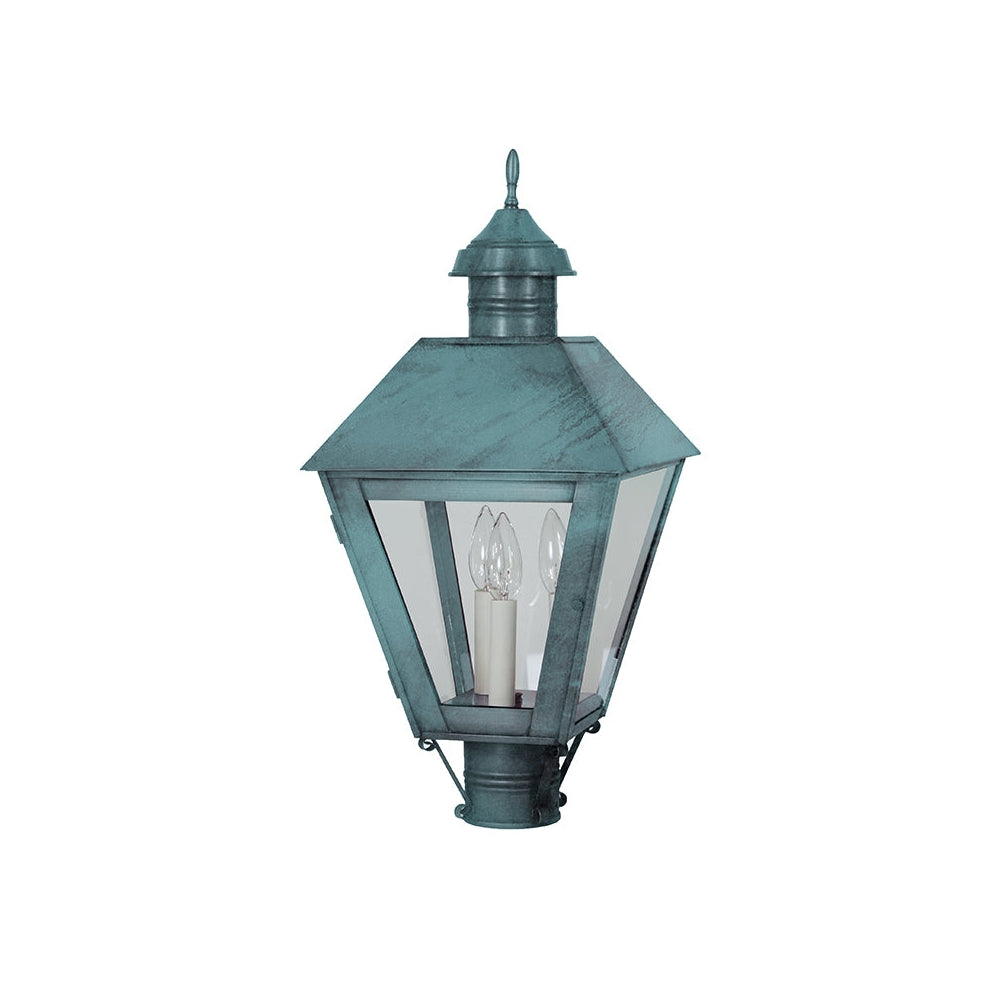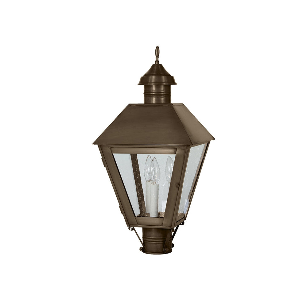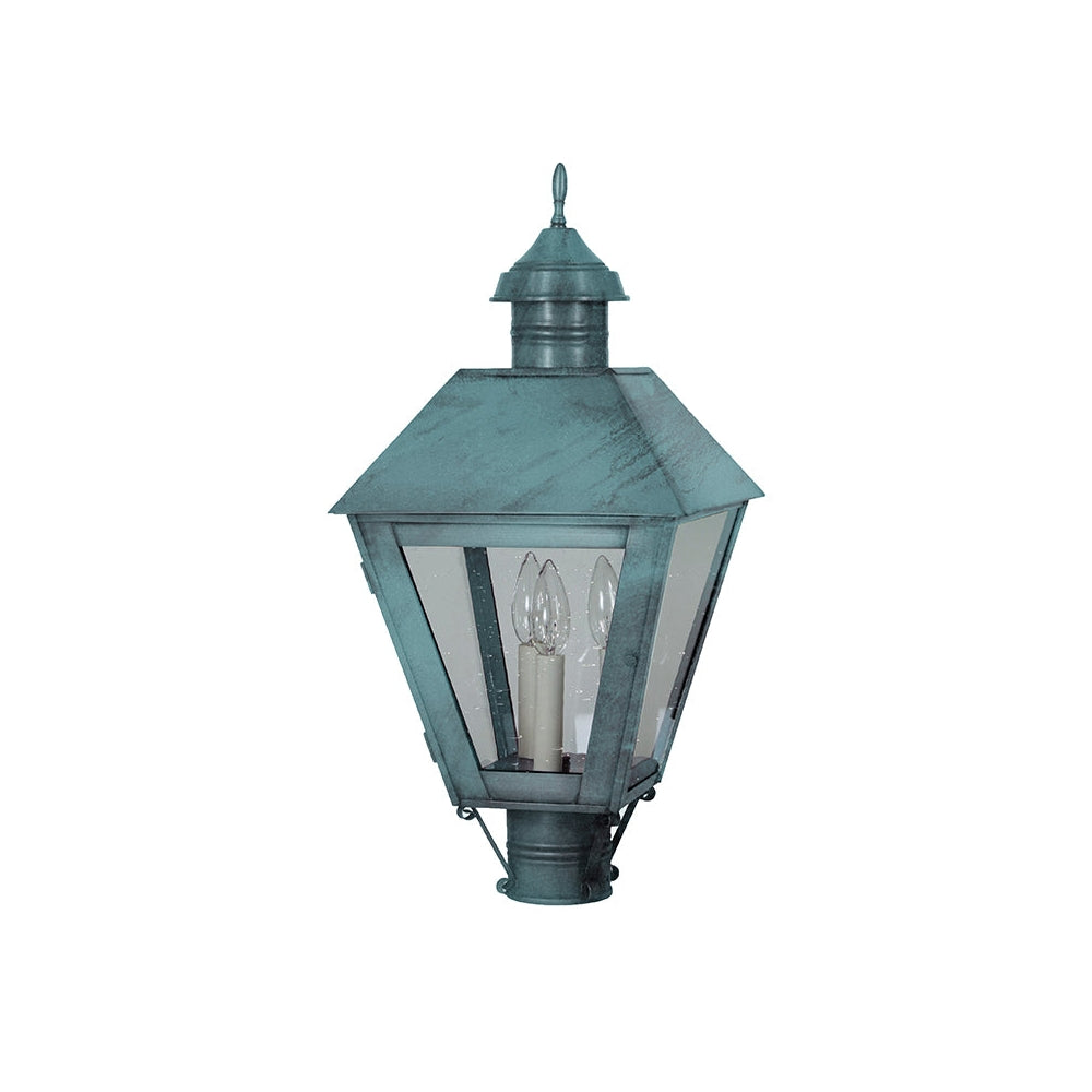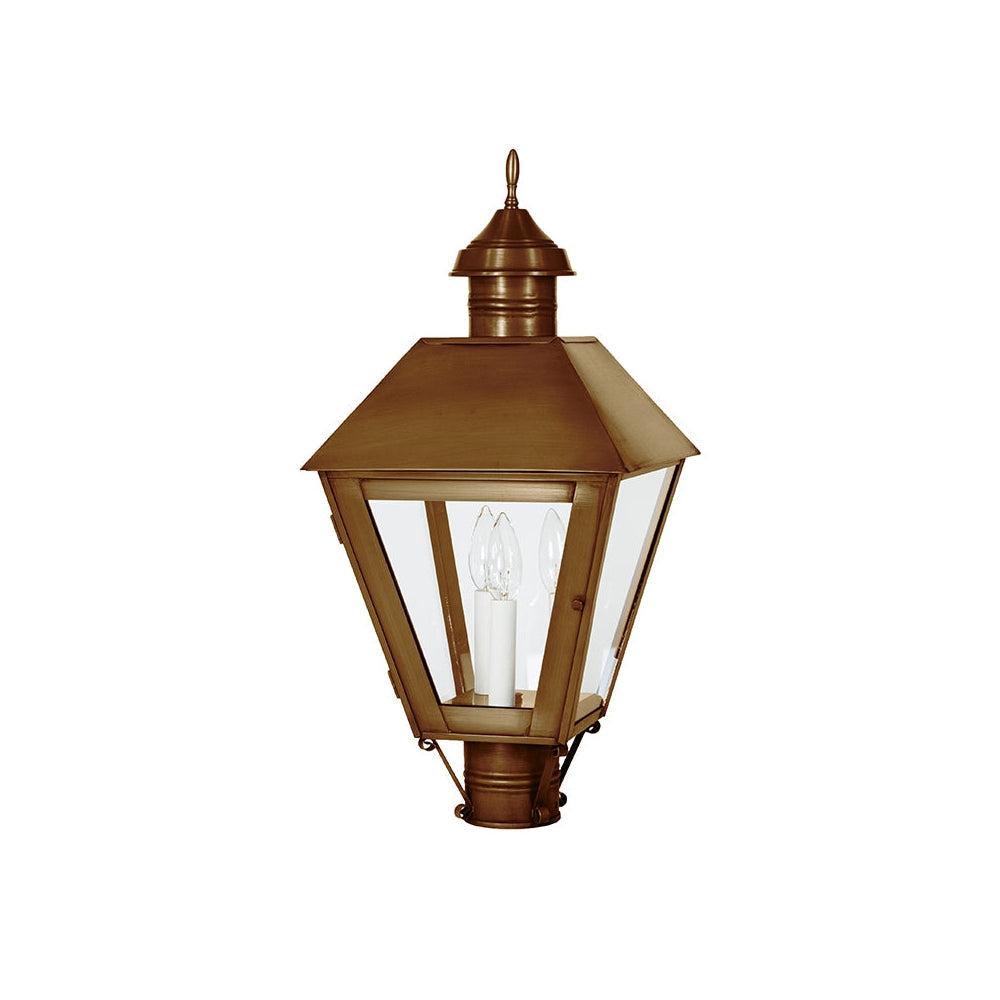 Our popular Boston Collection lights are commanding yet gracious in their beauty. Created with durability and function in mind, our post lights compliment any style base from the roughness of a natural granite post to the smooth surface of finished red cedar. A variety of spinnings are available to create a custom finish. Choose between a series 10 with glass top, series 11 with solid top, series 12 with glass top and glass middle yoke, or series 13 with solid top and glass middle yoke. This 1113 (pictured in antique brass with (1) 75-watt medium base socket and clear chimney) is a traditional tapered post mount fixture with a solid top and 3" fitter. It is available with either (1) 75-watt medium base socket and chimney or (3) 60-watt candelabra sockets and plastic cream sleeves. This fixture has been constructed with a door and tabs to make the removal and installation of the glass panels effortless if they need to be washed or replaced. This light also available as a wall mount fixture 1111: 12"W x 14"D x 25"H (not shown) or a hanging fixture 1112: 12"W x 12"D x 23"H (not shown)..