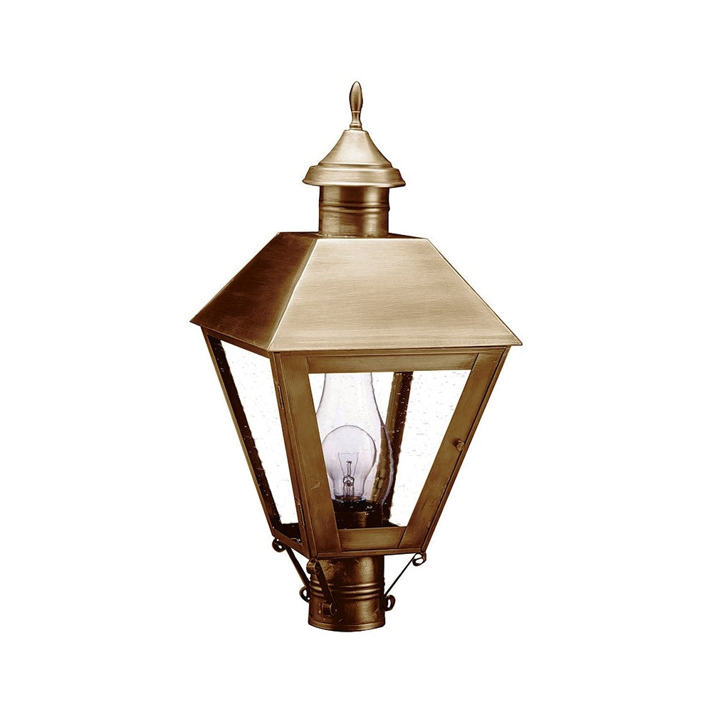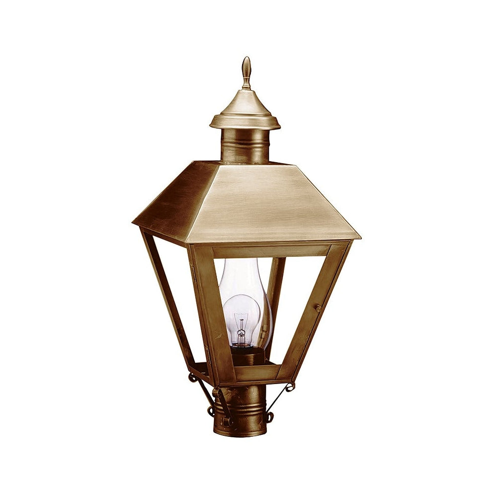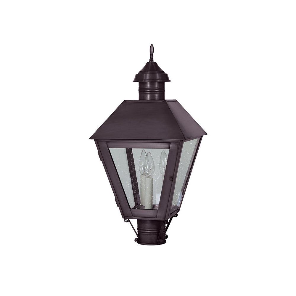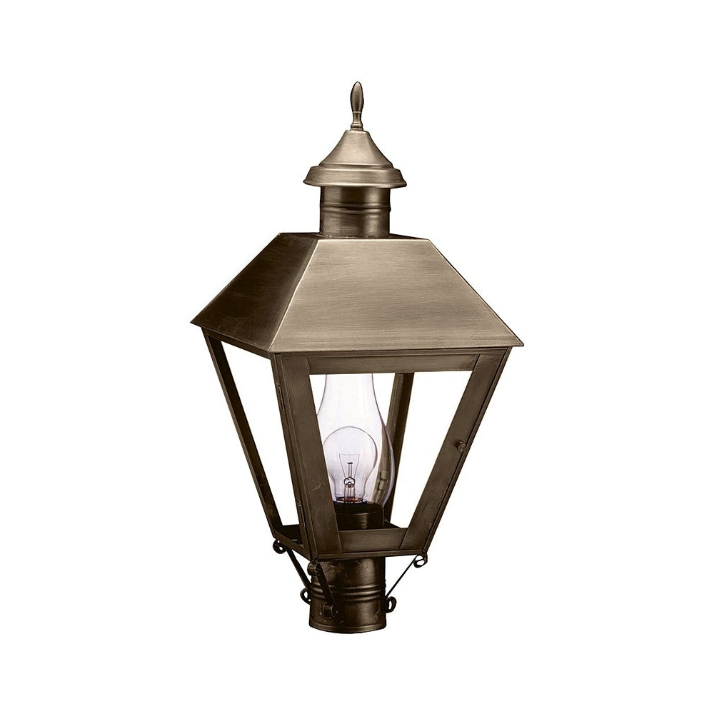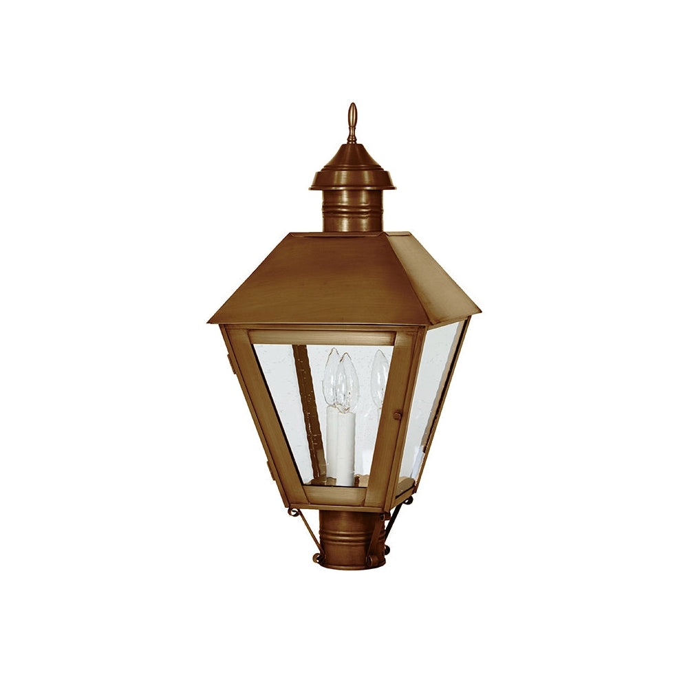 Our popular Boston Collection lights are commanding yet gracious in their beauty. Created with durability and function in mind, our post lights compliment any style base from the roughness of a natural granite post to the smooth surface of finished red cedar. A variety of spinnings are available to create a custom finish. Choose between a series 10 with glass top, series 11 with solid top, series 12 with glass top and glass middle yoke, or series 13 with solid top and glass middle yoke. This 1113 (pictured in antique brass with (1) 75-watt medium base socket and clear chimney) is a traditional tapered post mount fixture with a solid top and 3" fitter. It is available with either (1) 75-watt medium base socket and chimney or (3) 60-watt candelabra sockets and plastic cream sleeves. This fixture has been constructed with a door and tabs to make the removal and installation of the glass panels effortless if they need to be washed or replaced. This light also available as a wall mount fixture 1111: 12"W x 14"D x 25"H (not shown) or a hanging fixture 1112: 12"W x 12"D x 23"H (not shown)..