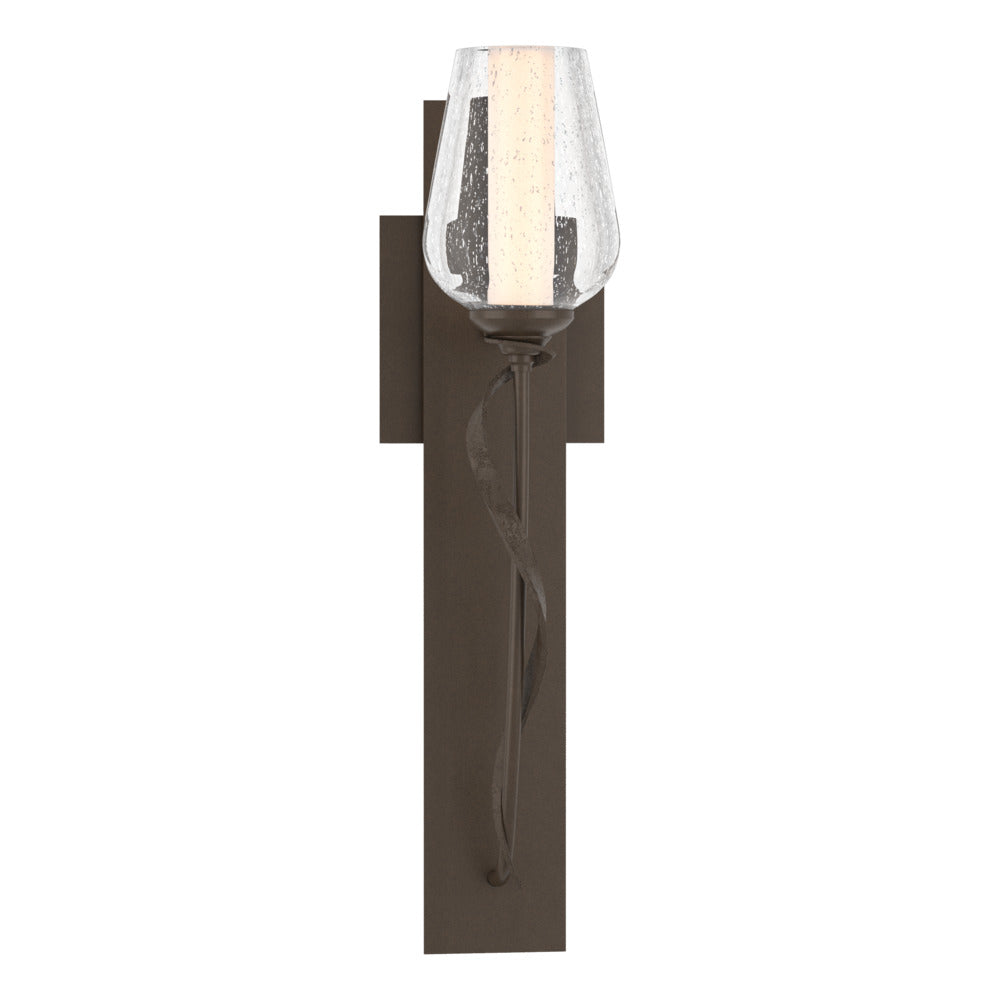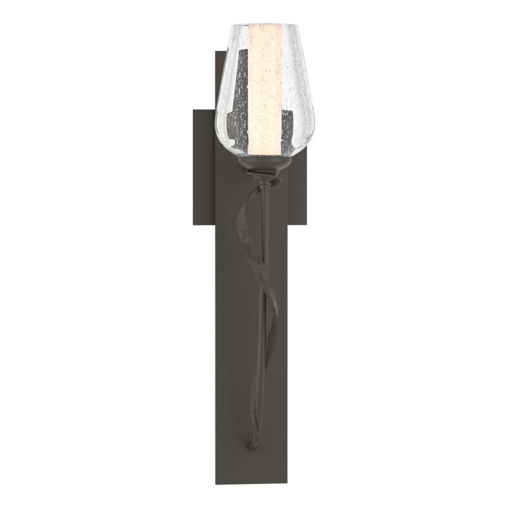 Does the glass shade "flower" bloom from the gently curved steel stem or the twining vine? Does it matter? Either way, the curves and lines of this wall sconce work together artfully and will add class to any space.