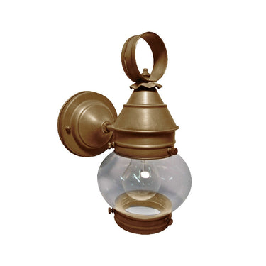 A customer favorite, our Onion Collection is the hallmark of Northeast Lantern. Each piece is carefully cut, soldered, finished and wired by hand. Crafted with a detachable globe, they are easy to maintain. This 2015 is a small onion wall mount fixture with (1) 75-watt medium base socket from the top and a 5" round backplate. All joints are securely soldered in place with precision and attention to detail. Three solid brass thumbscrews secure the hand blown glass globe in place ensuring easy removal for cleaning and bulb replacement.