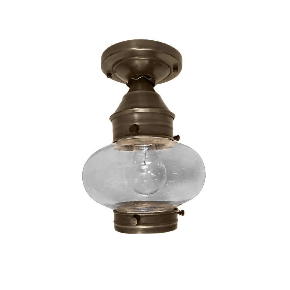 A customer favorite, our Onion Collection is the hallmark of Northeast Lantern. Each piece is carefully cut, soldered, finished and wired by hand. Crafted with a detachable globe, they are easy to maintain. This 2024 (pictured in antique brass with an optional 7" optic globe) is a small onion flush mount fixture with (1) 75-watt medium base socket from the top and 5¾" canopy. All joints are securely soldered in place with precision and attention to detail. Three solid brass thumbscrews secure the hand blown glass globe in place ensuring easy removal for cleaning and bulb replacement.