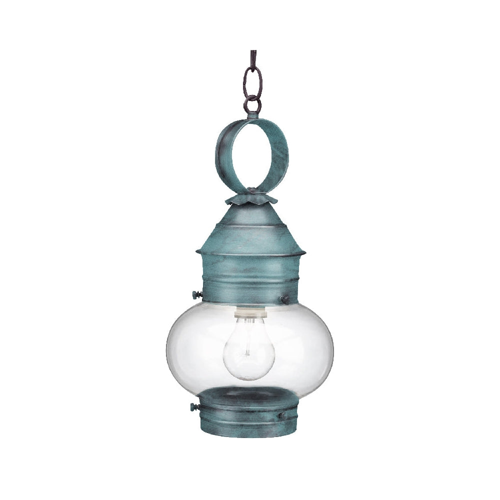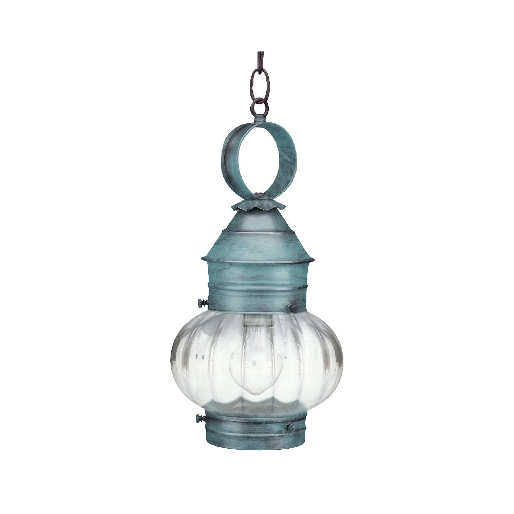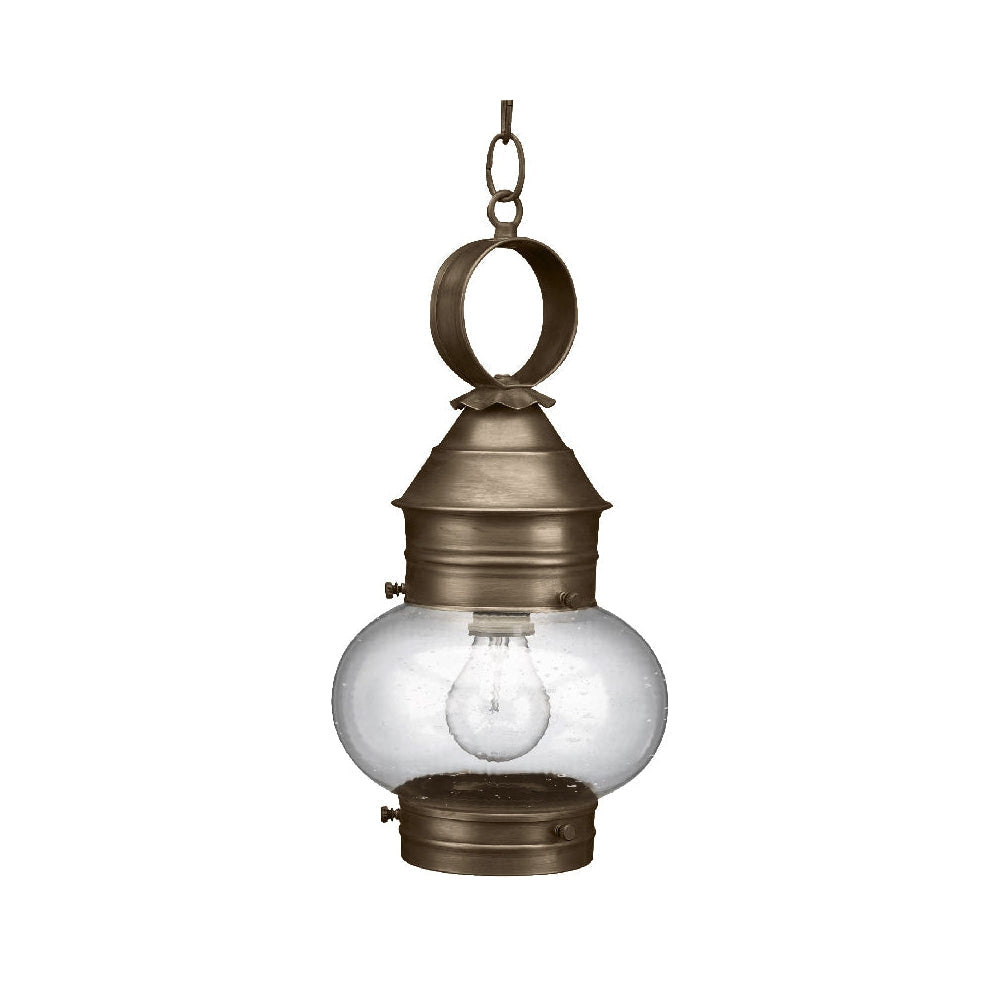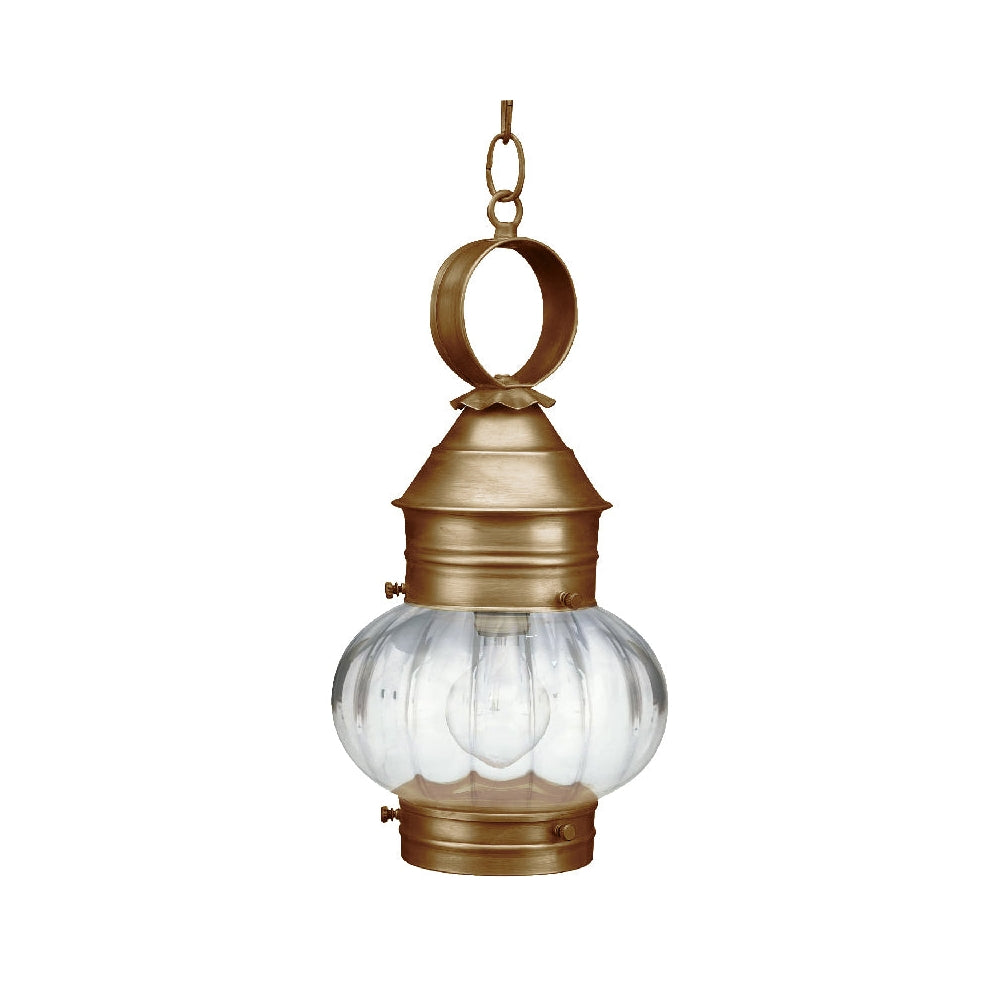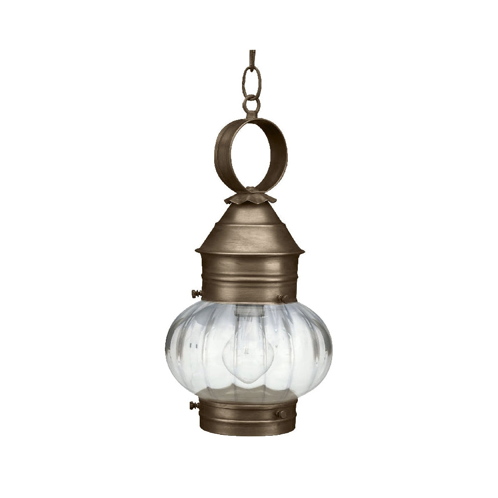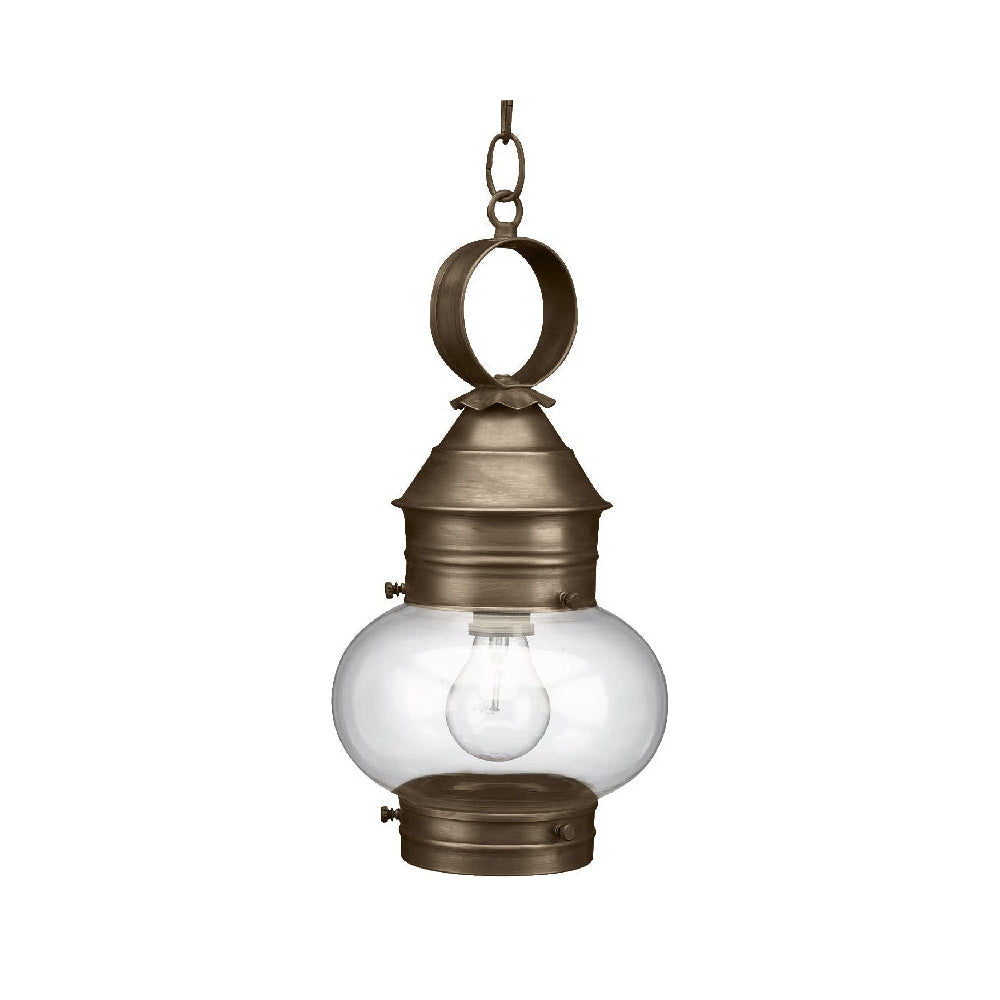 A customer favorite, our Onion Collection is the hallmark of Northeast Lantern. Each piece is carefully cut, soldered, finished and wired by hand. Crafted with a detachable globe, they are easy to maintain. This 2032 (pictured in antique brass with optional 8" optic globe) is a medium onion hanging fixture with (1) 75-watt medium base socket from the top, 12" chain and 5" canopy. All joints are securely soldered in place with precision and attention to detail. Three solid brass thumbscrews secure the hand blown glass globe in place ensuring easy removal for cleaning and bulb replacement. See our 2032G for this same fixture with a decorative galley.