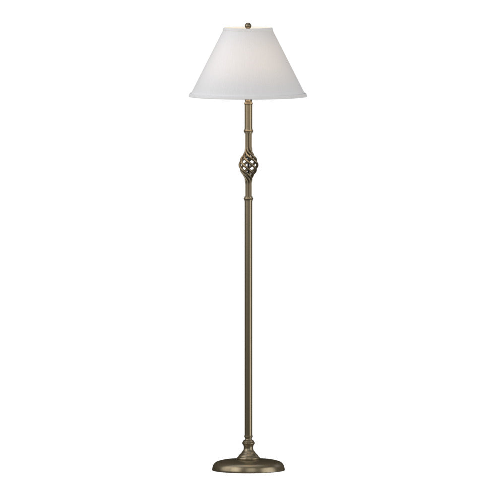 Hubbardton Forge Wrought Iron Twist Basket Floor Lamp with Round Base and eight shade options. This beautiful floor lamp seamlessly blends elegance and simplicity.