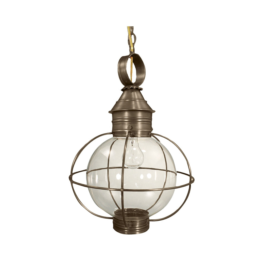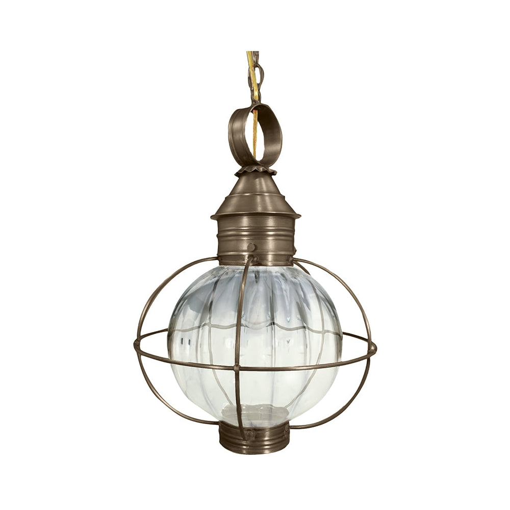 A customer favorite, our Round Onion Collection offers a new perspective to the traditional onion. Assembled with a circular glass globe, each piece is carefully cut, soldered, finished and wired by hand. Crafted with a detachable globe, they are easy to maintain. This 2842 (pictured in antique brass with optional 10" optic globe) is a caged round onion hanging fixture with (1) 75-watt medium base socket from the top, 12" chain and 5" canopy. All joints are securely soldered in place with precision and attention to detail. Three solid brass thumbscrews secure the caged hand blown glass globe in place ensuring easy removal for cleaning and bulb replacement.