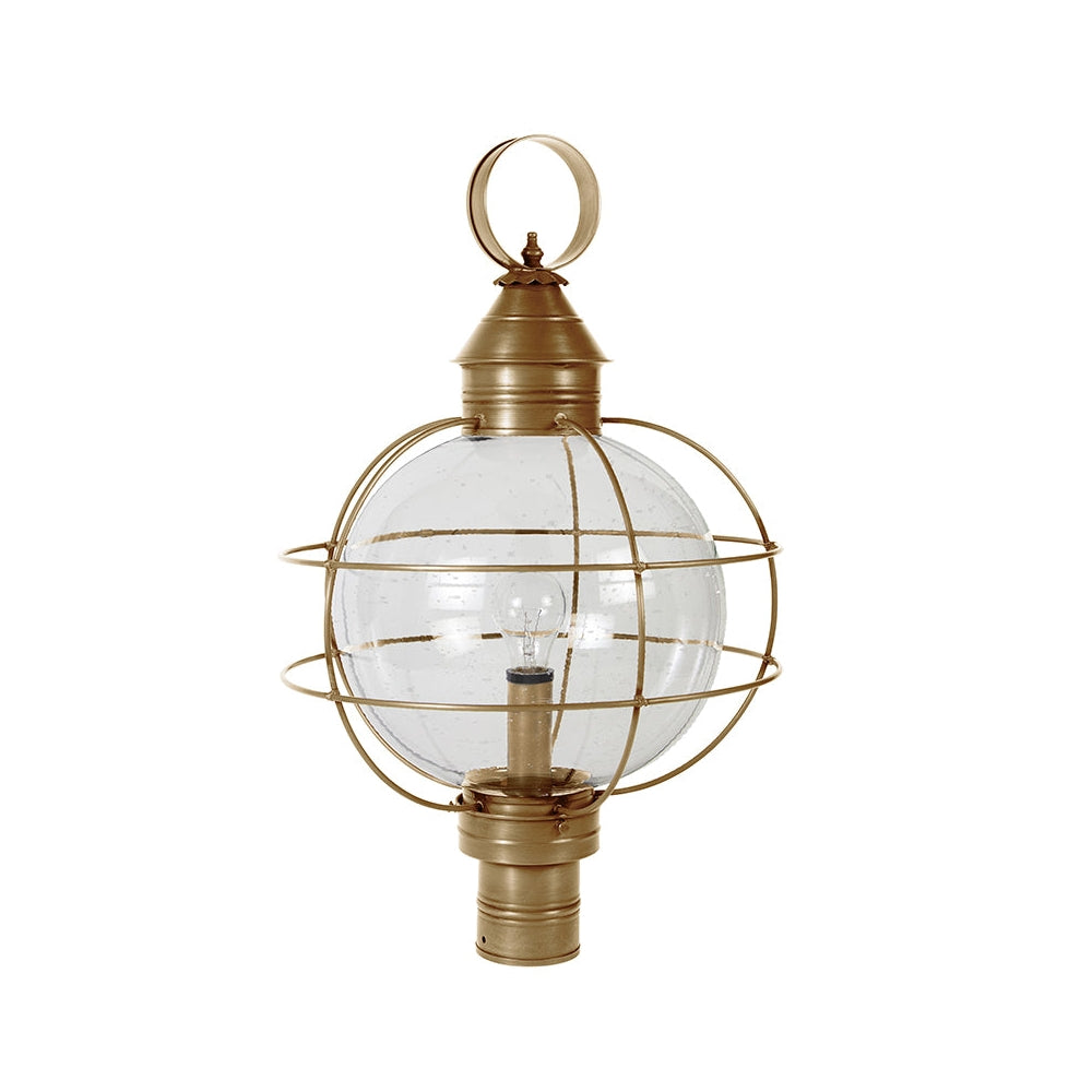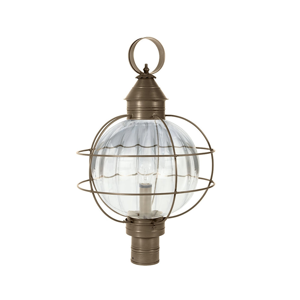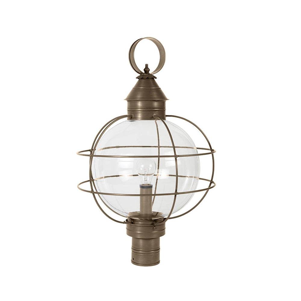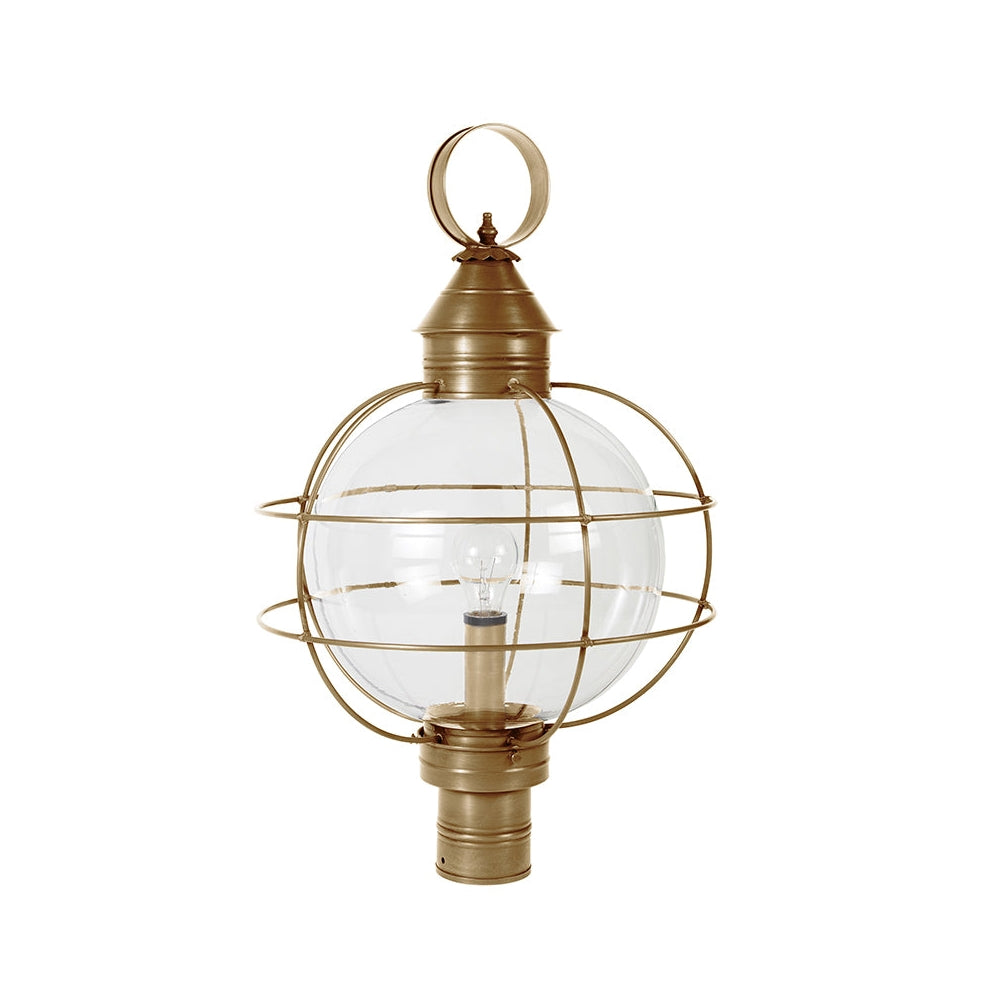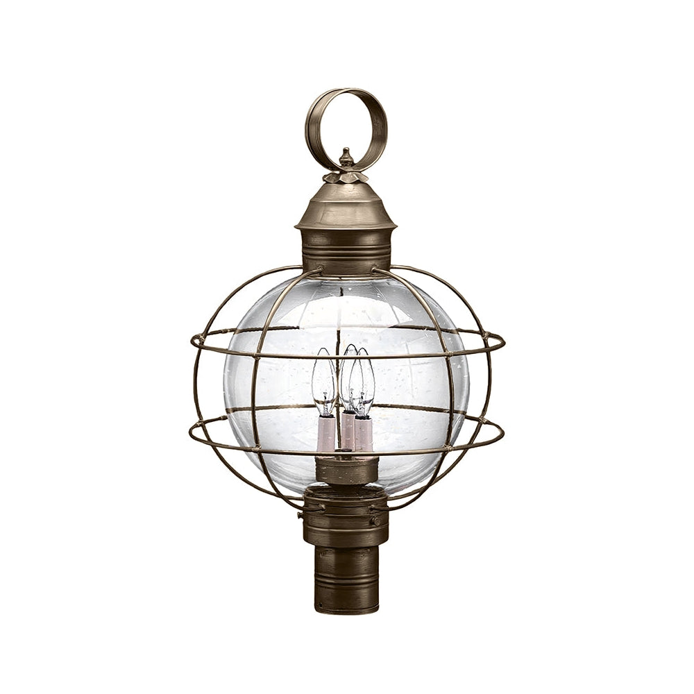 A customer favorite, our Round Onion Collection offers a new perspective to the traditional onion. Assembled with a circular glass globe, this large fixture is soldered with a double barred cage and wrapped with wire to ensure durability. Crafted with a detachable globe, they are easy to maintain. This 2853 (pictured in dark brass with (3) 60-watt candelabra sockets and optional 12" optic globe) is an X-Large caged round onion post fixture with a 3" fitter. It is available with either (1) medium base socket or (3) 60-watt candelabra sockets and plastic cream sleeves. All joints are securely soldered in place with precision and attention to detail. Three solid brass thumbscrews secure the hand blown glass globe in place ensuring easy removal for cleaning and bulb replacement.