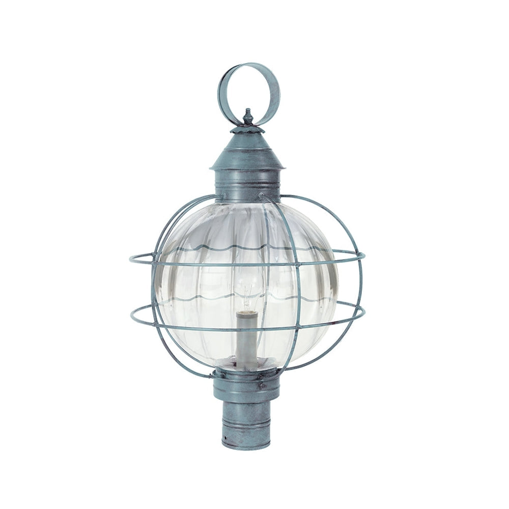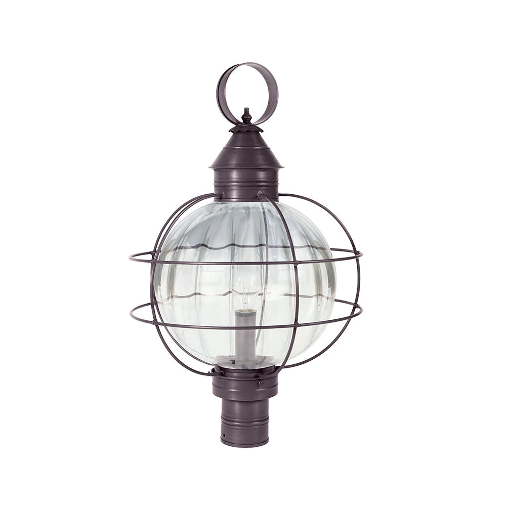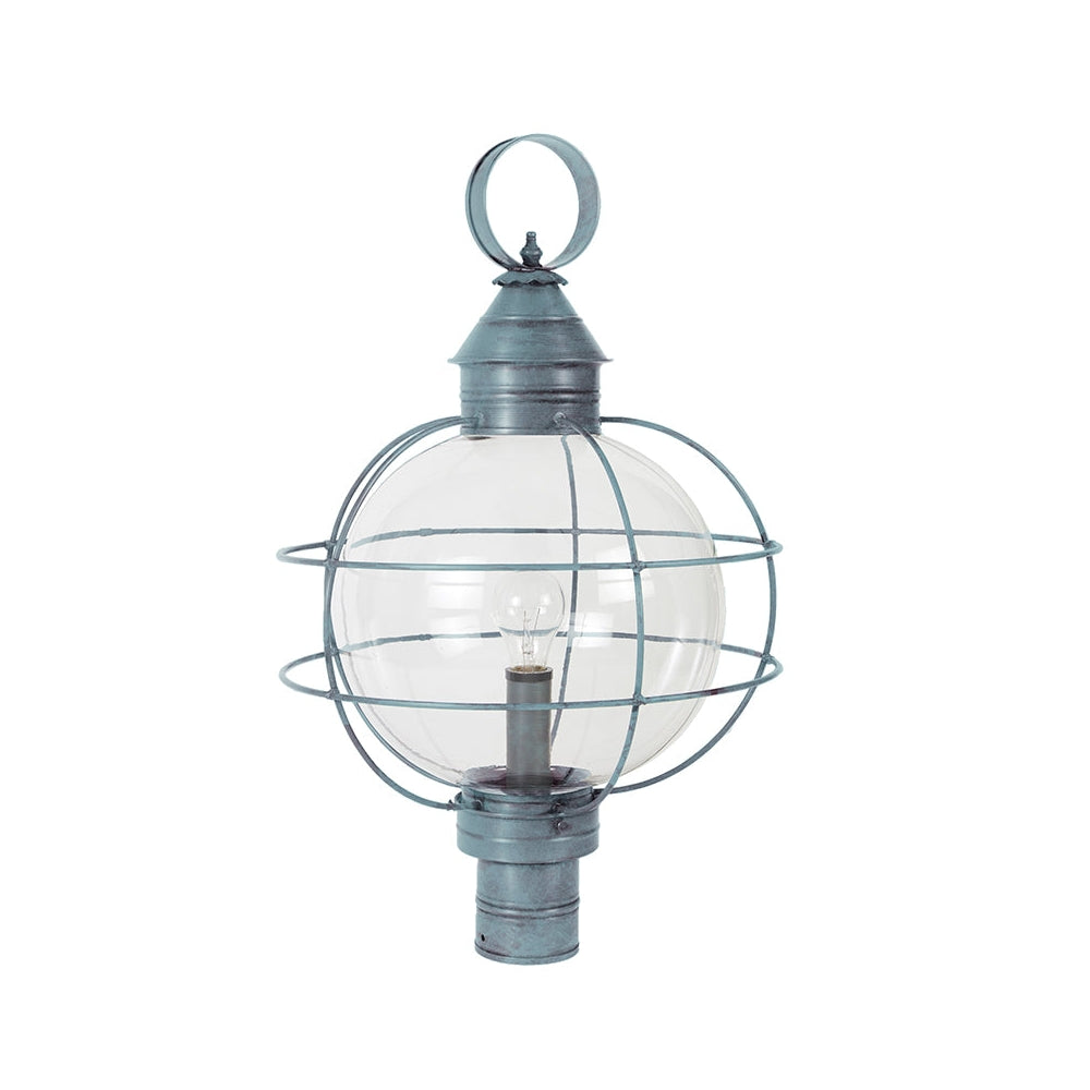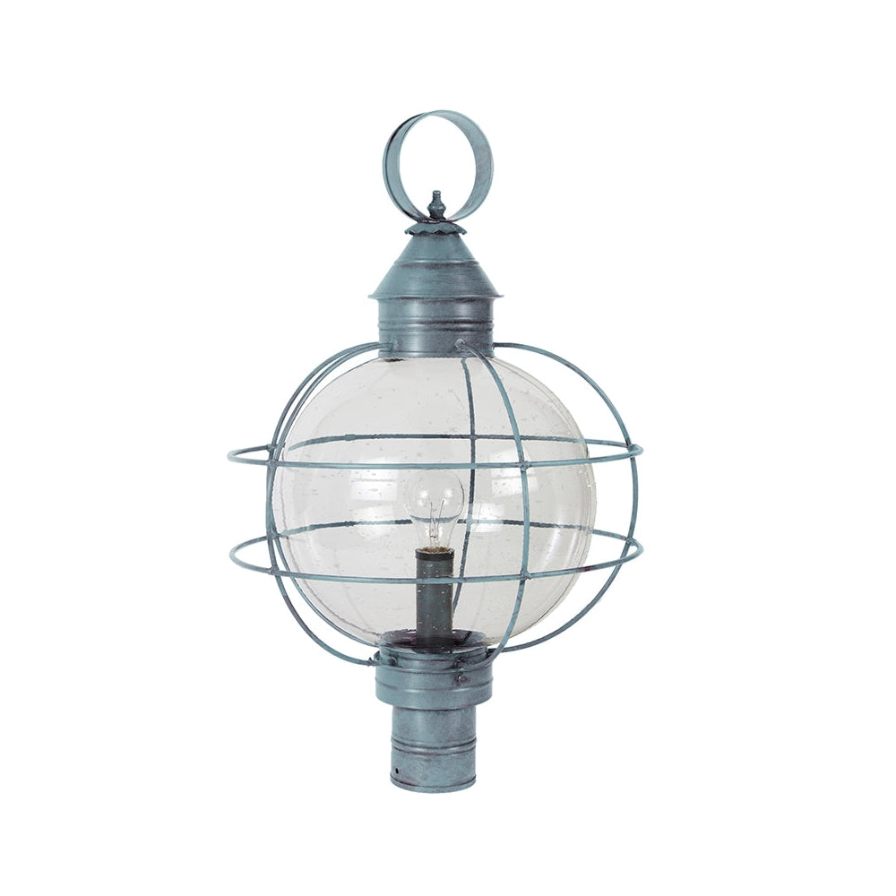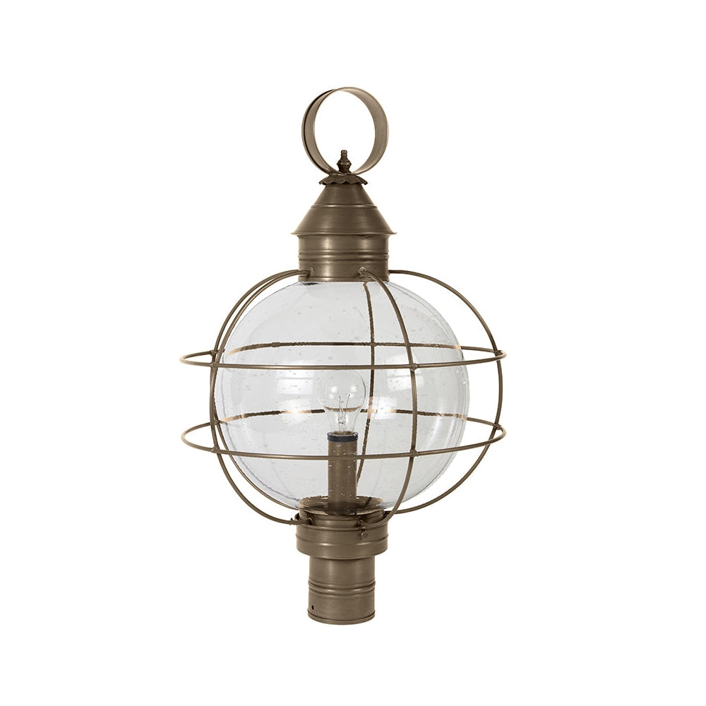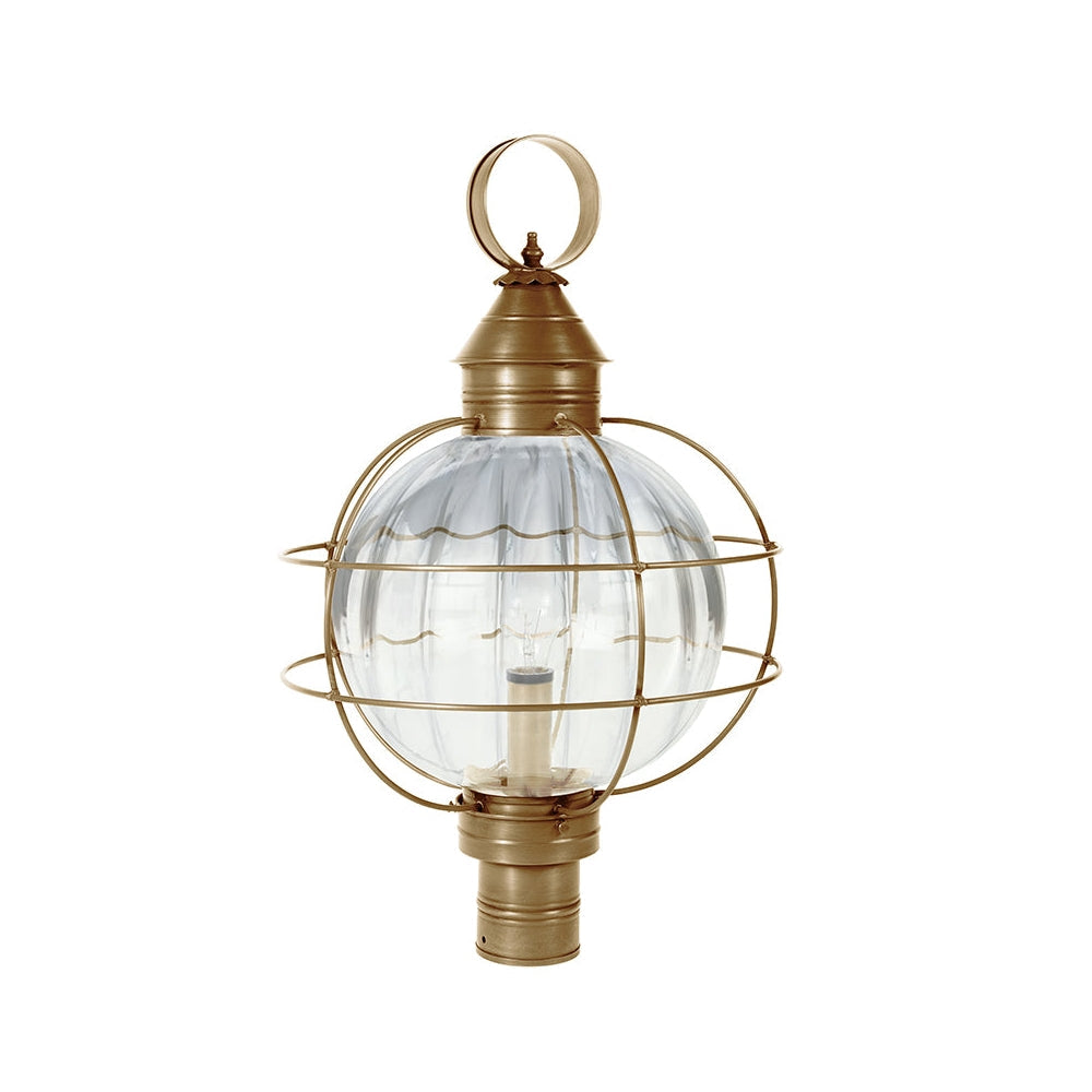 A customer favorite, our Round Onion Collection offers a new perspective to the traditional onion. Assembled with a circular glass globe, this large fixture is soldered with a double barred cage and wrapped with wire to ensure durability. Crafted with a detachable globe, they are easy to maintain. This 2853 (pictured in dark brass with (3) 60-watt candelabra sockets and optional 12" optic globe) is an X-Large caged round onion post fixture with a 3" fitter. It is available with either (1) medium base socket or (3) 60-watt candelabra sockets and plastic cream sleeves. All joints are securely soldered in place with precision and attention to detail. Three solid brass thumbscrews secure the hand blown glass globe in place ensuring easy removal for cleaning and bulb replacement.