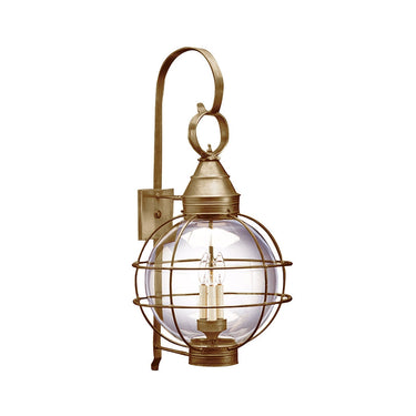 A customer favorite, our Round Onion Collection offers a new perspective to the traditional onion. Assembled with a circular glass globe, this large fixture is soldered with a double barred cage, bracket arm extension and wrapped with wire to ensure durability. Crafted with a detachable globe, they are easy to maintain. This 2861 (pictured in antique brass with (3) 60-watt candelabra sockets and a 14" clear globe) is an X-Large caged round onion wall fixture. It is available with either (1) medium base socket or (3) 60-watt candelabra sockets suspended from the top and plastic cream sleeves. All joints are securely soldered in place with precision and attention to detail. Three solid brass thumbscrews secure the hand blown glass globe in place ensuring easy removal for cleaning and bulb replacement.
