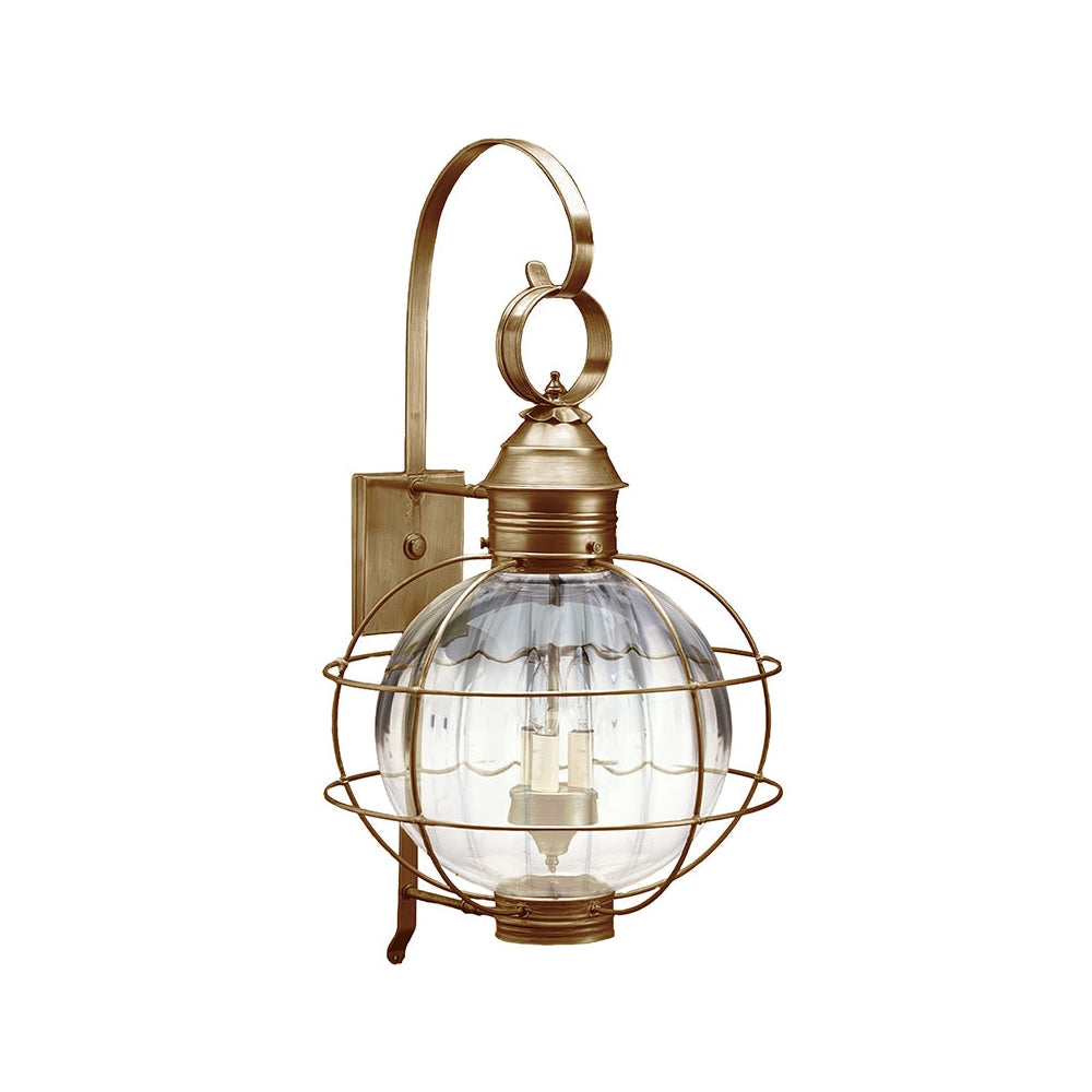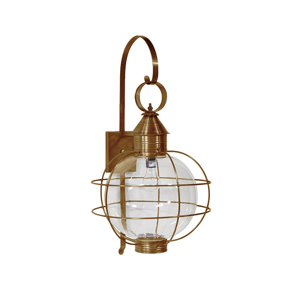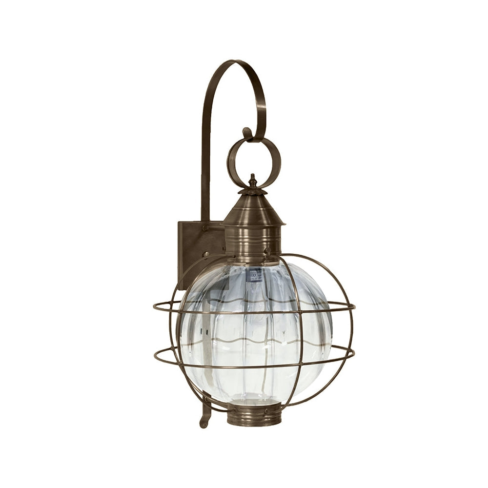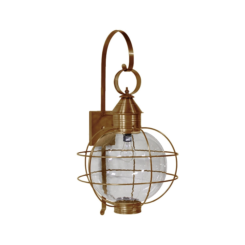 A customer favorite, our Round Onion Collection offers a new perspective to the traditional onion. Assembled with a circular glass globe, this large fixture is soldered with a double barred cage, bracket arm extension and wrapped with wire to ensure durability. Crafted with a detachable globe, they are easy to maintain. This 2851 (pictured in antique brass with (3) 60-watt candelabra sockets and a 12" clear globe) is an X-Large caged round onion wall fixture. It is available with either (1) 75-watt medium base socket or (3) 60-watt candelabra sockets suspended from the top and plastic cream sleeves. All joints are securely soldered in place with precision and attention to detail. Three solid brass thumbscrews secure the hand blown glass globe in place ensuring easy removal for cleaning and bulb replacement.