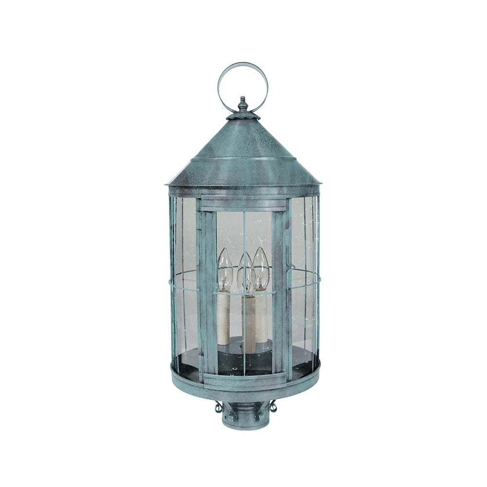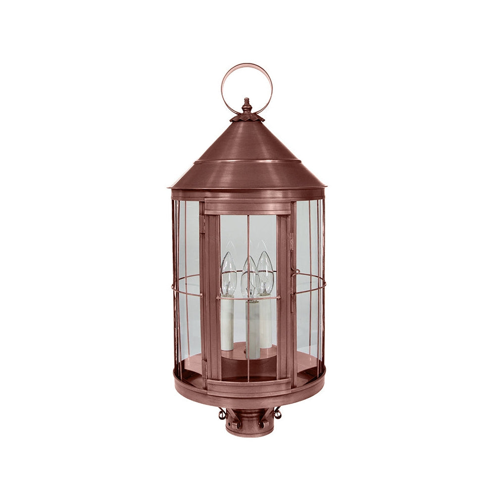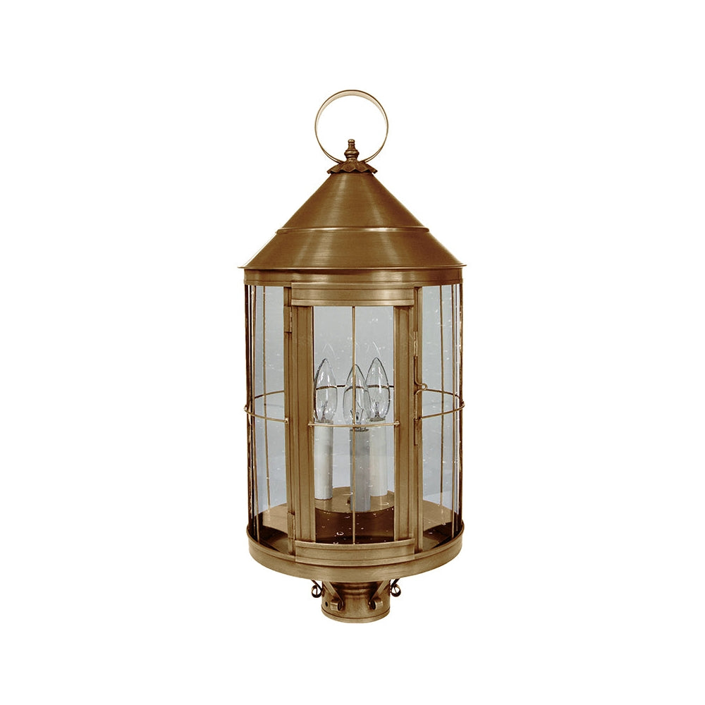 Our namesake Heal Collection lighting fixtures are a modern twist on the classic lantern. The circular shape inspires a nautical feel, making it a popular choice for coastal and waterfront homes. Delicate rounded cross rods and a cylindrical top finish the look. This 3353 (pictured in dark antique brass with (1) 75-watt medium base socket and clear chimney) is a large cone top post mount fixture with 6 glass panels and a 3" fitter. It is available with either (1) 75-watt medium base socket and chimney or (3) 60-watt candelabra sockets and plastic cream sleeves. This fixture has been constructed with a door and tabs to make the removal and installation of the glass panels effortless if they need to be washed or replaced