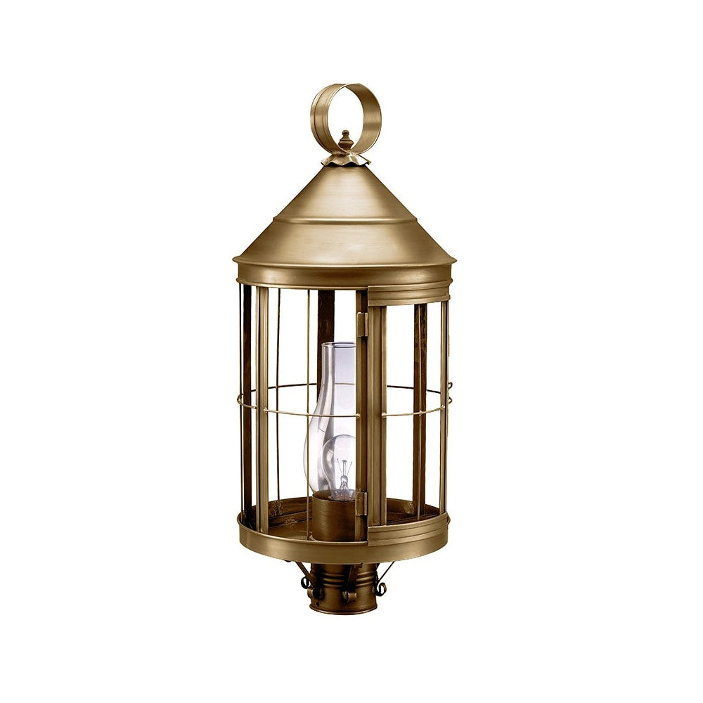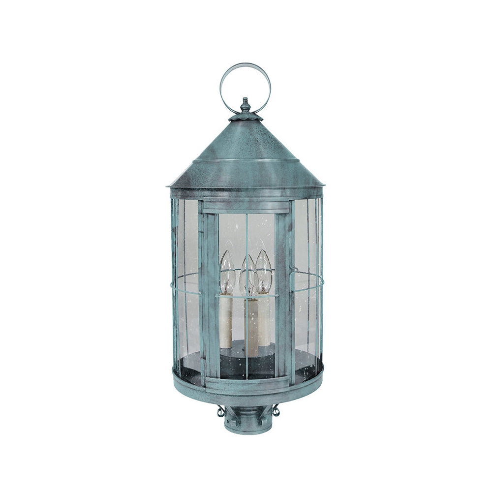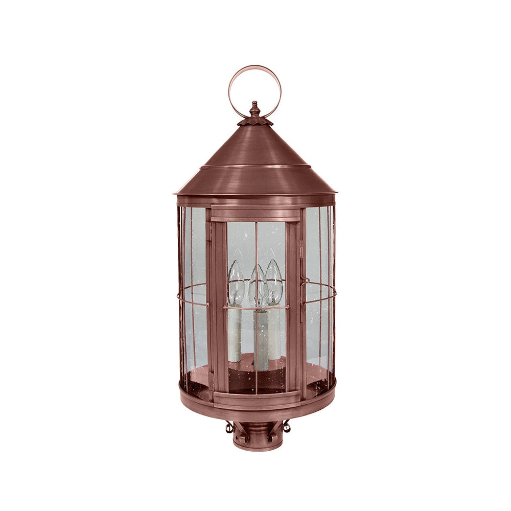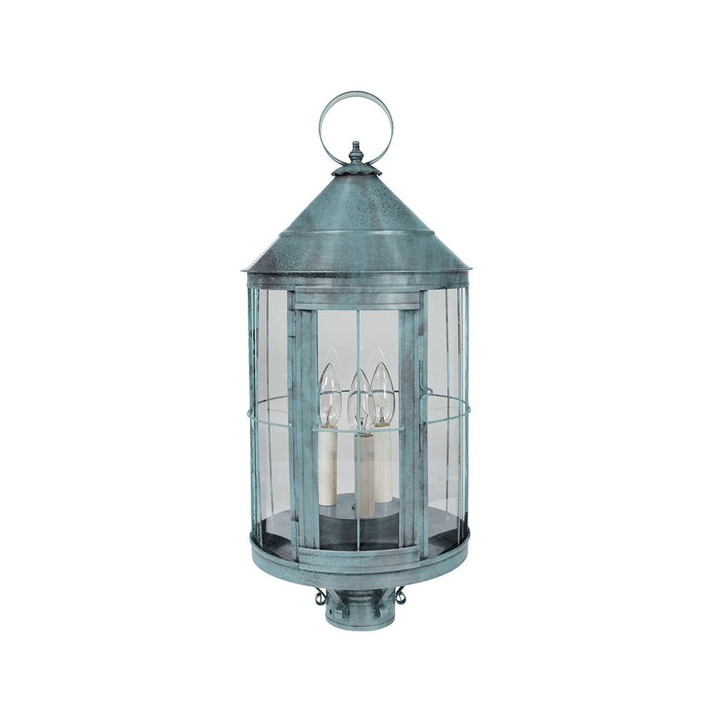 Our namesake Heal Collection lighting fixtures are a modern twist on the classic lantern. The circular shape inspires a nautical feel, making it a popular choice for coastal and waterfront homes. Delicate rounded cross rods and a cylindrical top finish the look. This 3353 (pictured in dark antique brass with (1) 75-watt medium base socket and clear chimney) is a large cone top post mount fixture with 6 glass panels and a 3" fitter. It is available with either (1) 75-watt medium base socket and chimney or (3) 60-watt candelabra sockets and plastic cream sleeves. This fixture has been constructed with a door and tabs to make the removal and installation of the glass panels effortless if they need to be washed or replaced