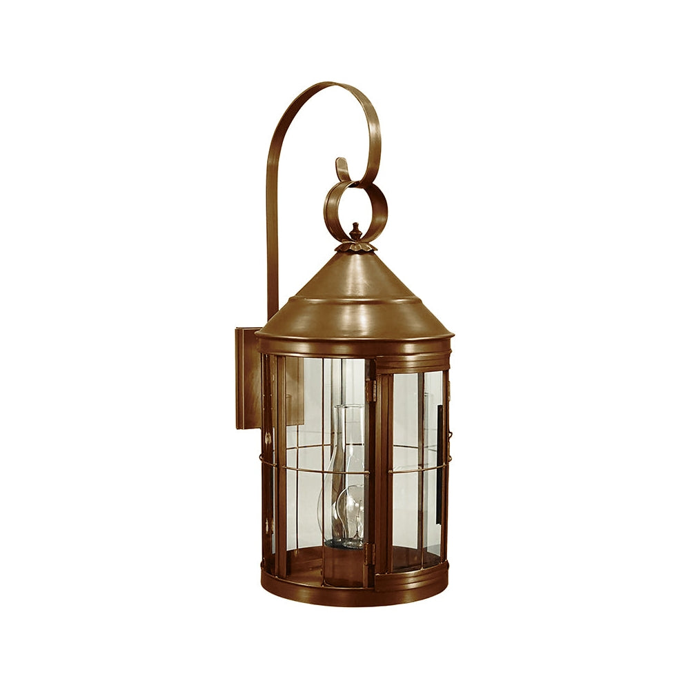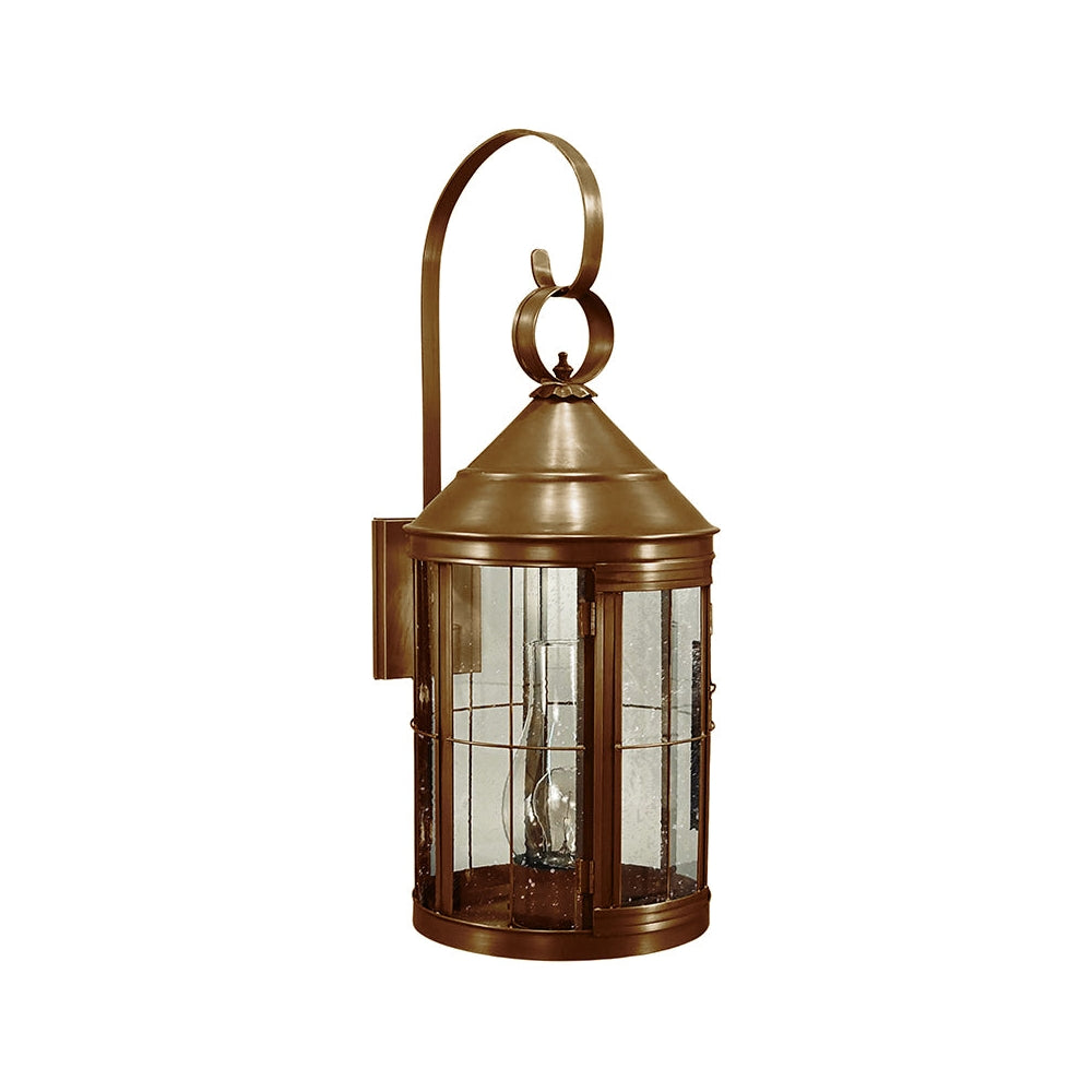 Our namesake Heal Collection lighting fixtures are a modern twist on the classic lantern. The circular shape inspires a nautical feel, making it a popular choice for coastal or waterfront homes. Delicate rounded cross rods, a cylindrical top and scroll finish the look. This 3357 (pictured in antique brass with optional clear seedy glass and (1) 75-watt medium base socket and clear chimney) is a large cone top wall mount fixture with 6 glass panels. It is available with either (1) 75-watt medium base socket and chimney or (2) 60-watt candelabra sockets suspended from the top with an open bottom and plastic cream sleeves. This fixture has been constructed with a door and tabs to make the removal and installation of the glass panels effortless if they need to be washed or replaced.