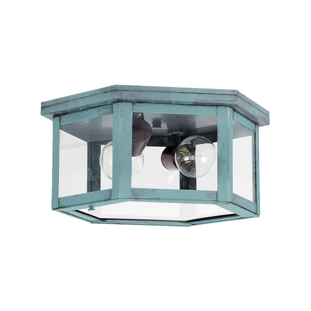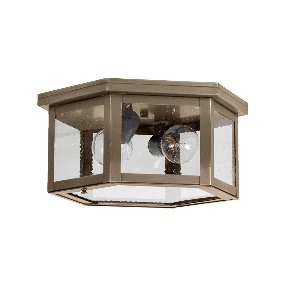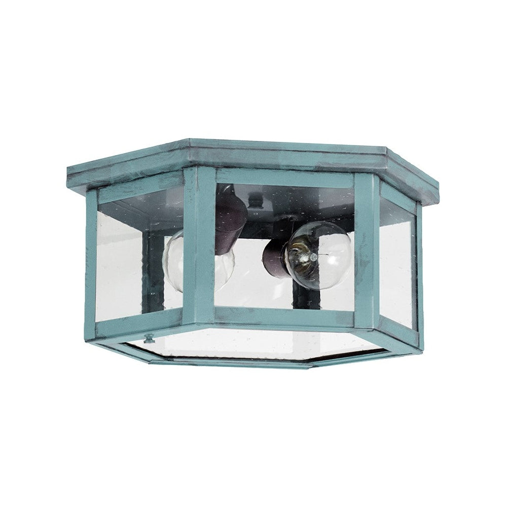 Williams Collection flush mounts are perfect for bedroooms, hallways, closets and small rooms. This 4604 (pictured in antique brass with optional seedy marine glass) is a hexagon ceiling light with 6 glass sides, 1 bottom glass door and (2) 60-watt medium base sockets. This light includes insulation and sits flush against the ceiling with a 13" x 13" mounting area. All joints are securely soldered in place with precision and attention to detail. This fixture has been constructed with a bottom door and tabs to make the removal and installation of glass panels effortless if they need to be washed or replaced.