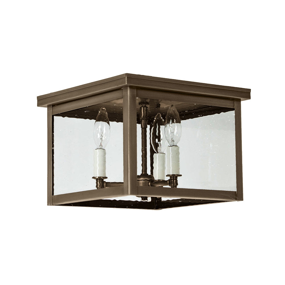 Williams Collection flush mounts are perfect for bedroooms, hallways, closets and small rooms. This 4904 (pictured in antique brass with clear glass and (3) candelabra sockets) is a ceiling flush mount fixture with 4 glass sides and 1 bottom glass door. It is available with either (2) 75-watt medium base sockets or (3) 60-watt candelabra sockets. This light includes insulation and sits flush against the ceiling with an 9" x 9" mounting area. All joints are securely soldered in place with precision and attention to detail. This fixture has been constructed with a bottom door and tabs to make the removal and installation of glass panels effortless if they need to be washed or replaced.