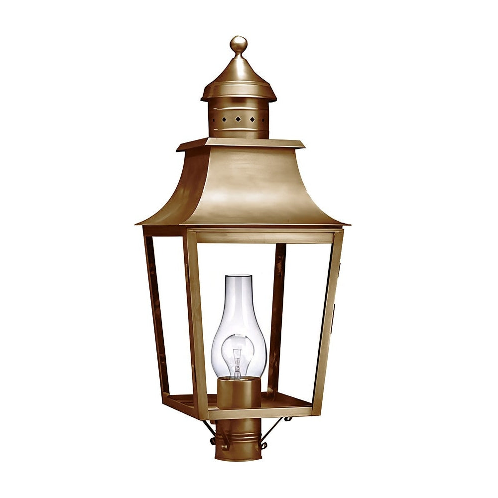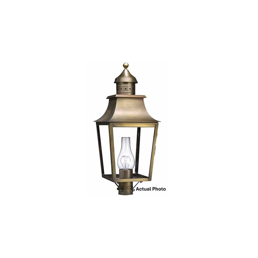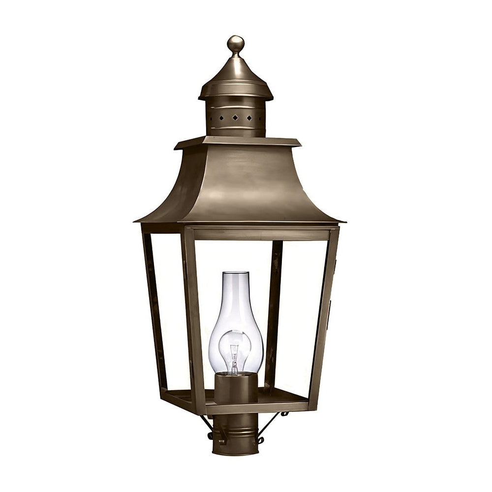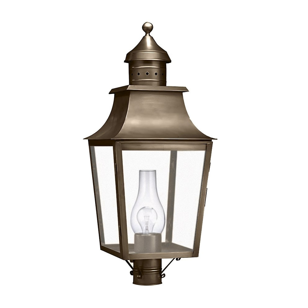 Our Sharon Collection has larger fixtures with elegant curved solid tops and diamond shaped accents in the top finial. This 5553 (pictured in dark antique brass with (1) 75-watt medium base socket and clear chimney) is a square pagoda post mount lantern with a 3" fitter. This fixture is available with either (1) 75-watt medium base socket and chimney or (3) 60-watt candelabra sockets and plastic cream sleeves. This fixture has been constructed with tabs to make the removal and installation of the glass panels effortless if they need to be washed or replaced.