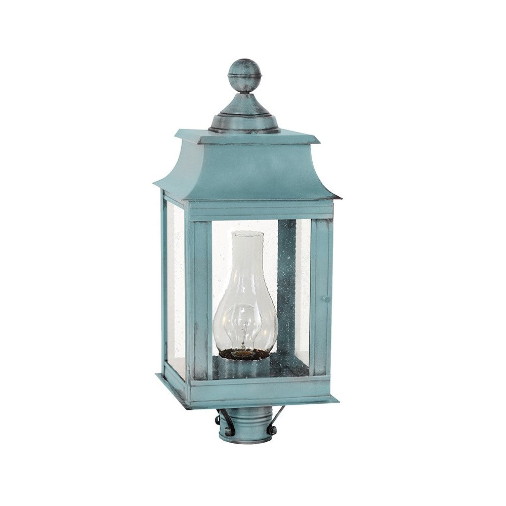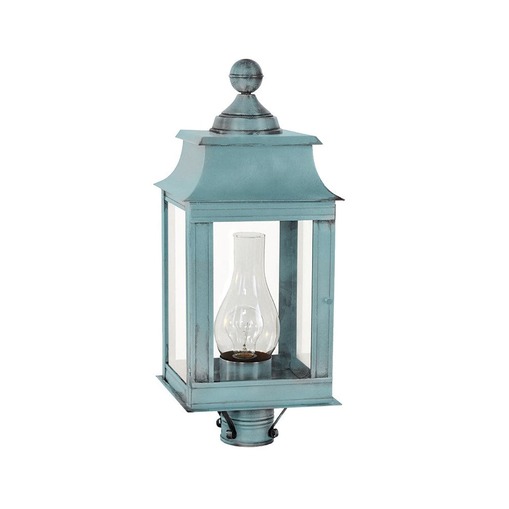 Coordinate all your exterior and interior needs with our Concord Post Collection inspired by eighteenth century colonial fixtures. Choose the style that best suits your needs. This 5633 (pictured in antique brass with (1) 75-watt medium base socket and chimney) is a medium square pagoda post mount fixture with a 3" fitter. It is available with either (1) 75-watt medium base socket and chimney or (3) 60-watt candelabra sockets and plastic cream sleeves. All joints are securely soldered in place with precision and attention to detail. This fixture has been constructed with a door and tabs to make the removal and installation of the glass panels effortless if they need to be washed or replaced.