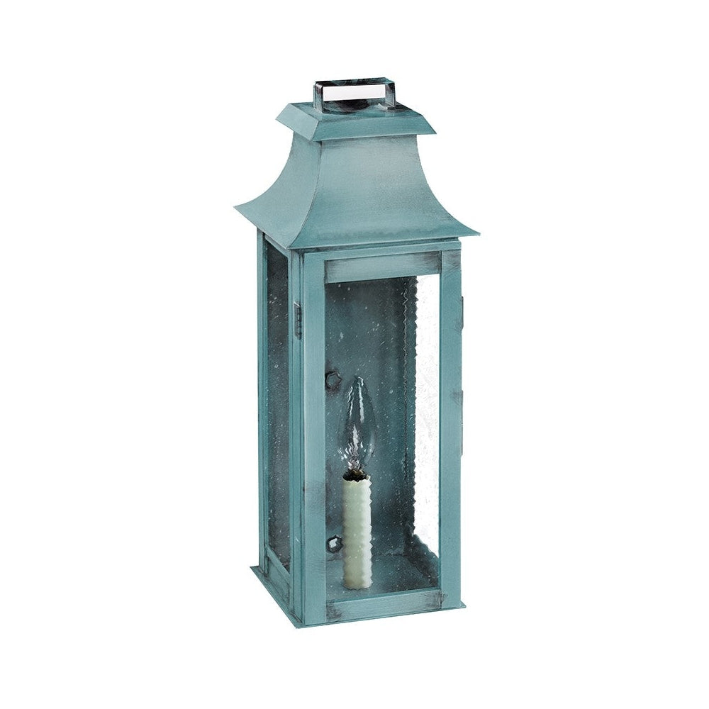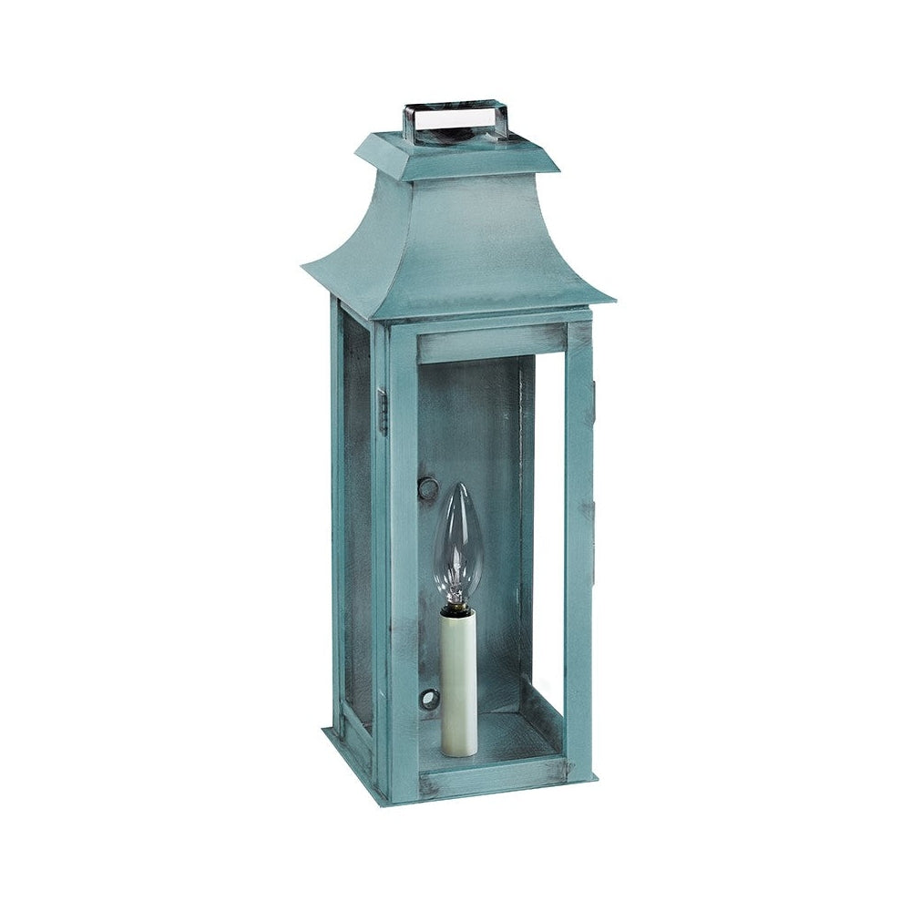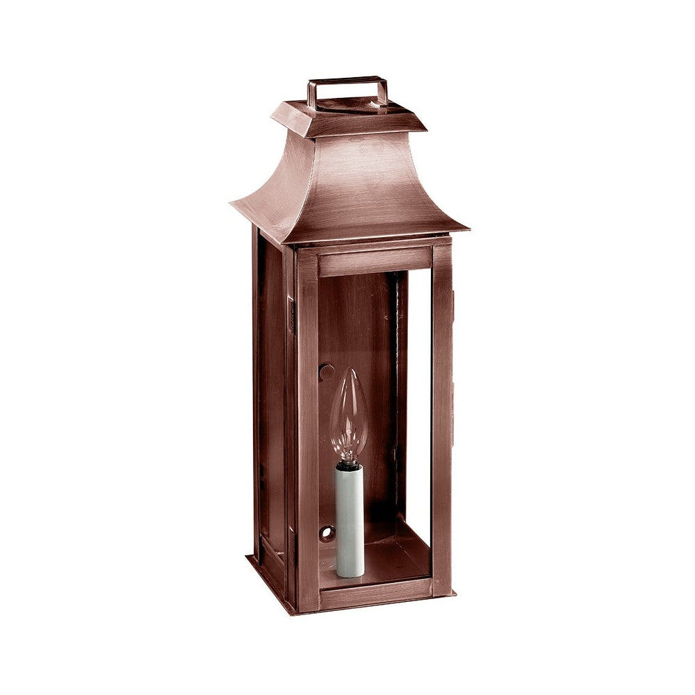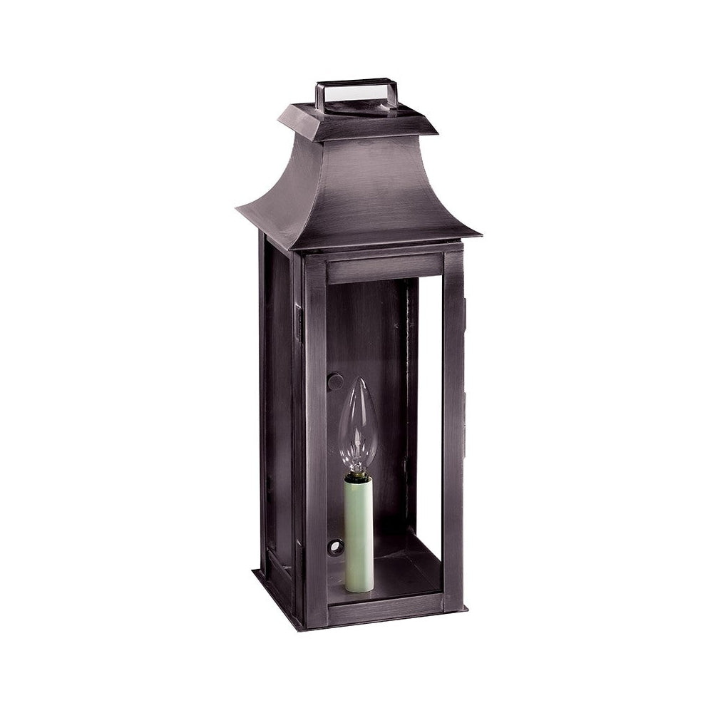 Our Concord Wall Collection is inspired by eighteenth century colonial fixtures and is made with a solid bottom and door on the front. They can also be made with an open bottom with candelabra sockets extending off the back. Choose the style that best suits your needs. This 5621 (pictured in antique copper with (1) 60-watt candelabra socket) is a medium square pagoda wall fixture. It is available with either (1) 75-watt medium base socket and chimney or (1) 60-watt candelabra socket and plastic cream sleeve. All joints are securely soldered in place with precision and attention to detail. This fixture has been constructed with tabs to make the removal and installation of the glass panels effortless if they need to be washed or replaced.