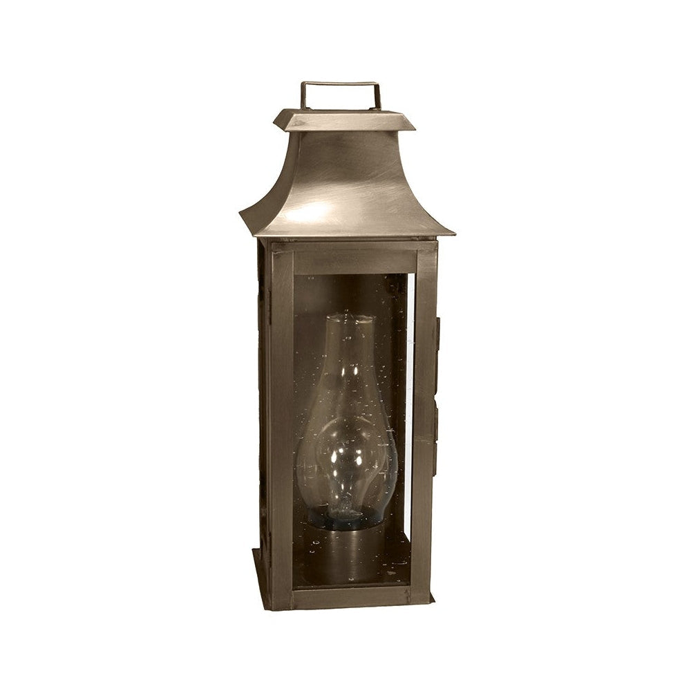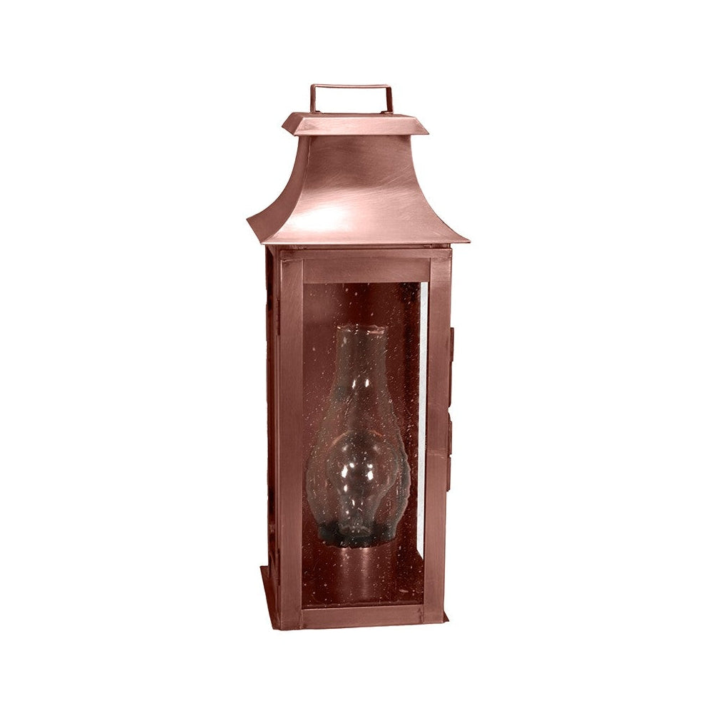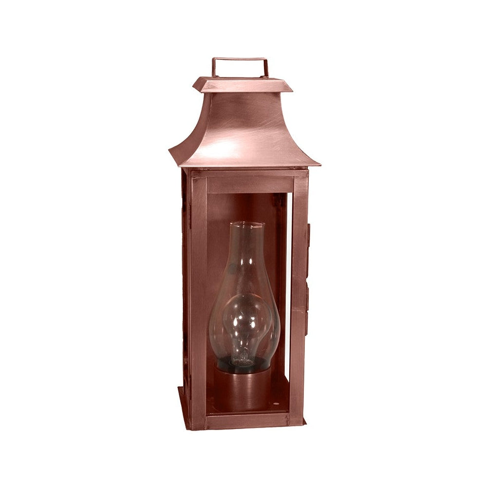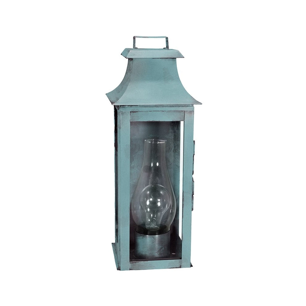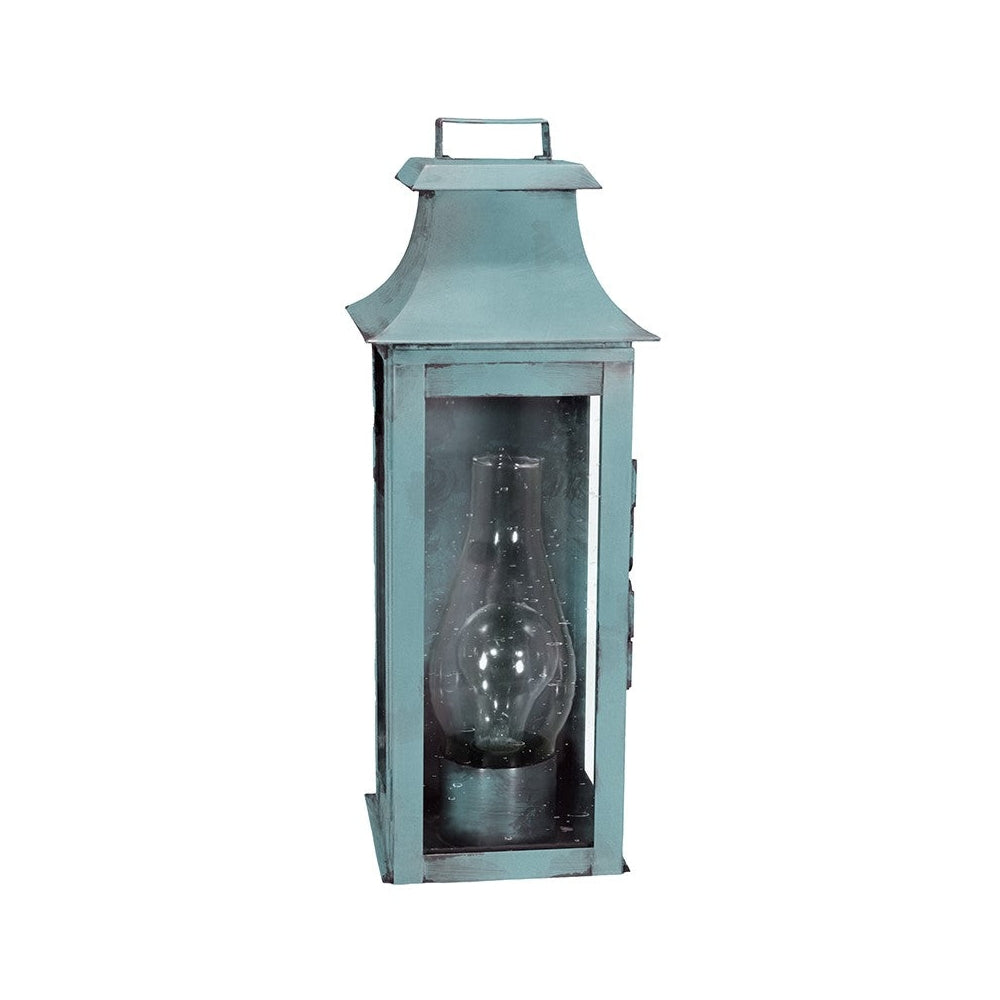 Our Concord Wall Collection is inspired by eighteenth century colonial fixtures and is made with a solid bottom and door on the front. They can also be made with an open bottom with candelabra sockets extending off the back. Choose the style that best suits your needs. This 5621 (pictured in antique copper with (1) 60-watt candelabra socket) is a medium square pagoda wall fixture. It is available with either (1) 75-watt medium base socket and chimney or (1) 60-watt candelabra socket and plastic cream sleeve. All joints are securely soldered in place with precision and attention to detail. This fixture has been constructed with tabs to make the removal and installation of the glass panels effortless if they need to be washed or replaced.
