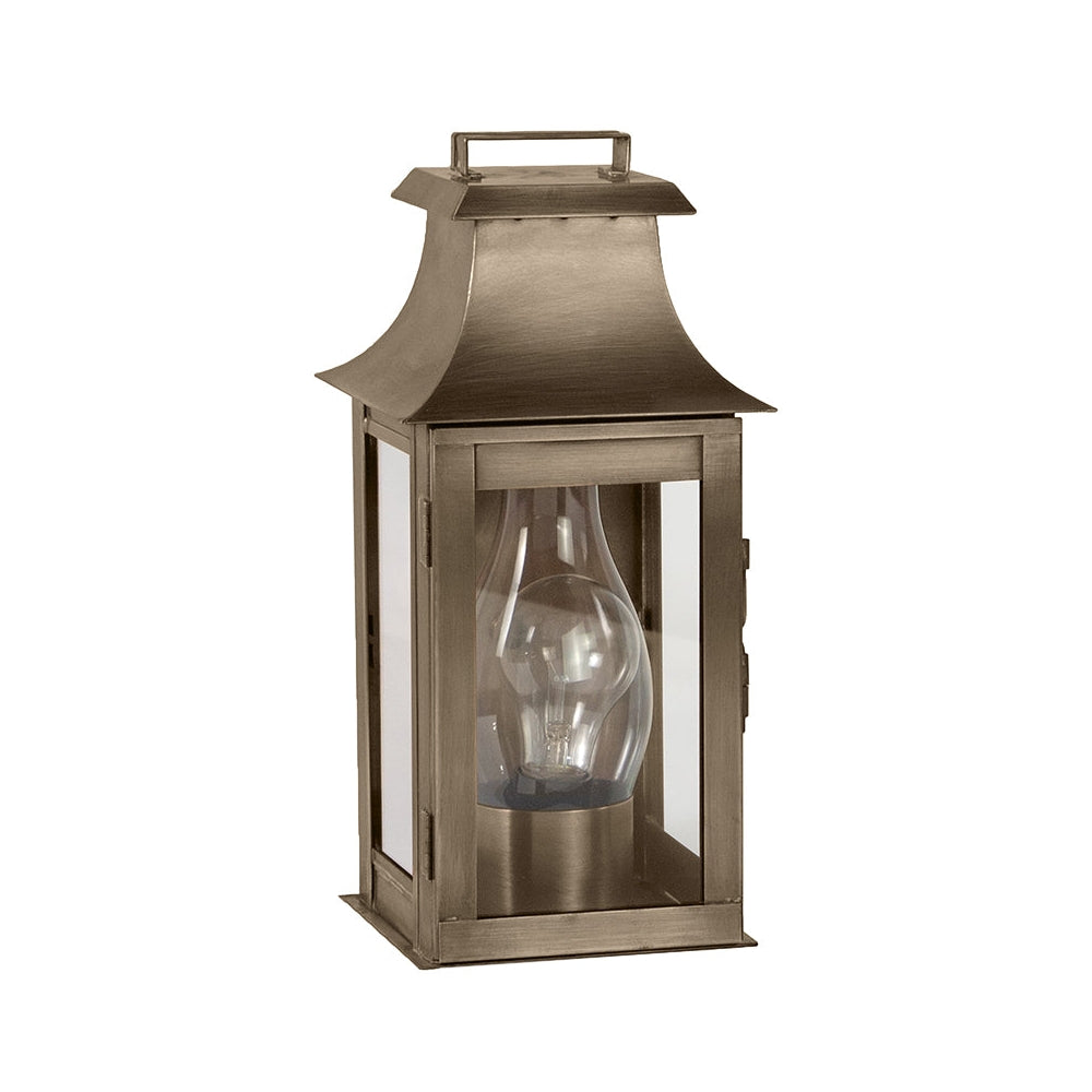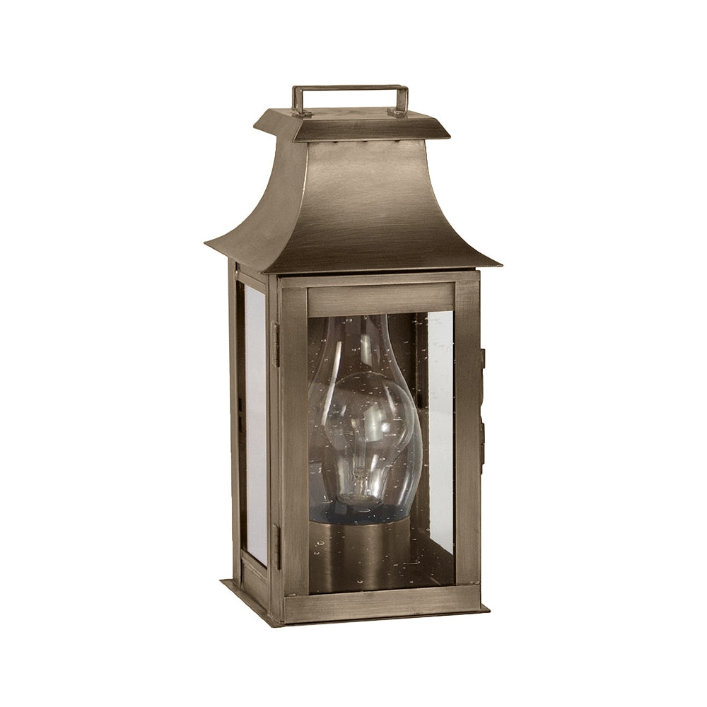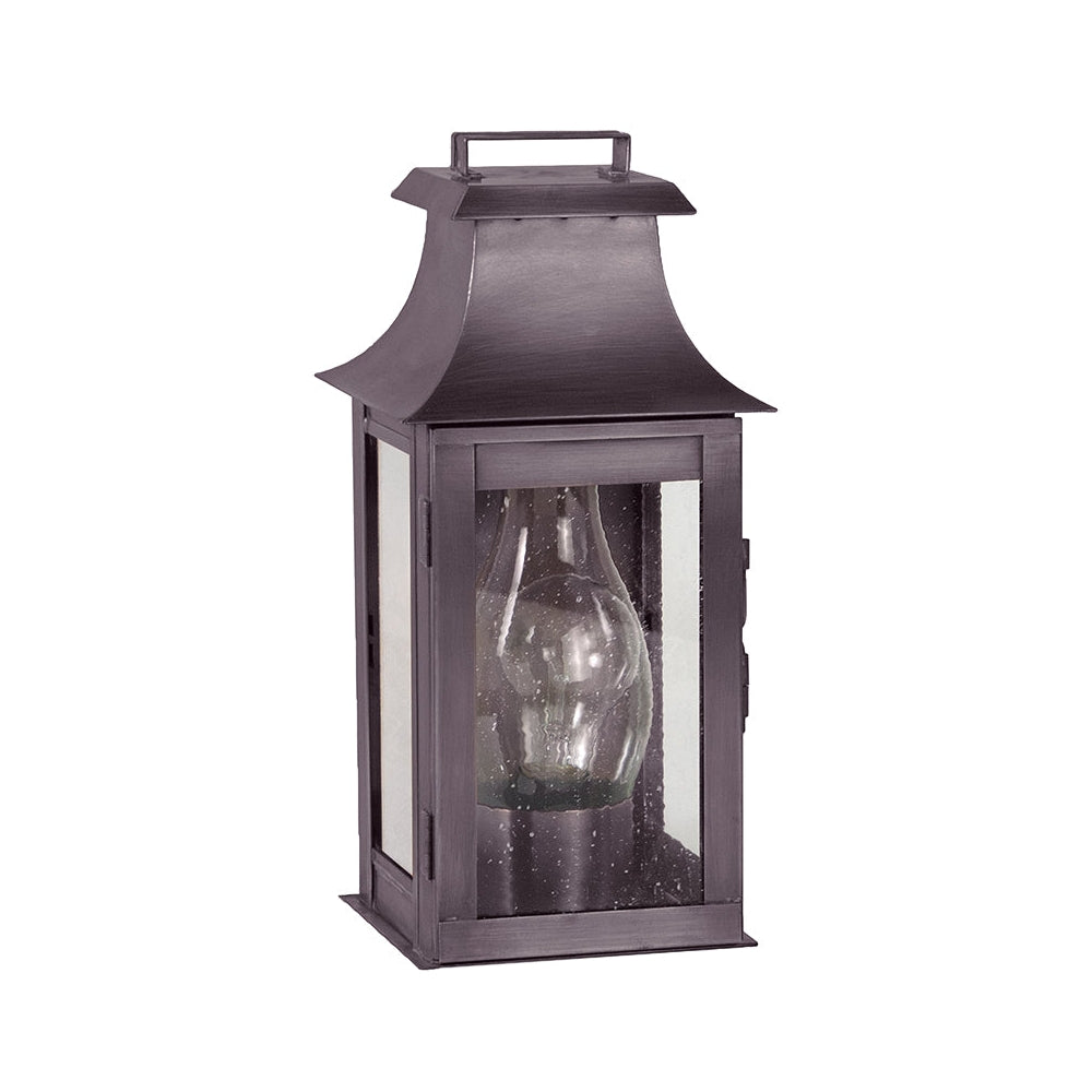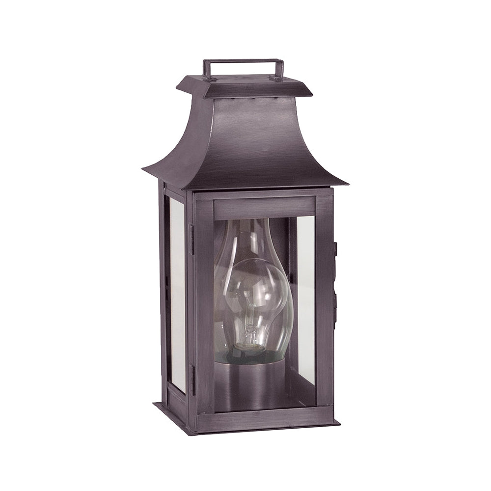Our Concord Wall Collection is inspired by eighteenth century colonial fixtures and is made with a solid bottom and door on the front. This Quick Ship* 5611-QS (pictured in dark brass) is a small square pagoda wall mount fixture (1) 60-watt candelabra socket. All joints are securely soldered in place with precision and attention to detail. This fixture has been constructed with tabs to make the removal and installation of the glass panels effortless if they need to be washed or replaced. This Quick Ship item ships within 5 business days after receipt of order. View and order our regular 5611 for more glass and finish options.