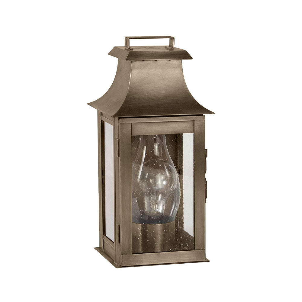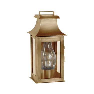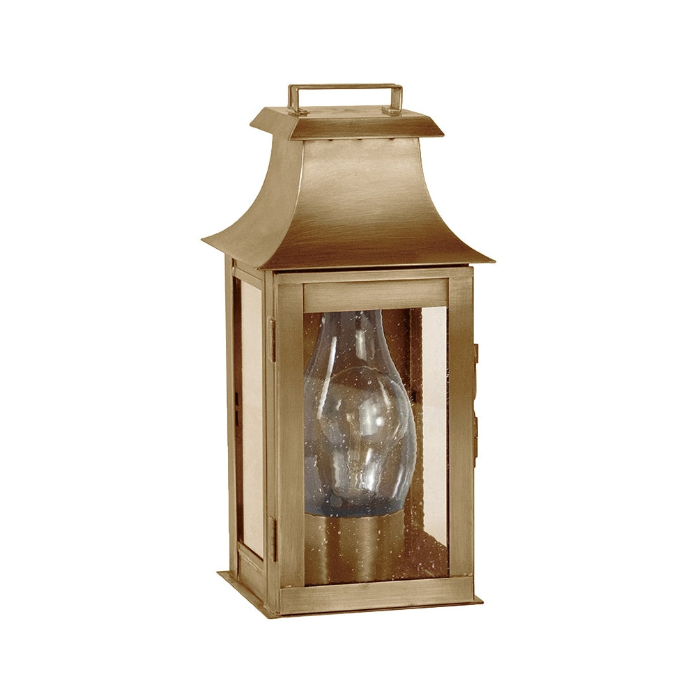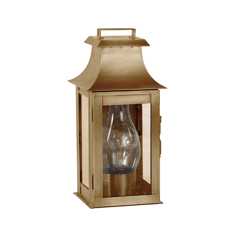 Our Concord Wall Collection is inspired by eighteenth century colonial fixtures and is made with a solid bottom and door on the front. This Quick Ship* 5611-QS (pictured in dark brass) is a small square pagoda wall mount fixture (1) 60-watt candelabra socket. All joints are securely soldered in place with precision and attention to detail. This fixture has been constructed with tabs to make the removal and installation of the glass panels effortless if they need to be washed or replaced. This Quick Ship item ships within 5 business days after receipt of order. View and order our regular 5611 for more glass and finish options.