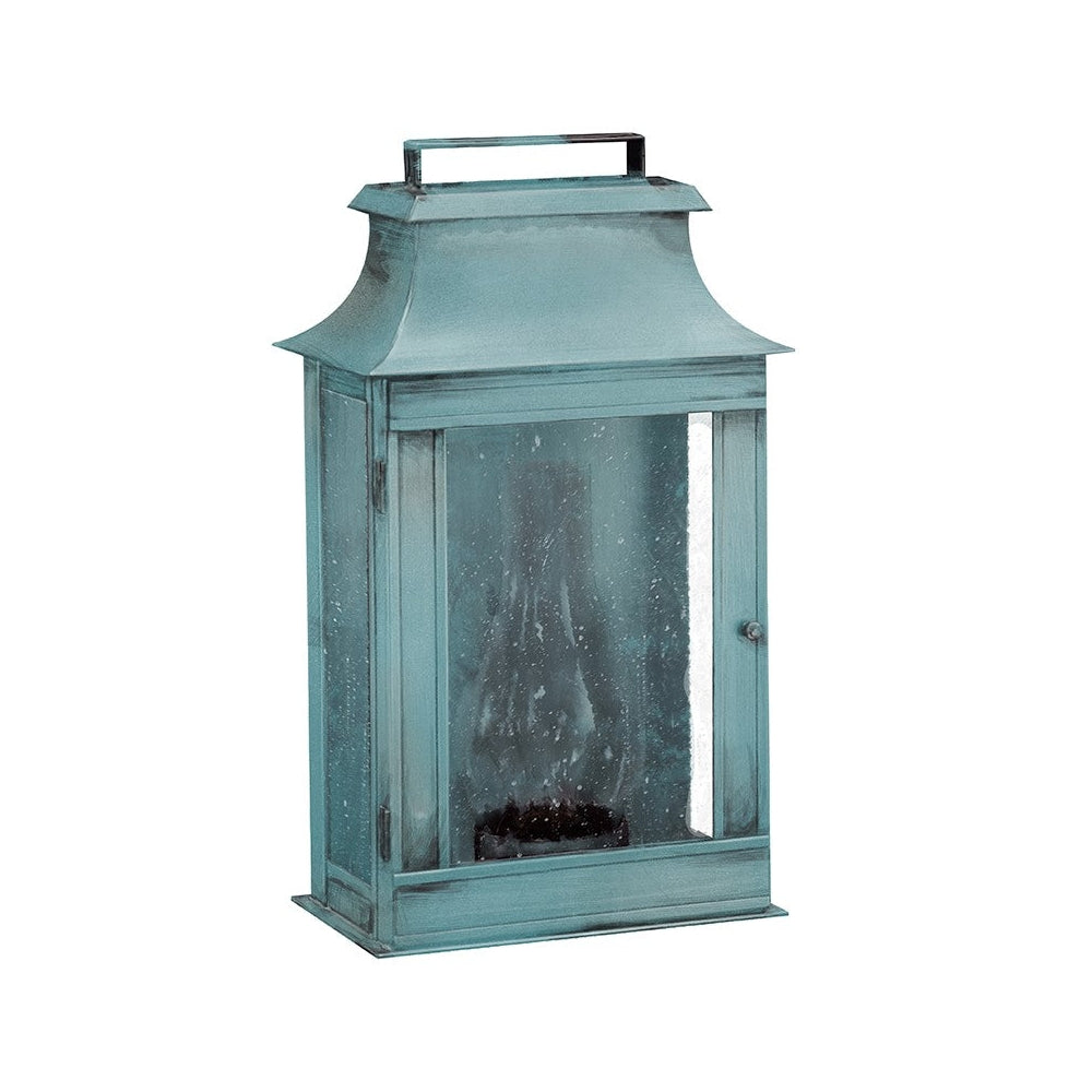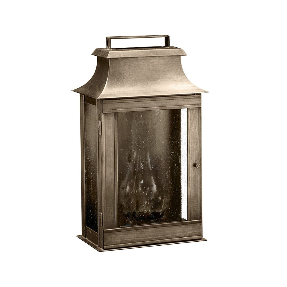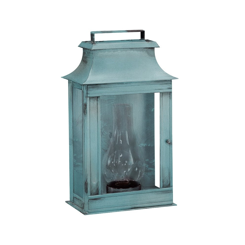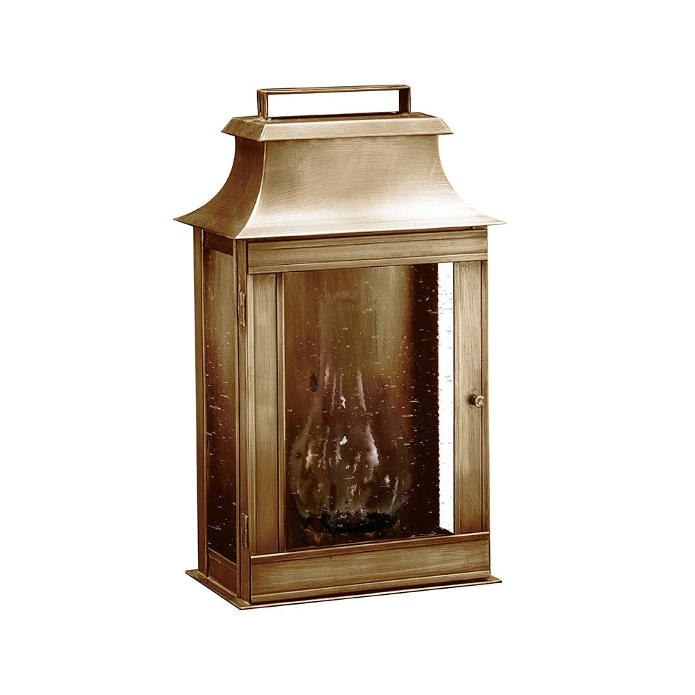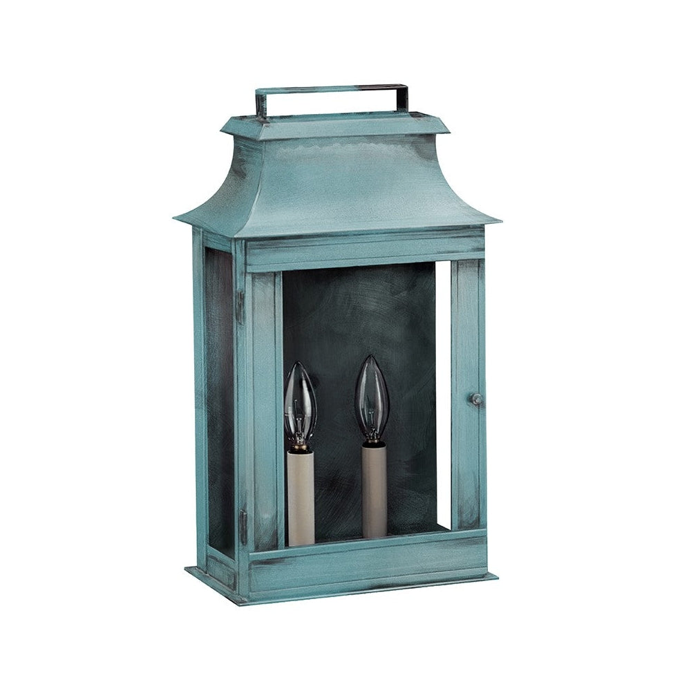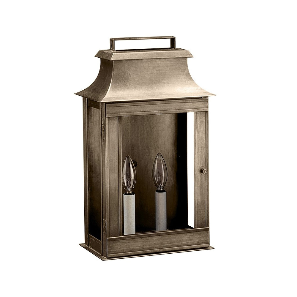 Our Concord Wall Collection is inspired by eighteenth century colonial fixtures and is made with a solid bottom and door on the front. They can also be made with an open bottom with candelabra sockets extending off the back. Choose the style that best suits your needs. This 5721 (pictured in antique brass) is a medium wide pagoda wall fixture. It is available with either (1) 75-watt medium base socket and chimney or (2) 60-watt candelabra sockets and plastic cream sleeves. All joints are securely soldered in place with precision and attention to detail. This fixture has been constructed with tabs to make the removal and installation of the glass panels effortless if they need to be washed or replaced. See our 5721R for this same light with a raised top or our 5751 for a larger version.