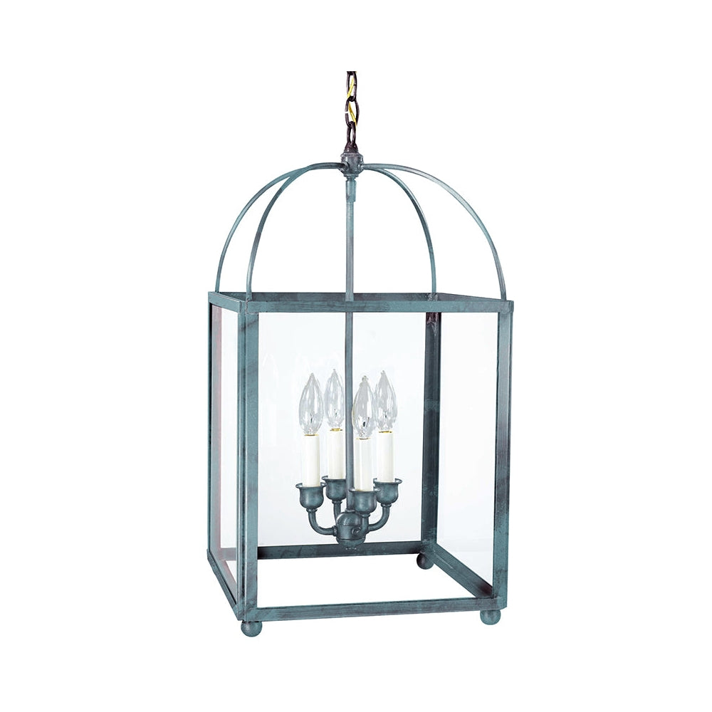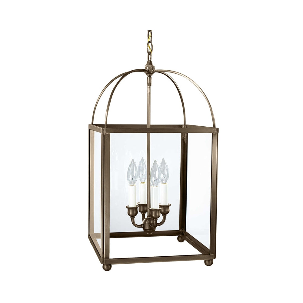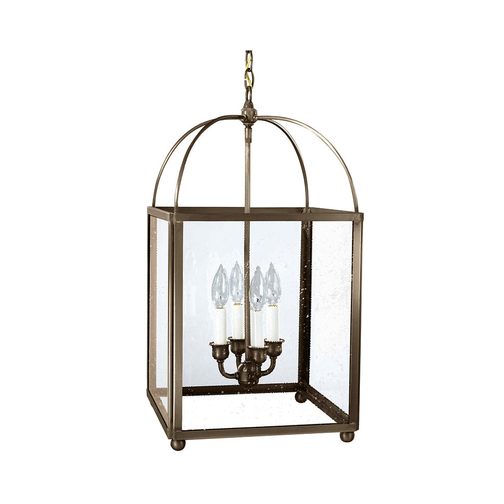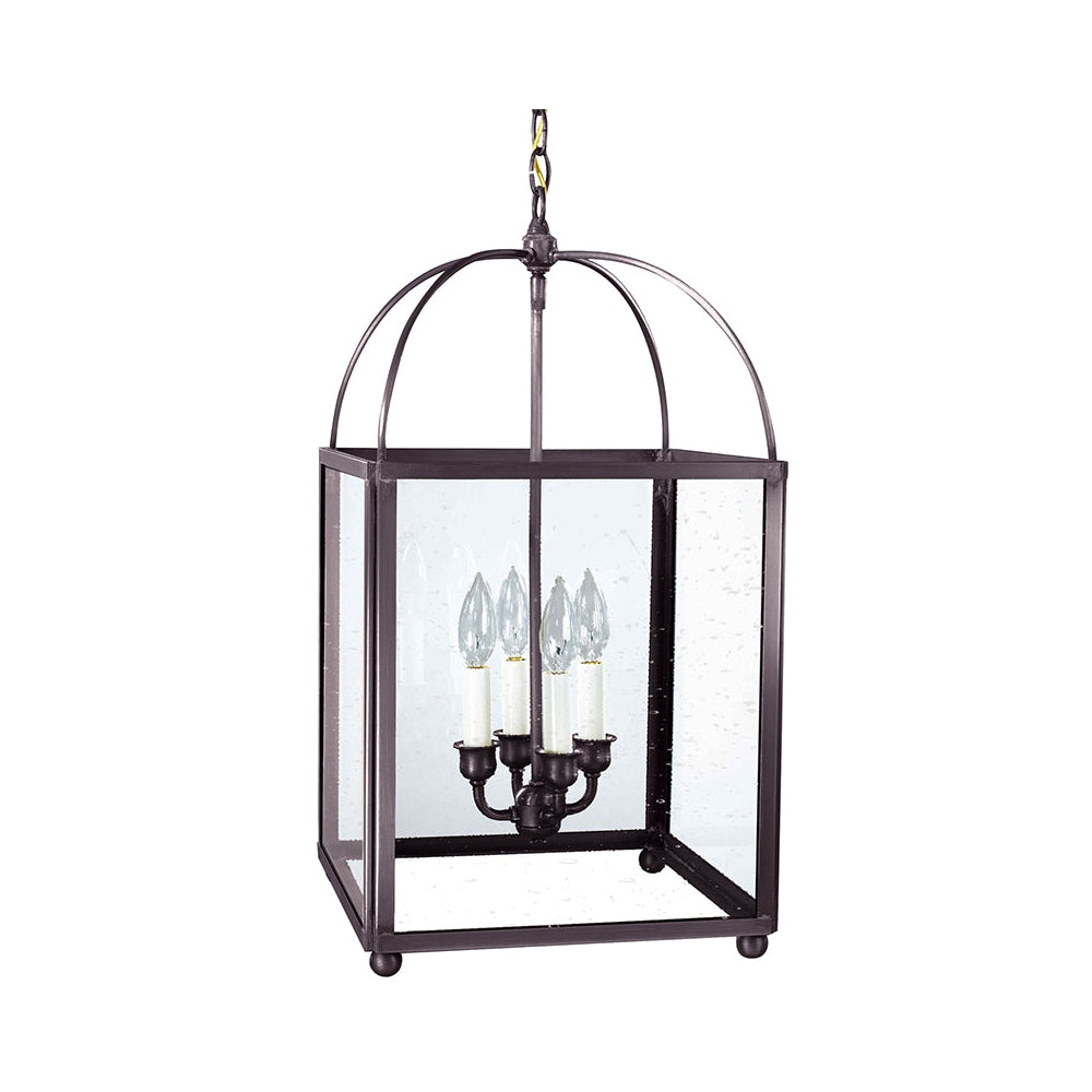 Our new Hanging Lantern brings a welcome light to your entry way or dining room. The graceful arched tops of our 68 series flow seamlessly into functional square bases reminiscent of traditional lanterns. A 6832 arrives with standard paper cream sleeves, 36" chain and 5" ceiling canopy. This 6832 (pictured in antique brass) has (4) 60-watt candelabra sockets and open bottom for convenient bulb changing. Additional chain, paper drip, bees wax and brass metal sleeves are optional. This fixture has been constructed with tabs to make the removal and installation of the glass panels effortless if they need to be washed or replaced. See 6812 for a smaller version of this same light. Note: If ordered in copper finish, the top ring, center hub and pipe, bottom balls and candelabra cluster will be in brass.