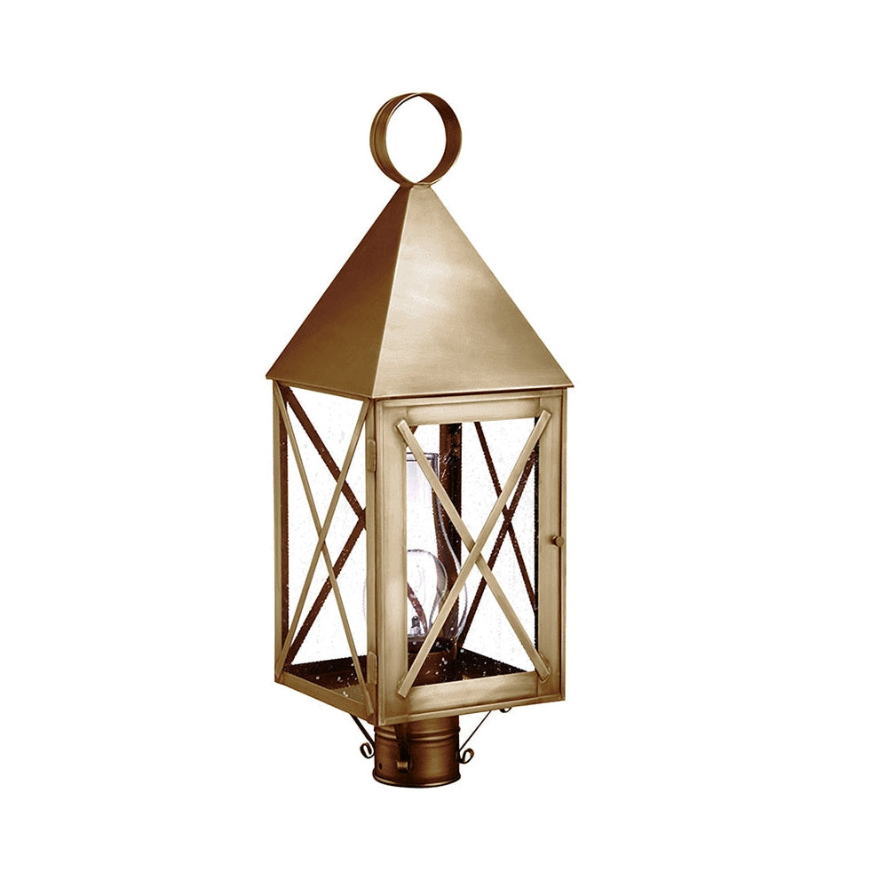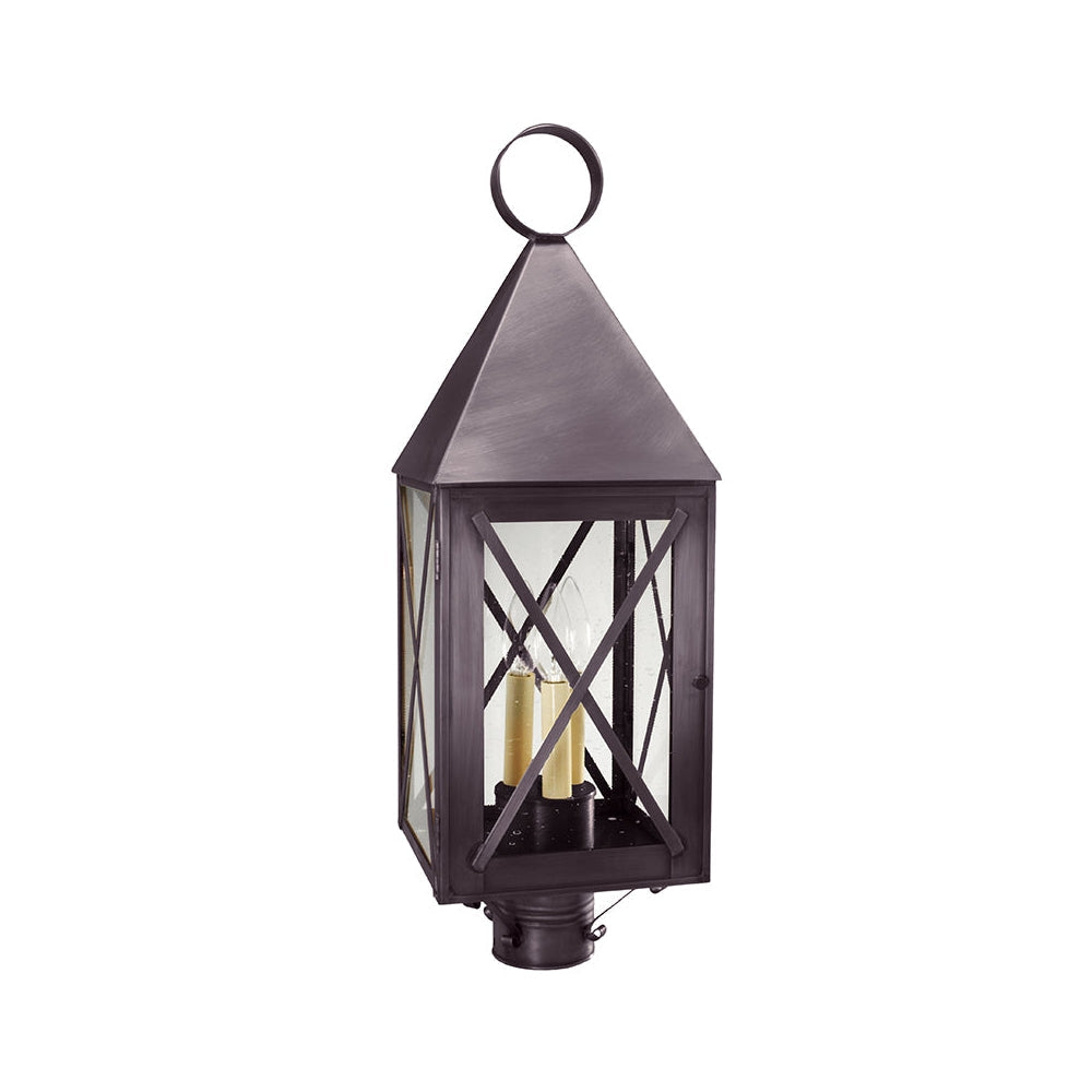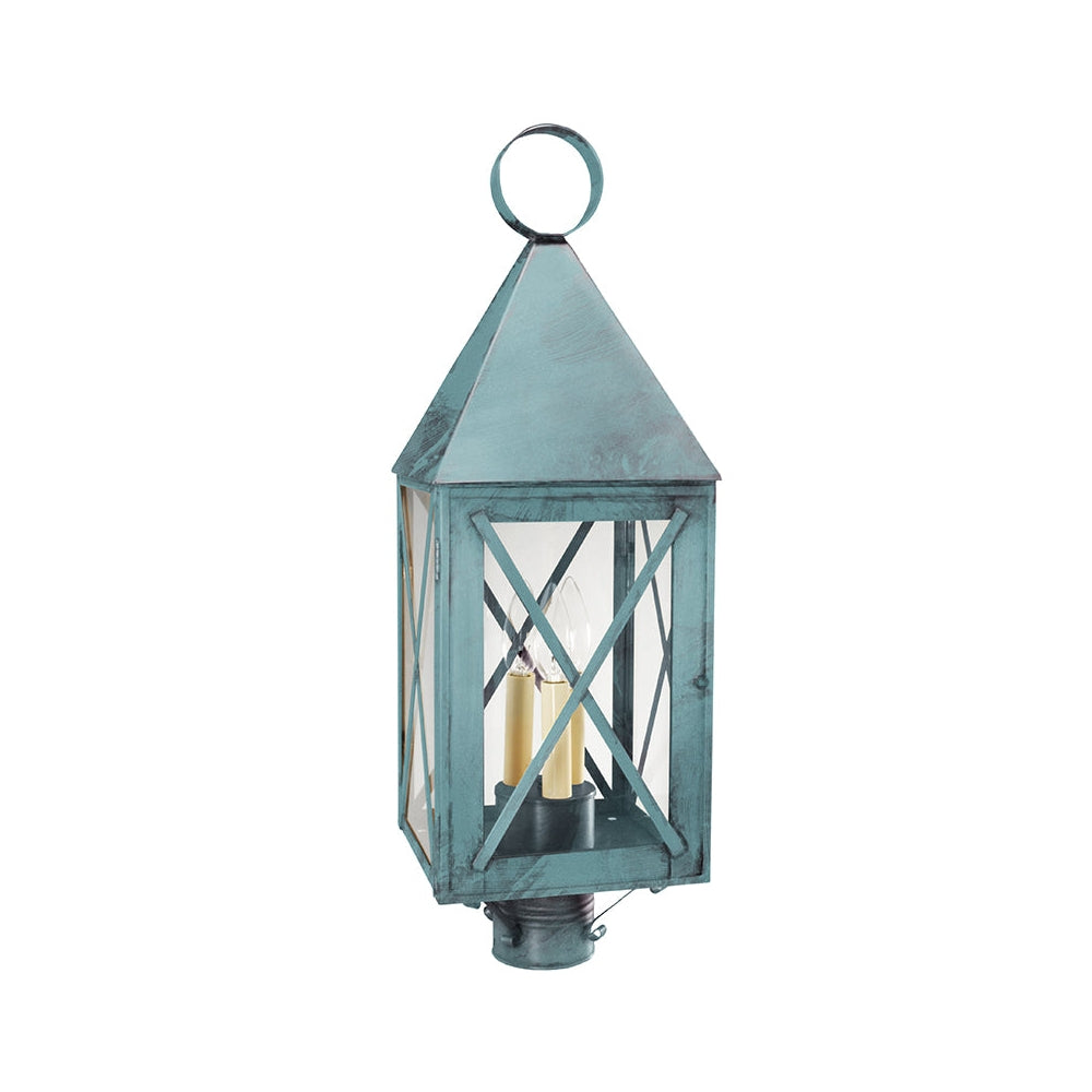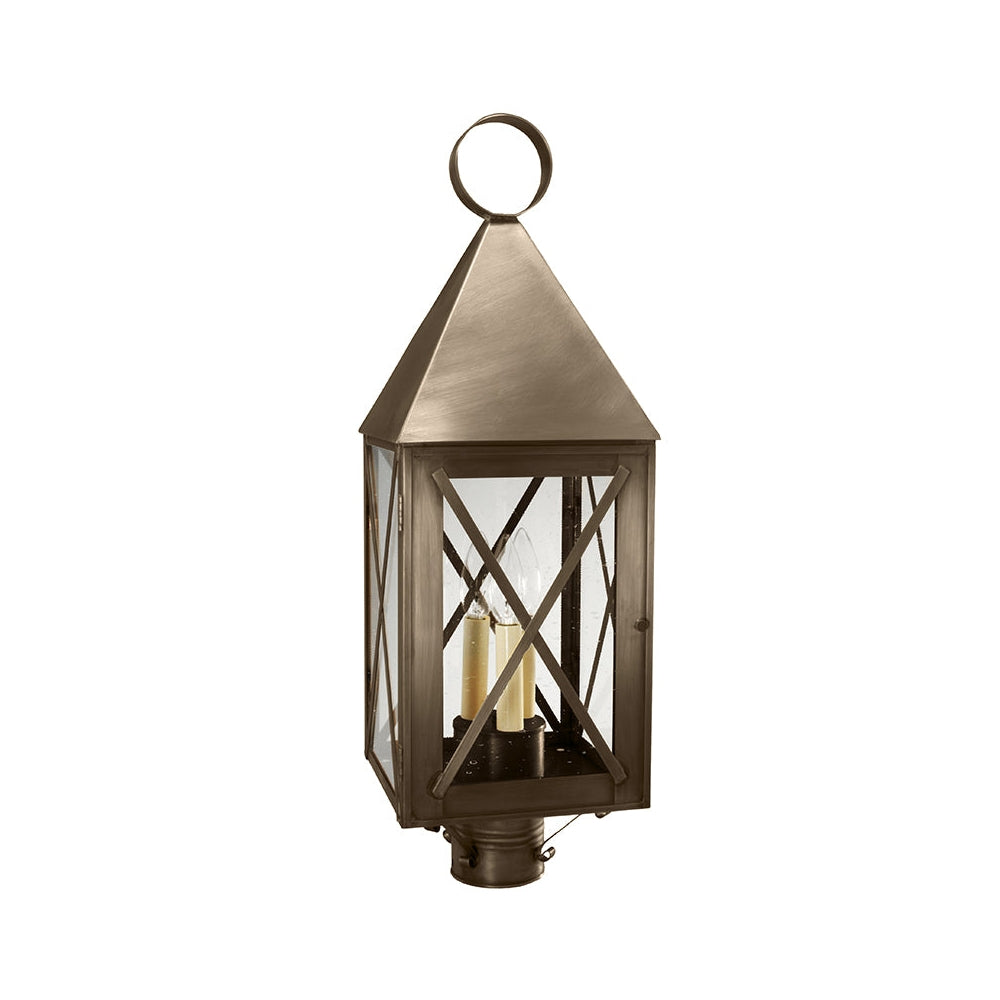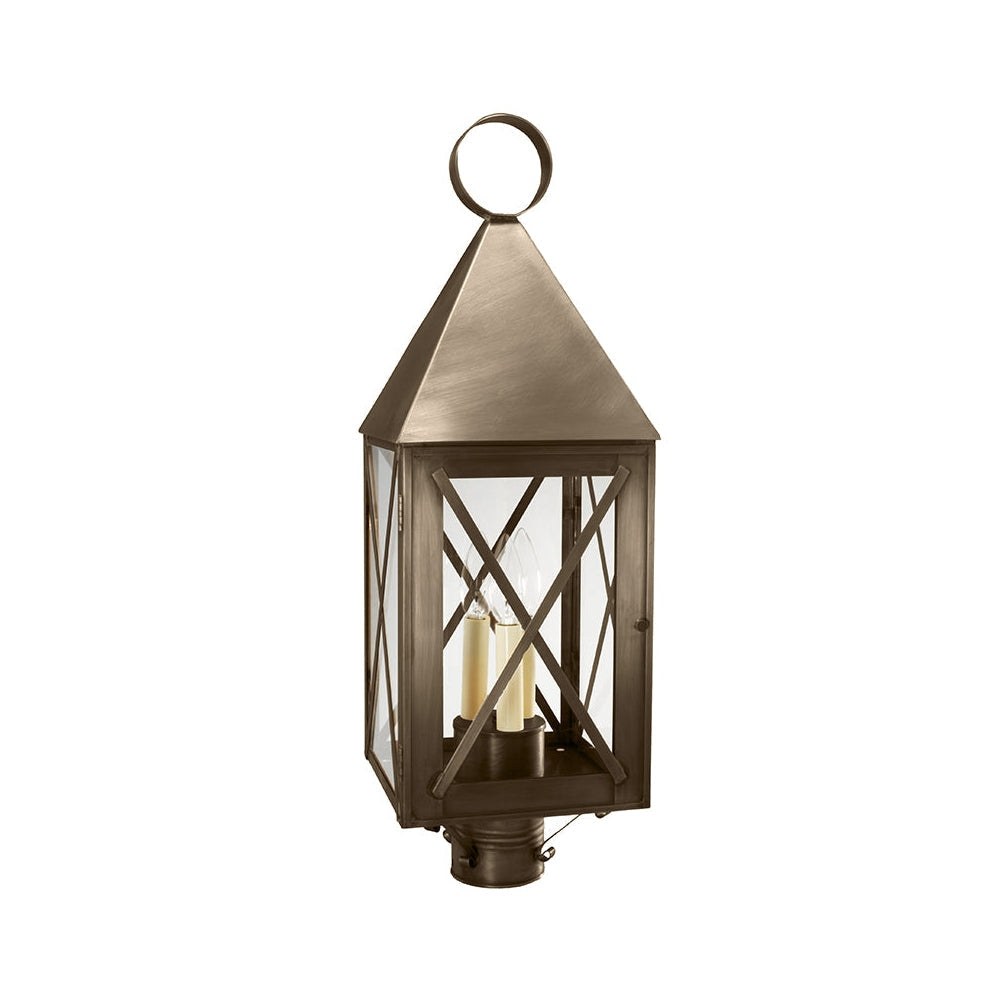 Solid pyramid top York Collection offers either series 70 with X-bars or series 71 with H-bars. This 7053 (pictured in antique brass with (1) 75-watt medium base socekt and chimney) is a square post mount fixture with X-bars and a 3" fitter. It is available with either (1) 75-watt medium base socket and chimney or (3) 60-watt candelabra sockets and standard plastic cream sleeves. All joints are securely soldered in place with precision and attention to detail. This fixture has been constructed with a door and tabs to make the removal and installation of the glass panels effortless if they need to be washed or replaced.
