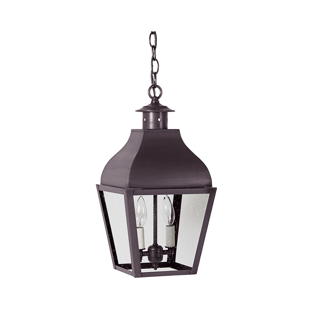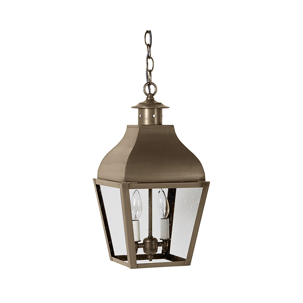 Our stylish exterior Stanfield Collection has solid metalwork softened by it's refined look. The robust feel of these lights create a sense of safety and security when they are illuminated. This 7632 (pictured in antique brass with (2) 60-watt candelabra sockets and optional clear seedy glass) is a stylish medium hanging fixture with a uniquely shaped top and open bottom, 12" chain and 5" canopy. This fixture is available with either (1) 75-watt medium base socket from the top or (2) 60-watt candelabra sockets suspended from the top and plastic cream sleeves. This fixture has been constructed with tabs to make the removal and installation of the glass panels effortless if they need to be washed or replaced. Other sizes are 7642: 13"W x 13"D x 24"H or 7652: 15:W x 15:D x 30"H (not shown). This light also available as a post light 7633: 9"W x 9"D x 21"H (not shown).