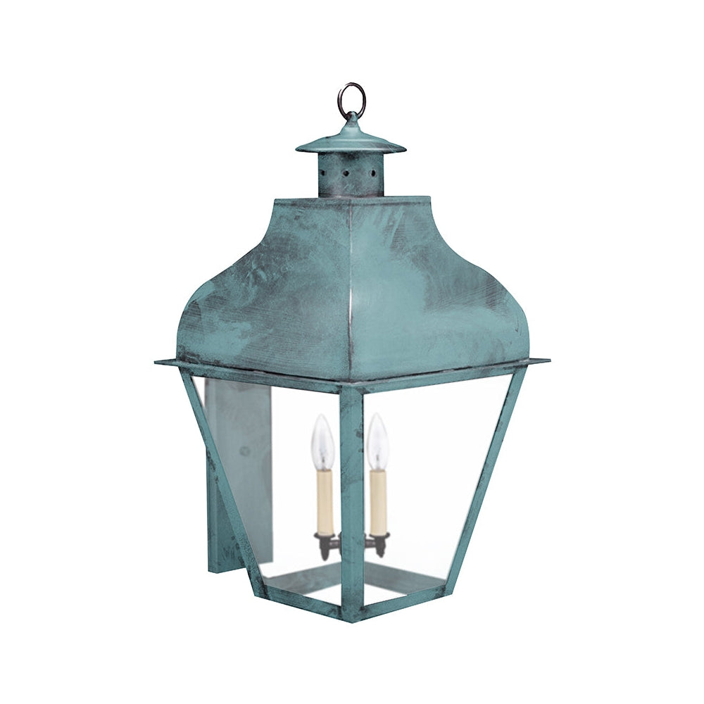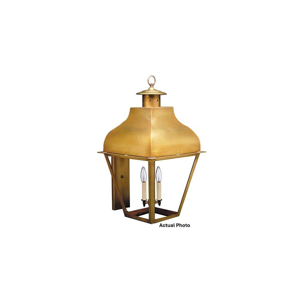 Our stylish exterior Stanfield Collection has solid metalwork softened by its refined look. The robust feel of these lights create a sense of safety and security when they are illuminated. This 7651 (pictured in antique brass with (3) 60-watt candelabra sockets) is a large wall fixture with a uniquely shaped top and open bottom. This fixture is available with either (1) 75-watt medium base socket and chimney or (3) 60-watt candelabra sockets suspended from the top and plastic cream sleeves. This fixture has been constructed with tabs to make the removal and installation of the glass panels effortless if they need to be washed or replaced. This light also available as a hanging fixture 7652: 15"W x 15"D x 30"H (not shown). See our 7611, 7631 and 7641: CIM or LT2 13"W x 15"D x 24"H (not shown) for smaller versions of this same light.