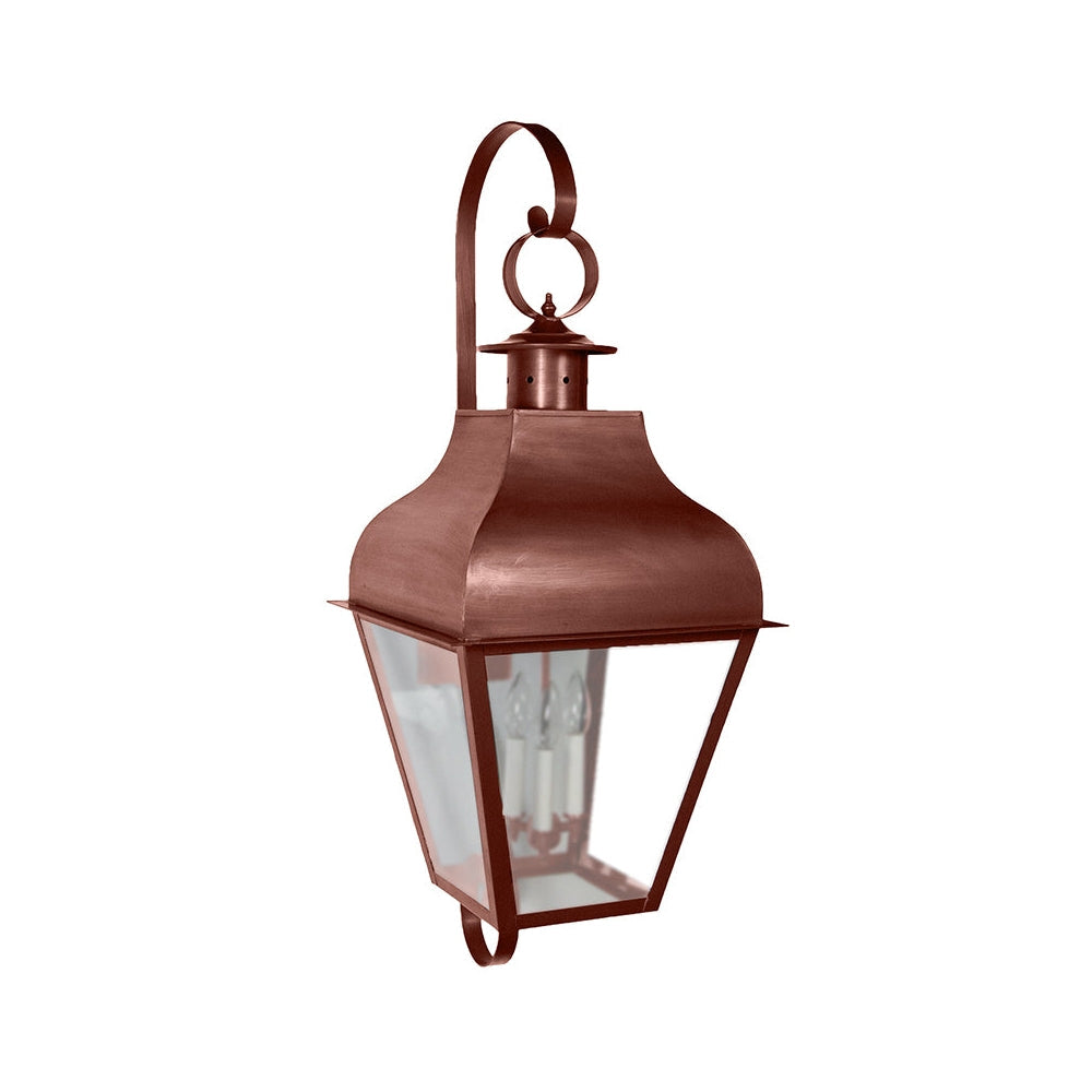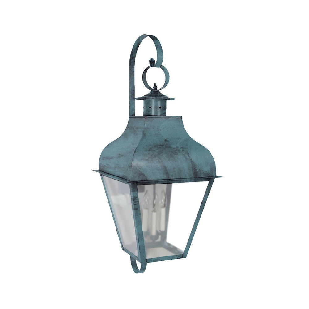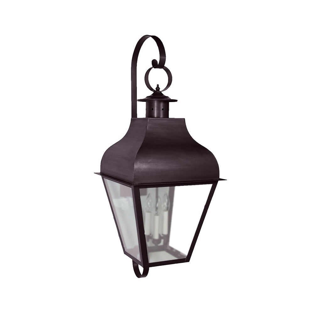 Our stylish exterior Stanfield Collection has solid metalwork softened by refined scrollwork. The robust feel of these lights create a sense of safety and security when they are illuminated. This 7658 (pictured in dark brass with (3) 60-watt candelabra sockets and optional clear seedy glass) is a stylish large wall lantern with decorative top and bottom scrolls and open bottom. This fixture is available with either (1) 75-watt medium base socket and chimney or (3) 60-watt candelabra sockets suspended from the top and plastic cream sleeves. This fixture has been constructed with tabs to make the removal and installation of the glass panels effortless if they need to be washed or replaced. See 7638 or 7648: 13"W x 15"D x 34"H (not shown) for smaller versions of this same light.