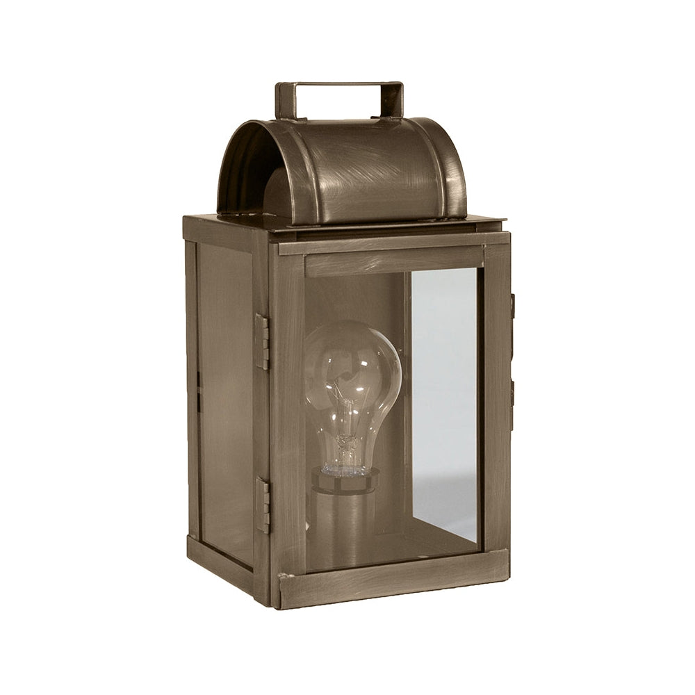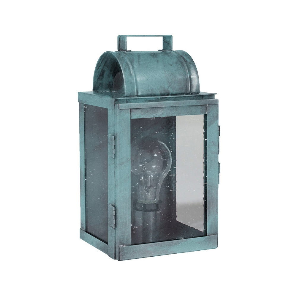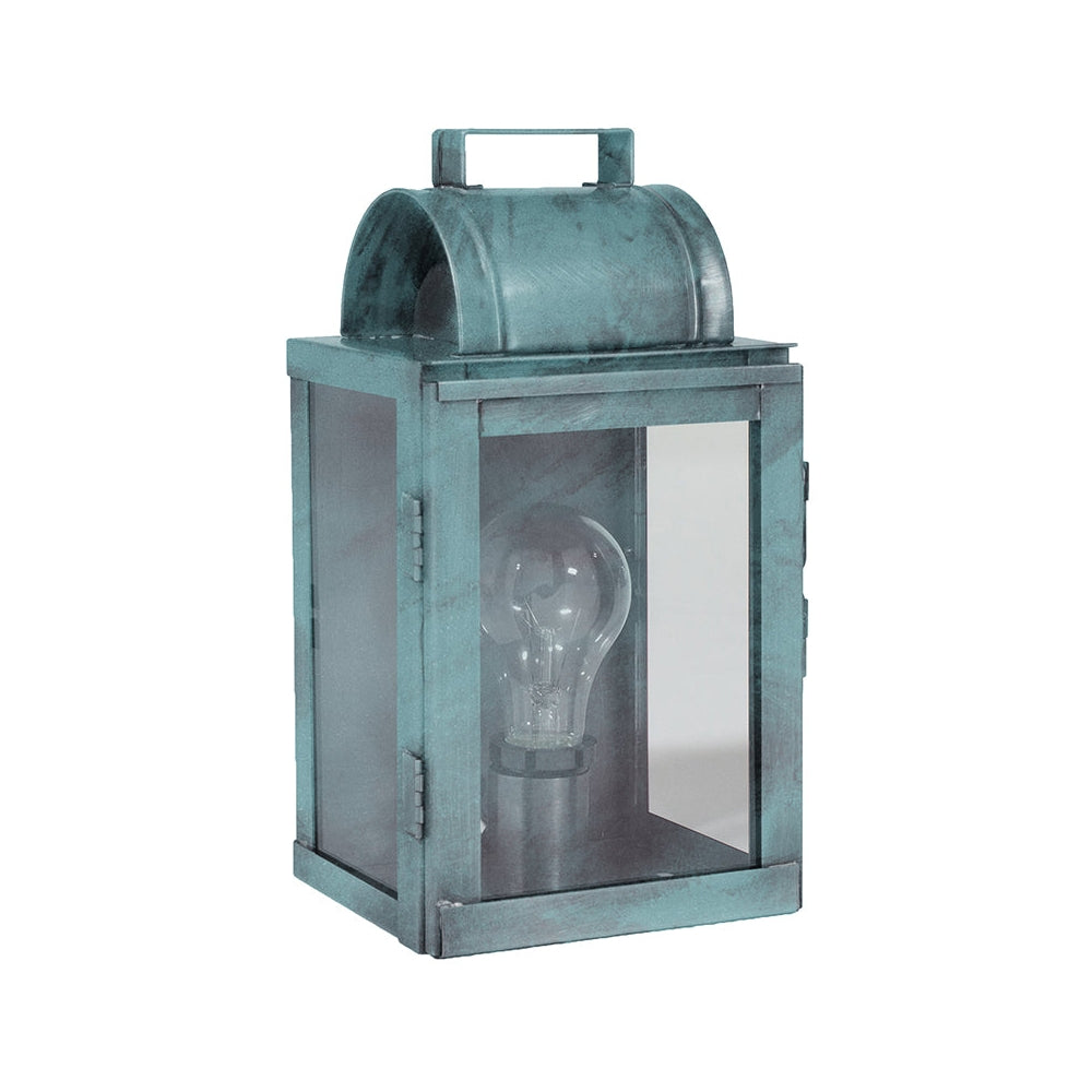 Our Livery Collection offers you a sampling from past London times. This 8011 (pictured in verdi gris) is a small culvert top wall fixture with (1) 75-watt medium base socket. All joints are securely soldered in place with precision and attention to detail. This fixture has been constructed with a door and tabs to make the removal and installation of the glass panels effortless if they need to be washed or replaced. This light also available as a flush mount 8014: 5.5"W x 5.5"D x 11"H (not shown).