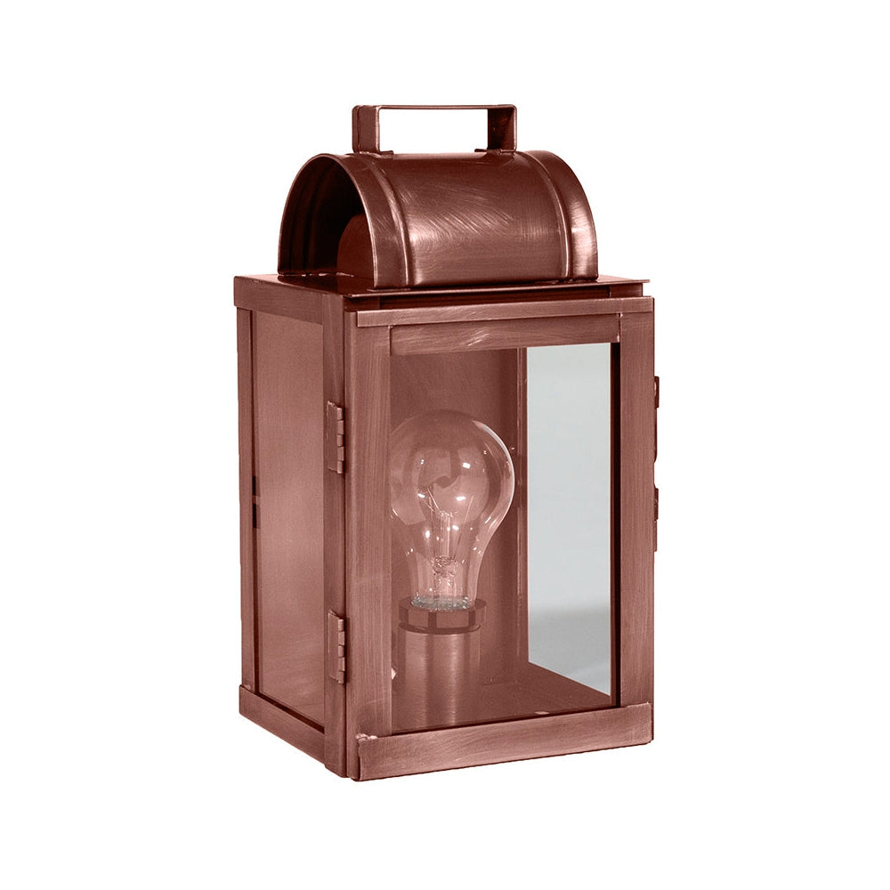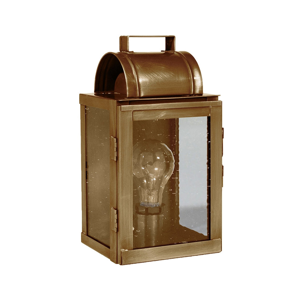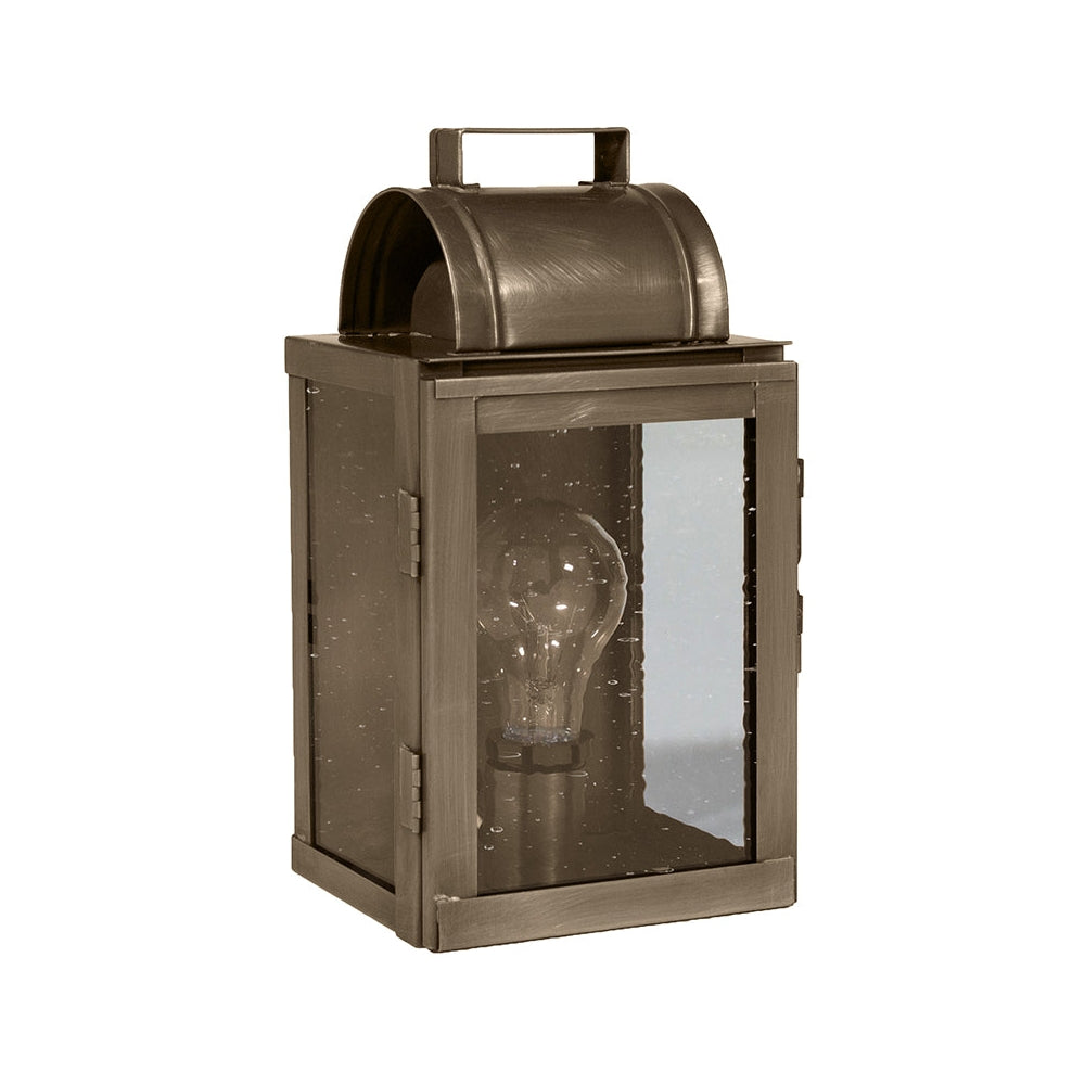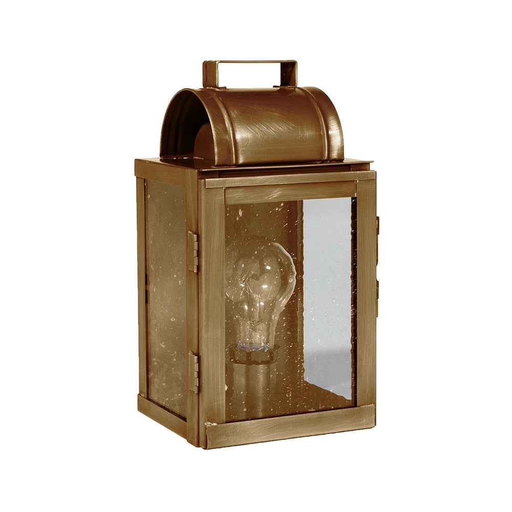 Our Livery Collection offers you a sampling from past London times. This 8011 (pictured in verdi gris) is a small culvert top wall fixture with (1) 75-watt medium base socket. All joints are securely soldered in place with precision and attention to detail. This fixture has been constructed with a door and tabs to make the removal and installation of the glass panels effortless if they need to be washed or replaced. This light also available as a flush mount 8014: 5.5"W x 5.5"D x 11"H (not shown).