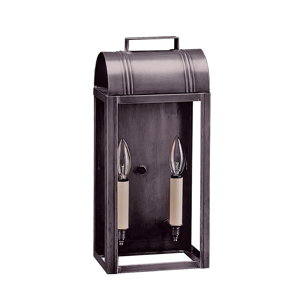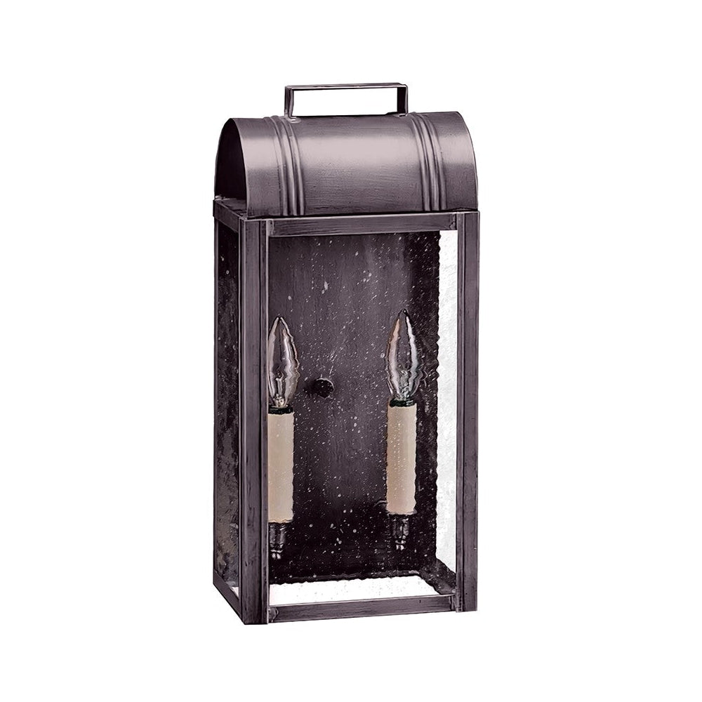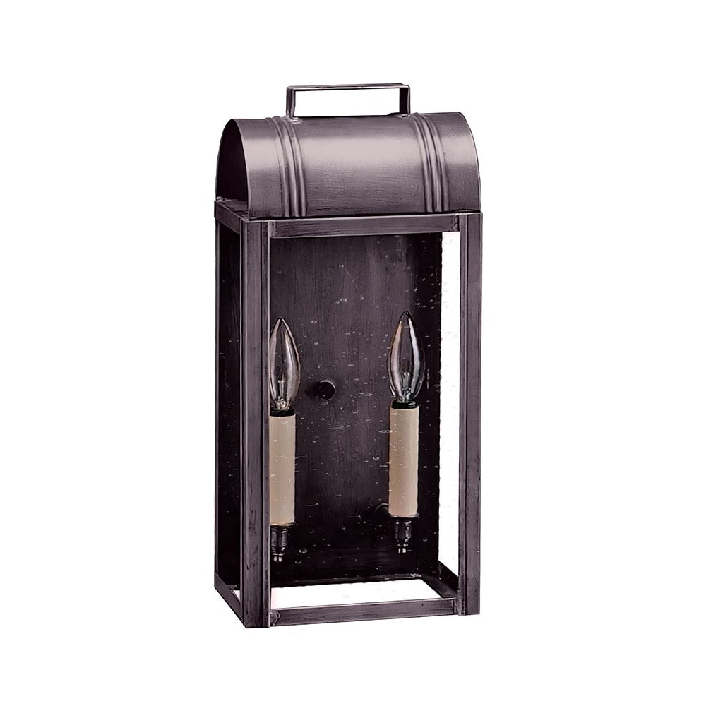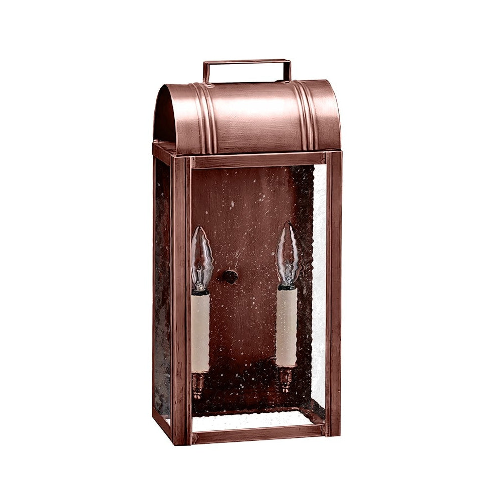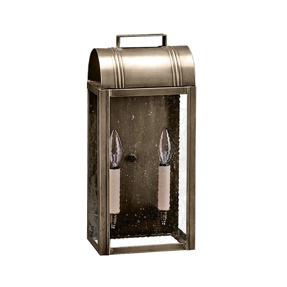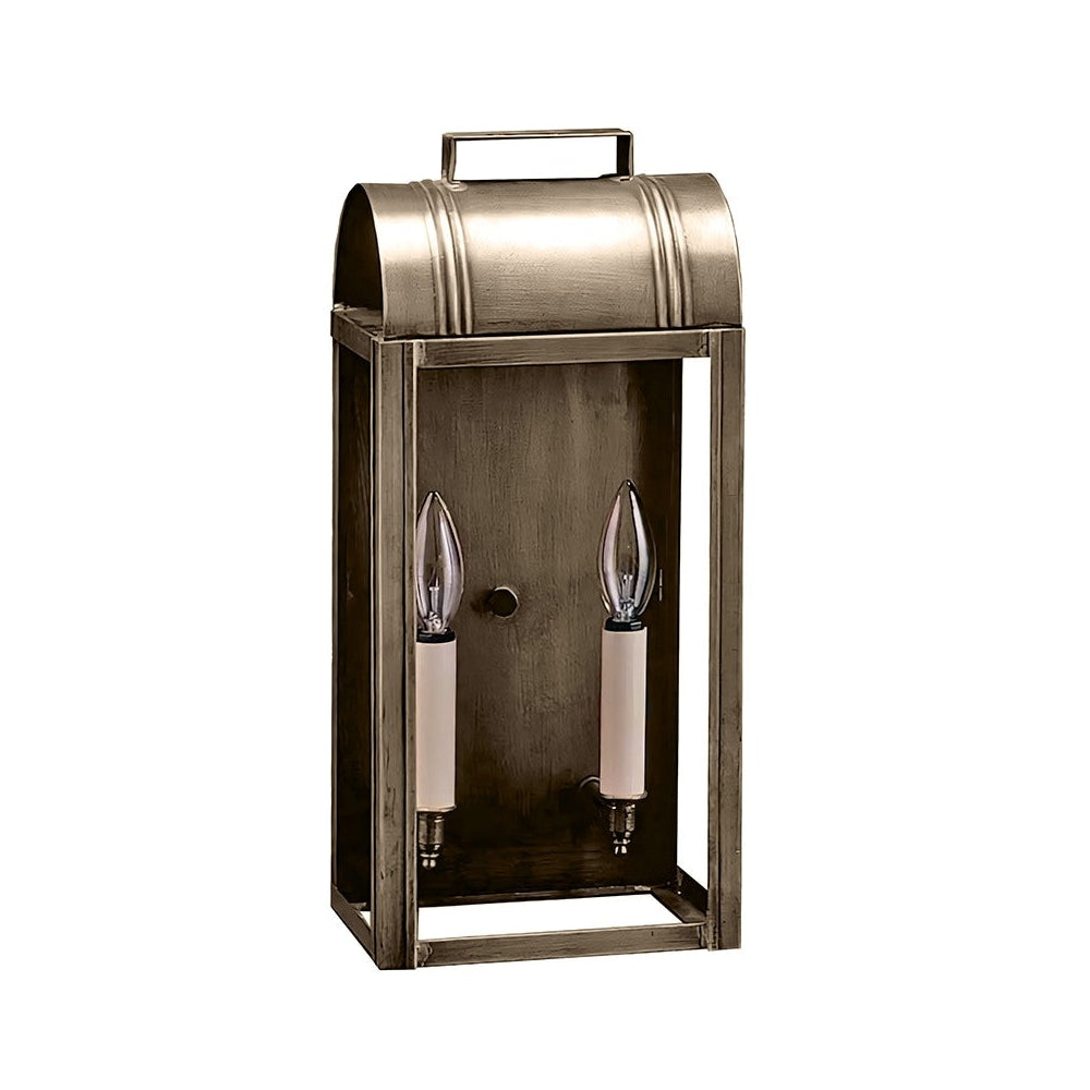 Our Livery Collection offers you a sampling from past London times. This 8031 (pictured in antique copper) is a large culvert top wall fixture with (2) 60-watt candelabra sockets, plastic cream sleeves and an open bottom for convenient bulb changing. All joints are securely soldered in place with precision and attention to detail. This fixture has been constructed with tabs to make the removal and installation of the glass panels effortless if they need to be washed or replaced. This light also available as a hanging fixture 8032: 7"W x 6"D x 16"H (not shown).