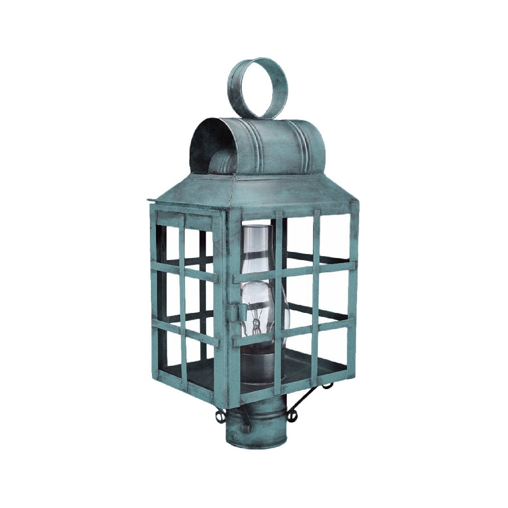 Inspired by old world lanterns, the Lynn Collection adds antique flair to any home. The cross bars create a caged effect that is reminiscent of ccolonial times. Culvert tops add a unique finish. Available as both wall fixtures and post lights, these pieces represent the enduring spirit of American life. The 8133 (pictured in antique brass with (1) 75-watt medium base socket) is a post mount lantern with a 3" fitter. It is available with either (1) 75-watt medium base socket and chimney or (2) 60-watt candelabra sockets. All joints are securely soldered in place with precision and attention to detail. This fixture has been constructed with a door and metal tabs to make the removal and installation of the glass panels effortless if they need to be washed or replaced.