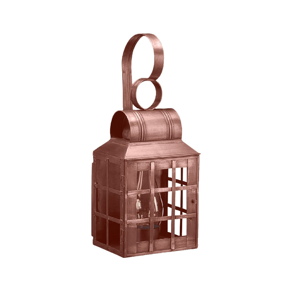 Inspired by old world lanterns, the Lynn Collection adds antique flair to any home. The cross bars create a caged effect that is reminiscent of ccolonial times. Culvert tops add a unique finish. Available as both wall fixtures and post lights, these pieces represent the enduring spirit of American life. The 8131 (pictured in antique copper with (2) 60-watt candelabra sockets) is a wall mount fixture with top scroll. It is available with either (1) 75-watt medium base socket and chimney or (2) 60-watt candelabra sockets off the back with an open bottom. All joints are securely sodered in place with precision and attention to detail. This fixture has been constructed with tabs to make the removal and installation of the glass panels effortless if they need to be washed or replaced.