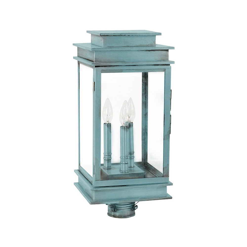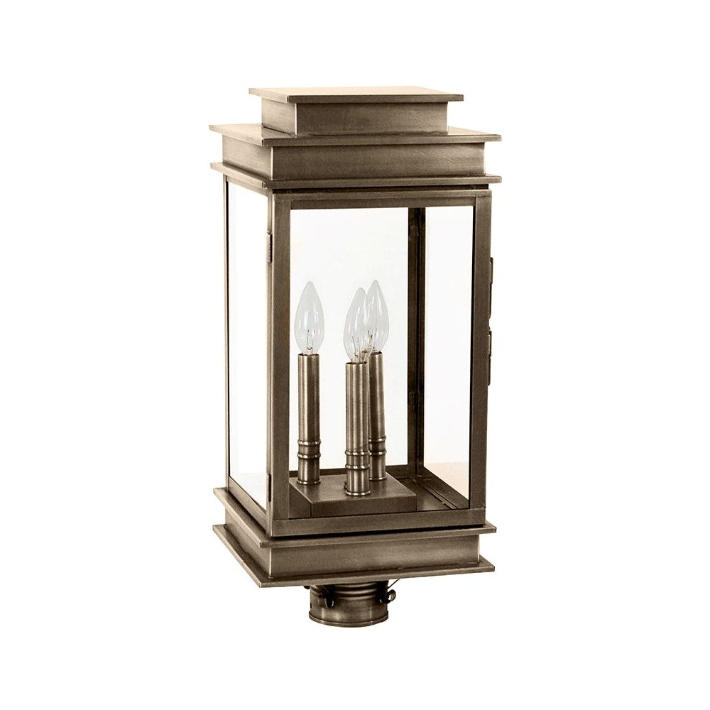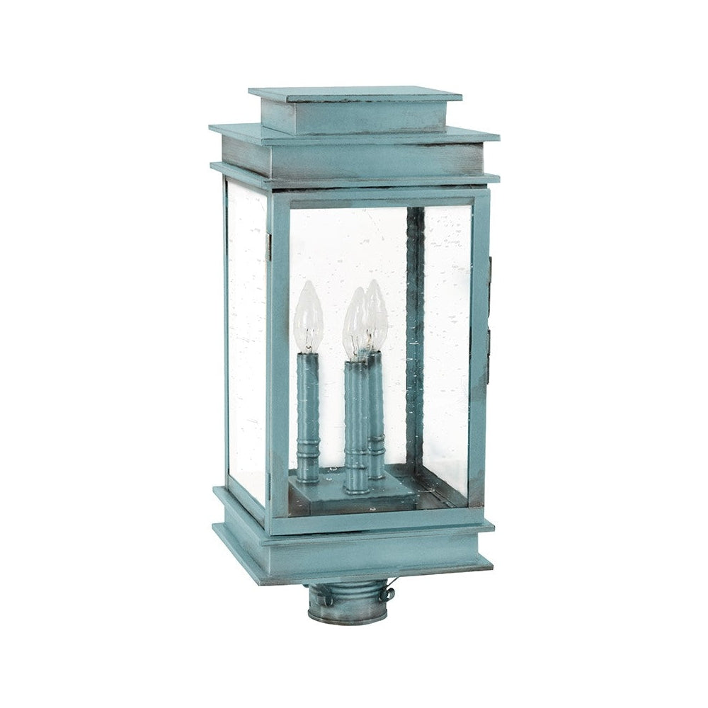 Our Empire Collection is a fusion of modern and contemporary styles, highlighted by the unique double tiered top with square edges. All lanterns in this collection arrive standard with decorative beaded brass candle sleeves and clear glass. This 8933 (pictured in Antique Brass) is a post mount fixture with (3) 60-watt candelabra sockets and a 3" fitter. All joints are securely soldered in place with precision and attention to detail. This fixture has been constructed with tabs and a door to make the removal and installation of glass panels effortless if they need to be washed or replaced. This is also available as a 8932 hanging fixture 9.25W x 9.25D x 19"H (not pictured).