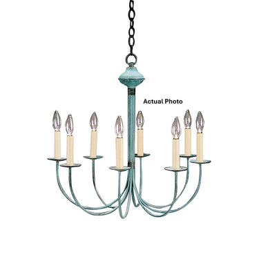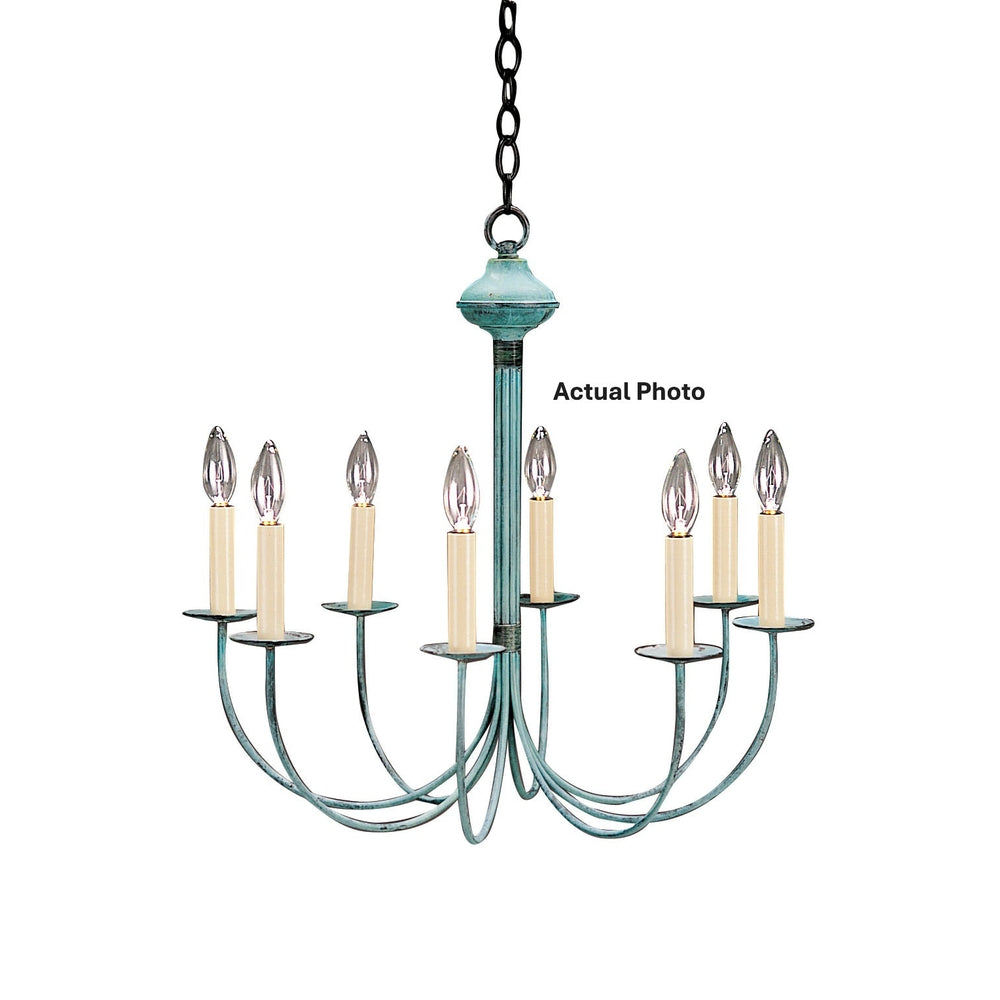 Our chandeliers are a superb way to add charm and elegance to any room in the house. We offer various sizes from small simple fixtures to elegant complex tiered designs. A 908 arrives with standard paper cream sleeves, 36" chain and 5" ceiling canopy. This 908 (pictured in Verdi Gris) has (6) 60-watt candelabra sockets. Additional chain, eggshell or black shades, paper drip, bees wax and brass metal sleeves are optional. Note: If ordered in copper finish, the top ring and wire wrappings will be in brass.