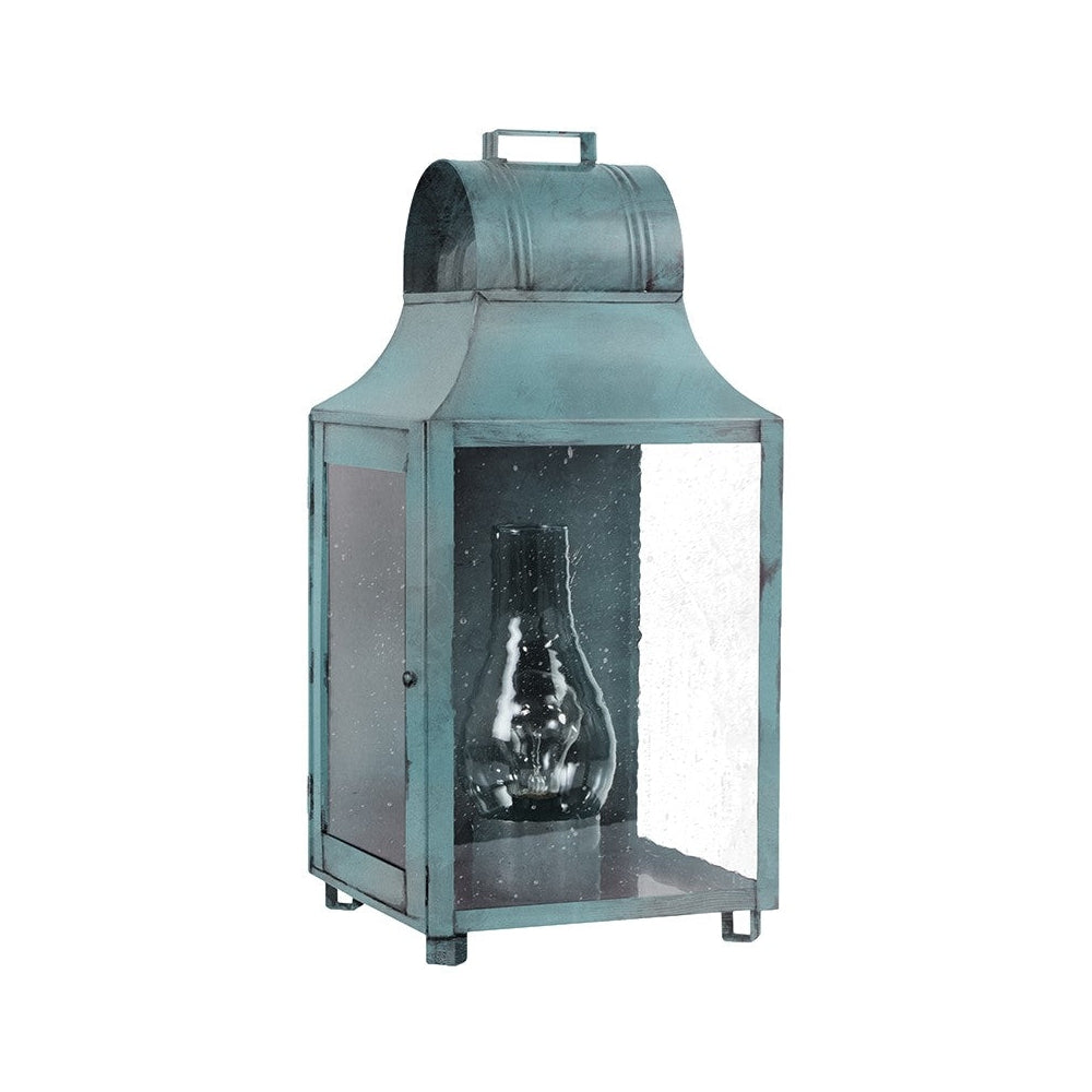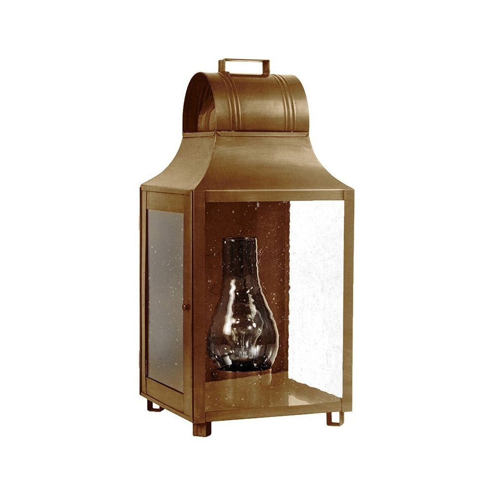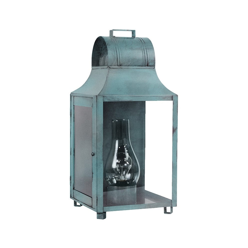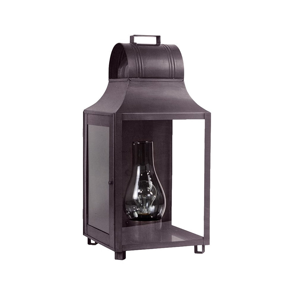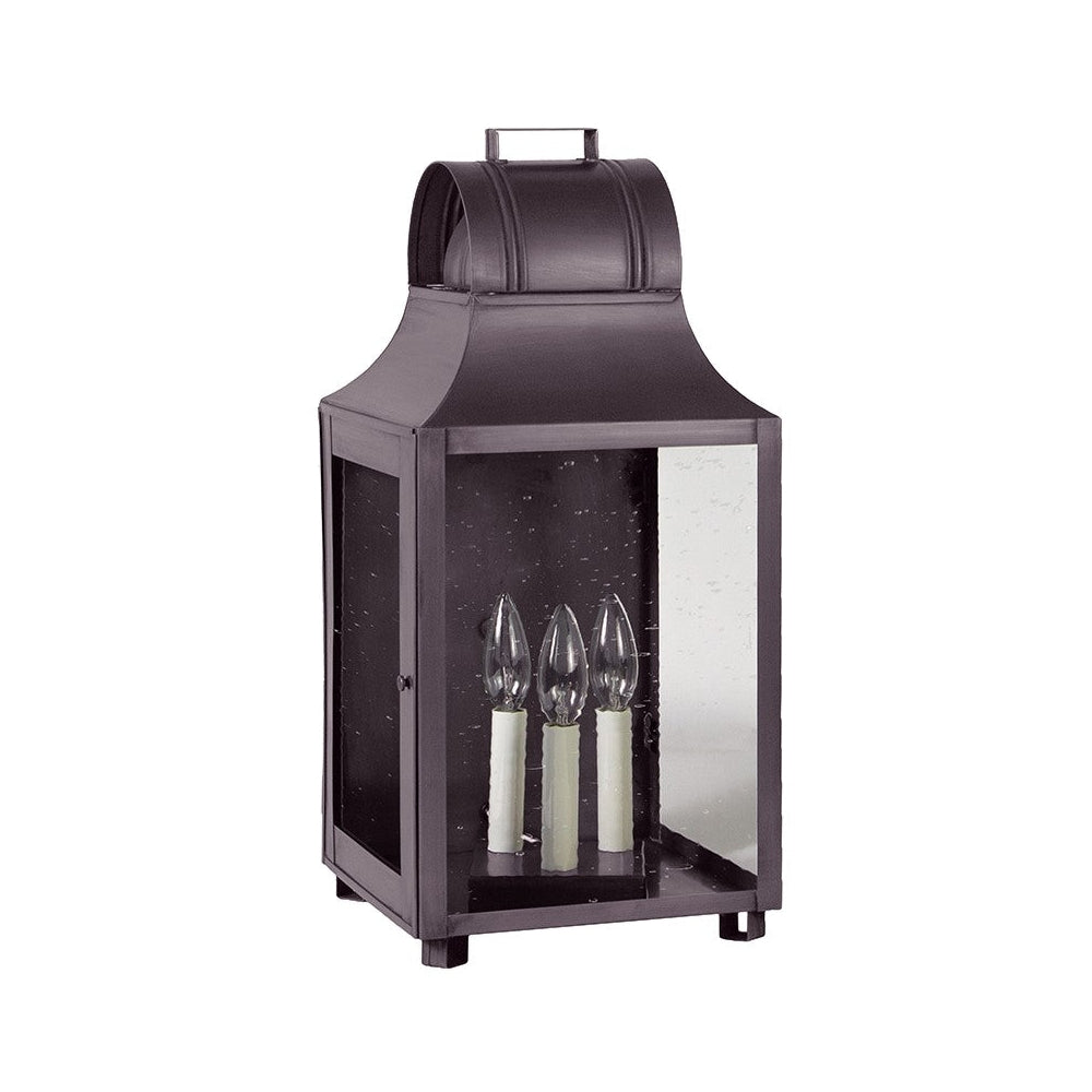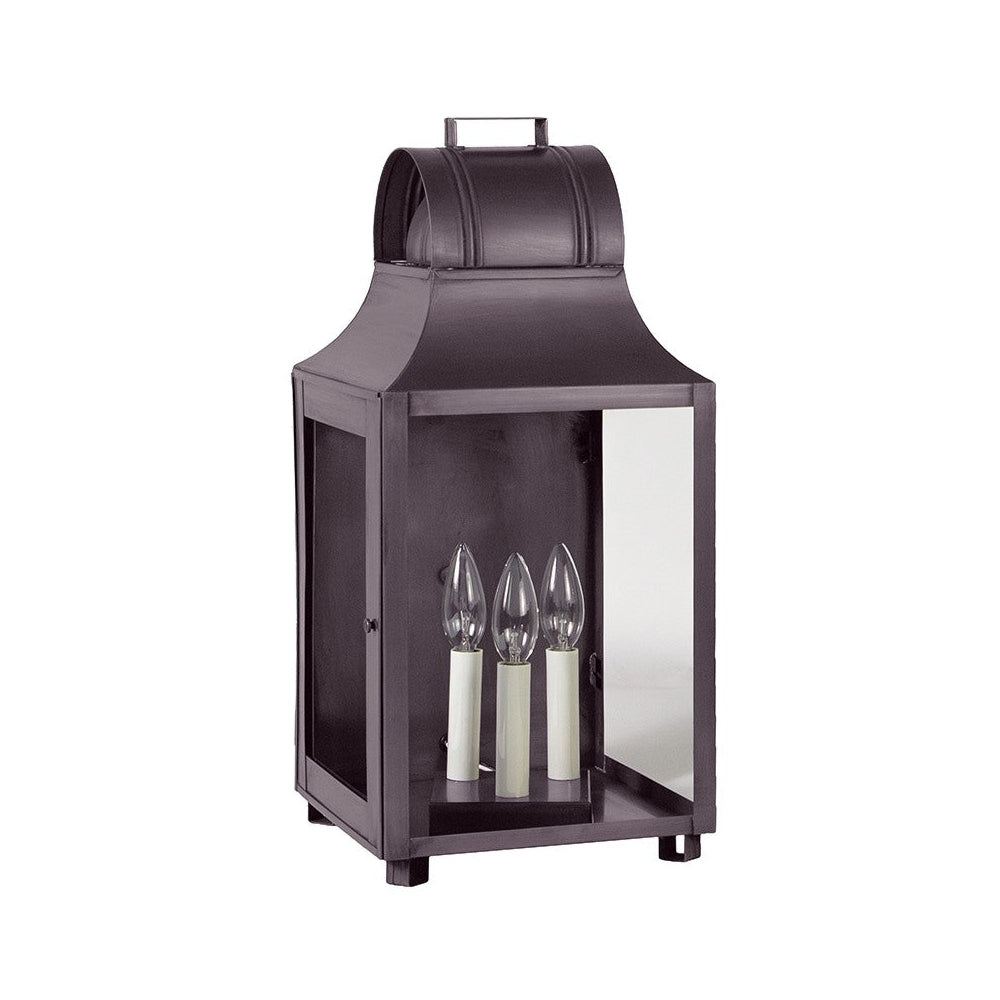 Our Livery Collection offers you a sampling from past London times. This 9051 (pictured in antique copper with (1) 75-watt medium base socket and chimney and an optional 7" mercury reflector) is a wall mount fixture with a culvert top. This fixture is available with either (1) 75-watt medium base socket or (3) 60-watt candelabra sockets and plastic cream sleeves. All joints are securely soldered in place with precision and attention to detail. This fixture has been constructed with a door and tabs to make the removal and installation of the glass panels effortless if they need to be washed or replacment. See 9051W for this same fixture with a wooden handle. This light also available as a post light 9053: 9"W x 9"D x 23"H (not shown).