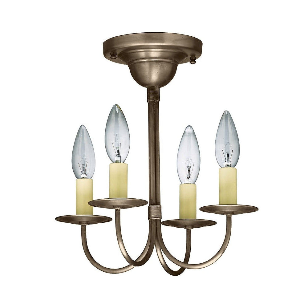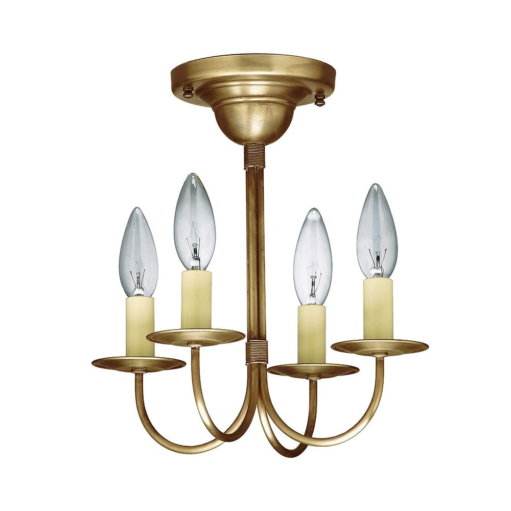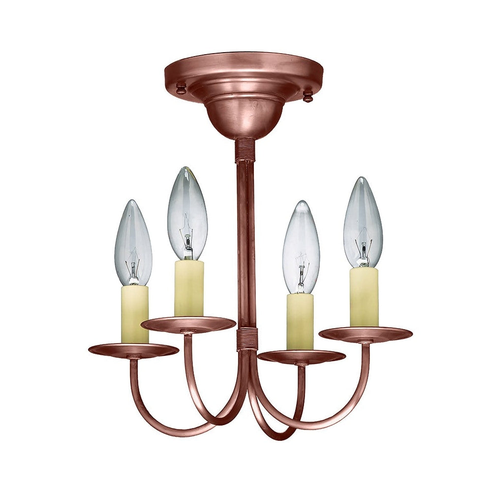 Our Williams Collection flush mount chandeliers are perfect for bedroooms, hallways, closets and small rooms. The 904F (pictured in antique brass) is a ceiling fixture with (4) 60-watt candelabra sockets. This light sits flush against the ceiling with a 5.75" diameter mounting area. Comes standard with paper cream sleeves. Paper drip, bees wax and brass candle sleeves are optional. All joints are securely soldered in place with precision and attention to detail. Note: If ordered in copper finish, the top ring and wire wrappings will be in brass.