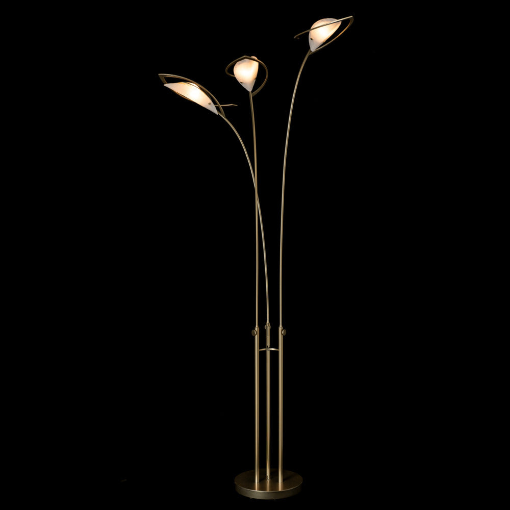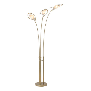 Three lovely stems culminating in beautiful white art glass flowers, the Aerial Torchiere designed by Ori Goldberg has a very botanical aesthetic. Light and airy, this adds a feminine touch while providing functional lighting with elegance. A vertical pole dimmer allows you to adjust the lamp's brightness.