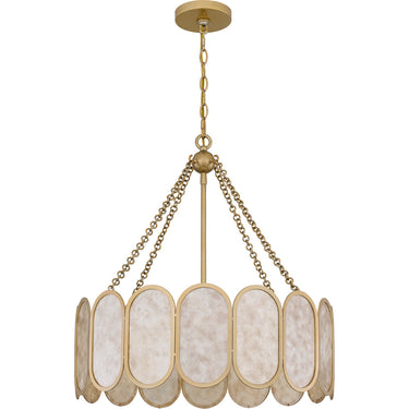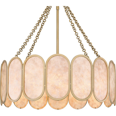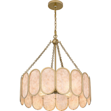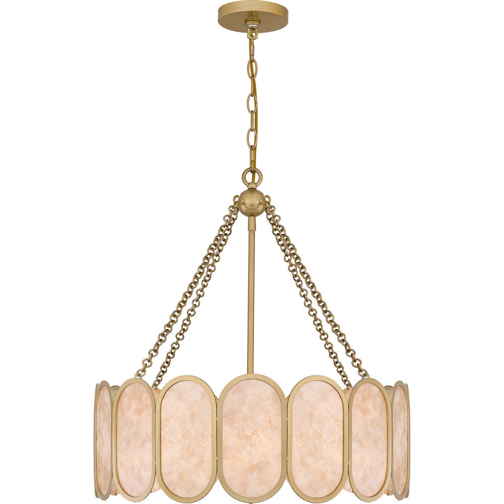 Mica shades take front and center in the Amalia pendant, a welcome addition to the Quoizel Naturals collection. The light gold frame pairs beautifully with the opalescent pink mica for a modern, shimmering effect. Hang this glamorous piece in a dining room, home office, bedroom, or in any living area.