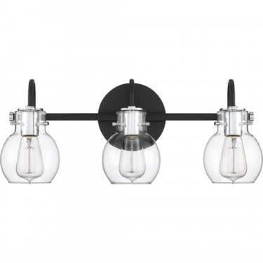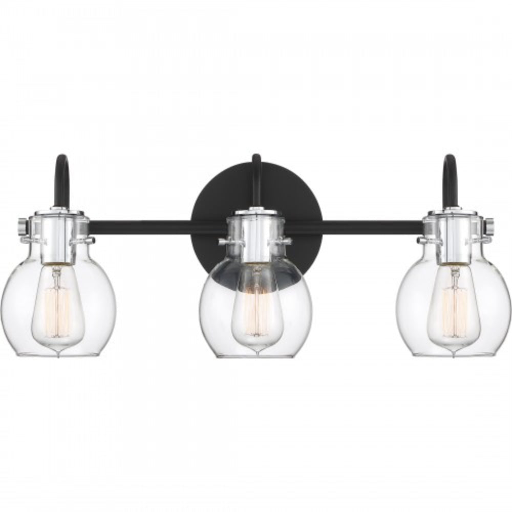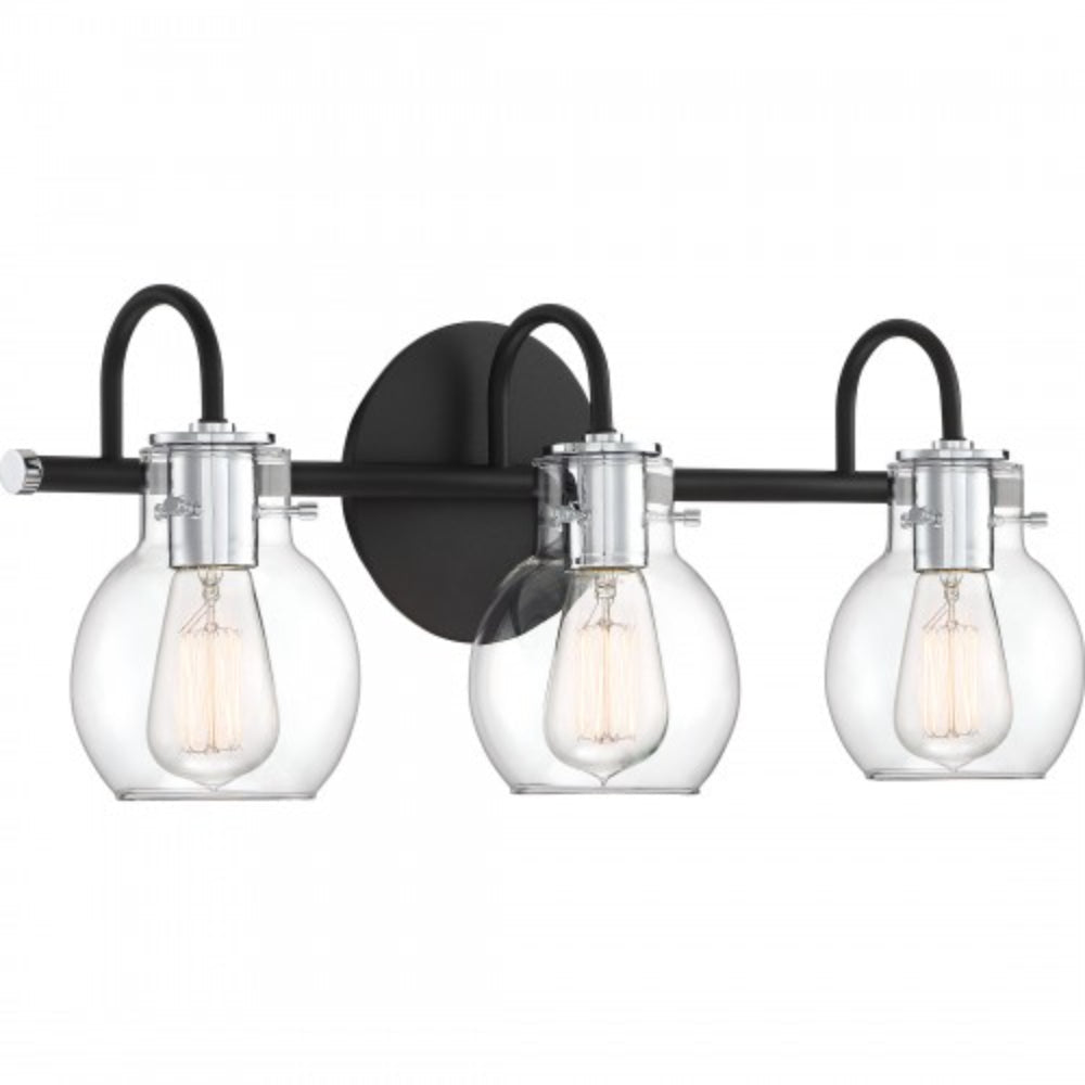 The ageless style of the Andrews Bath Collection is synonymous with classic industrial design. The clear glass shades encircle the sockets and appear as though they are floating over the vintage filament bulbs. The earth black finish on the backplate, support bar and arms is the perfect contrast to the chrome accents. We recommend utilizing vintage Edison-style bulbs for maximum effect.