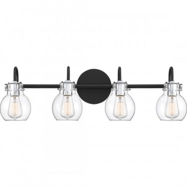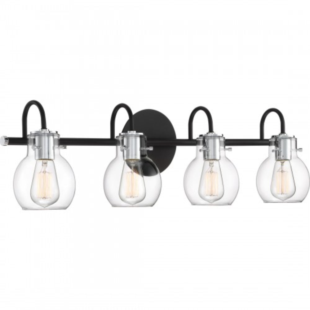The ageless style of the Andrews Bath Collection is synonymous with classic industrial design. The clear glass shades encircle the sockets and appear as though they are floating over the vintage filament bulbs. The earth black finish on the backplate, support bar and arms is the perfect contrast to the chrome accents. We recommend utilizing vintage Edison-style bulbs for maximum effect.