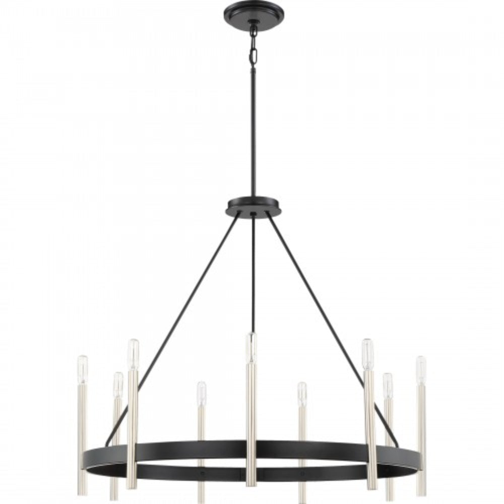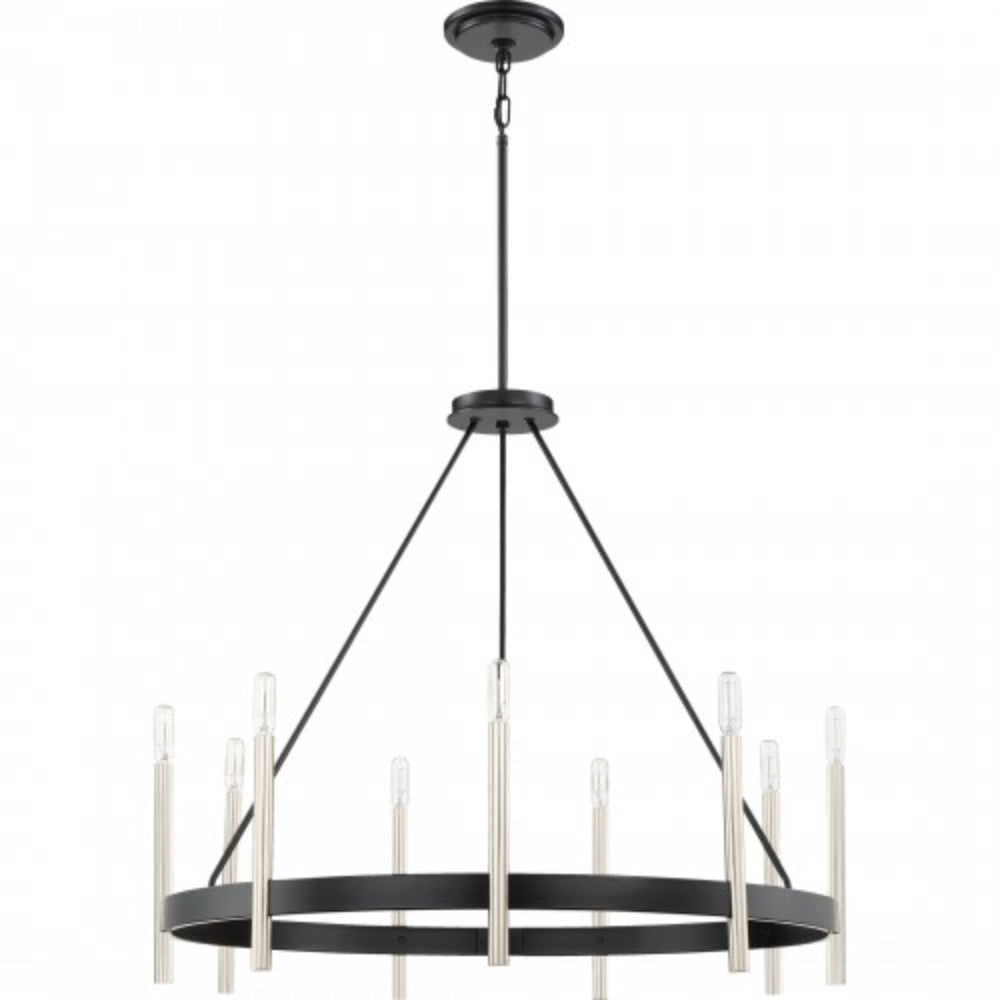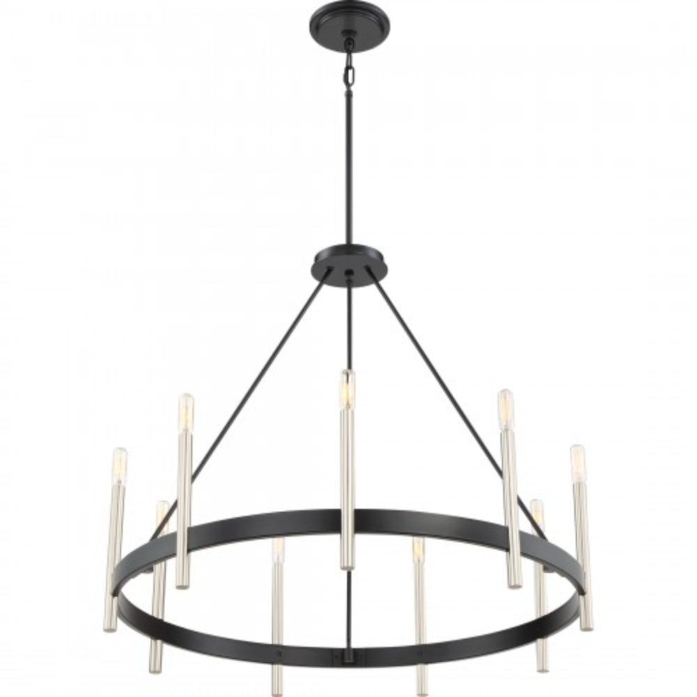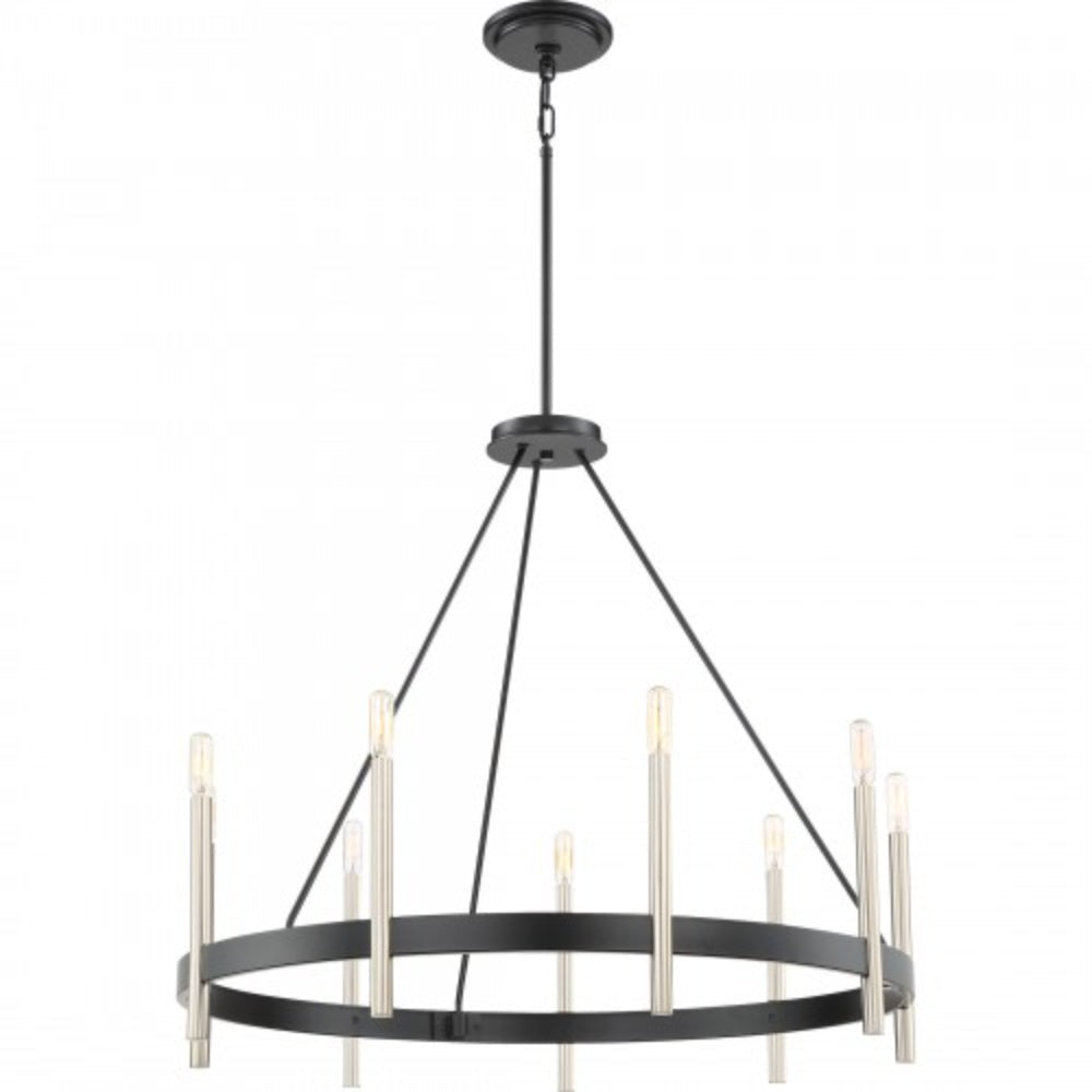 The Anthem is a master class in minimalist elegance. A simple circular frame in matte black hosts a series of exaggerated candle sleeves in lustrous brushed nickel. The contrast in scale and finish creates drama in the otherwise modest design.