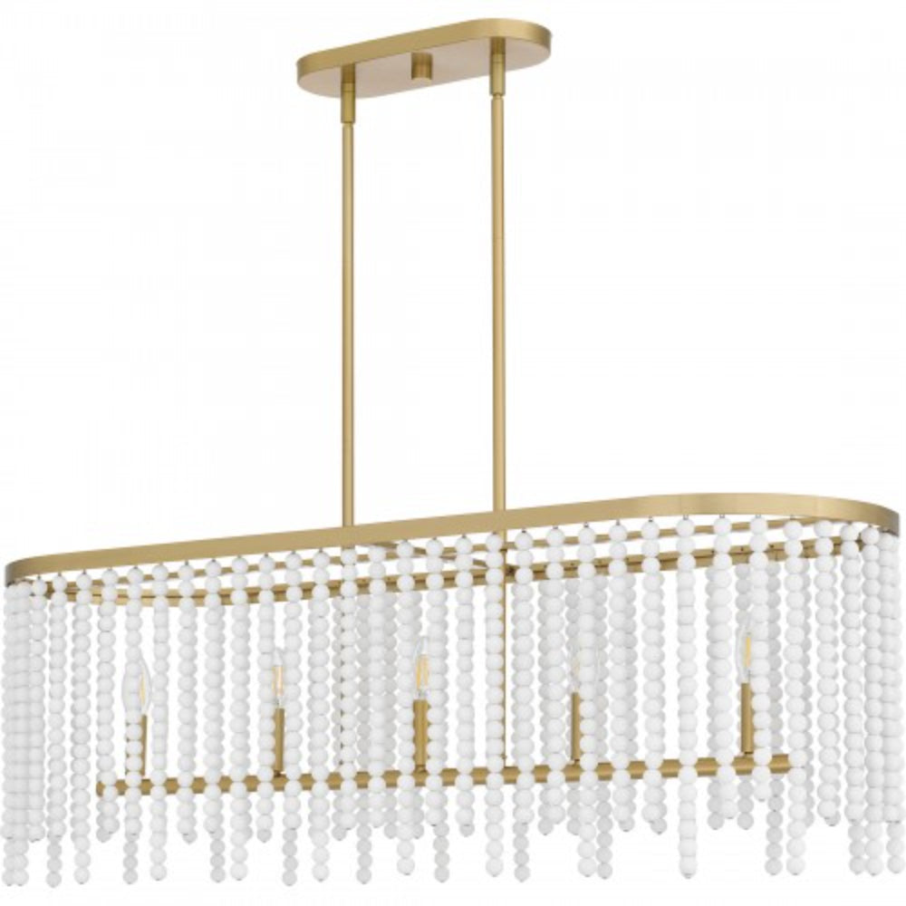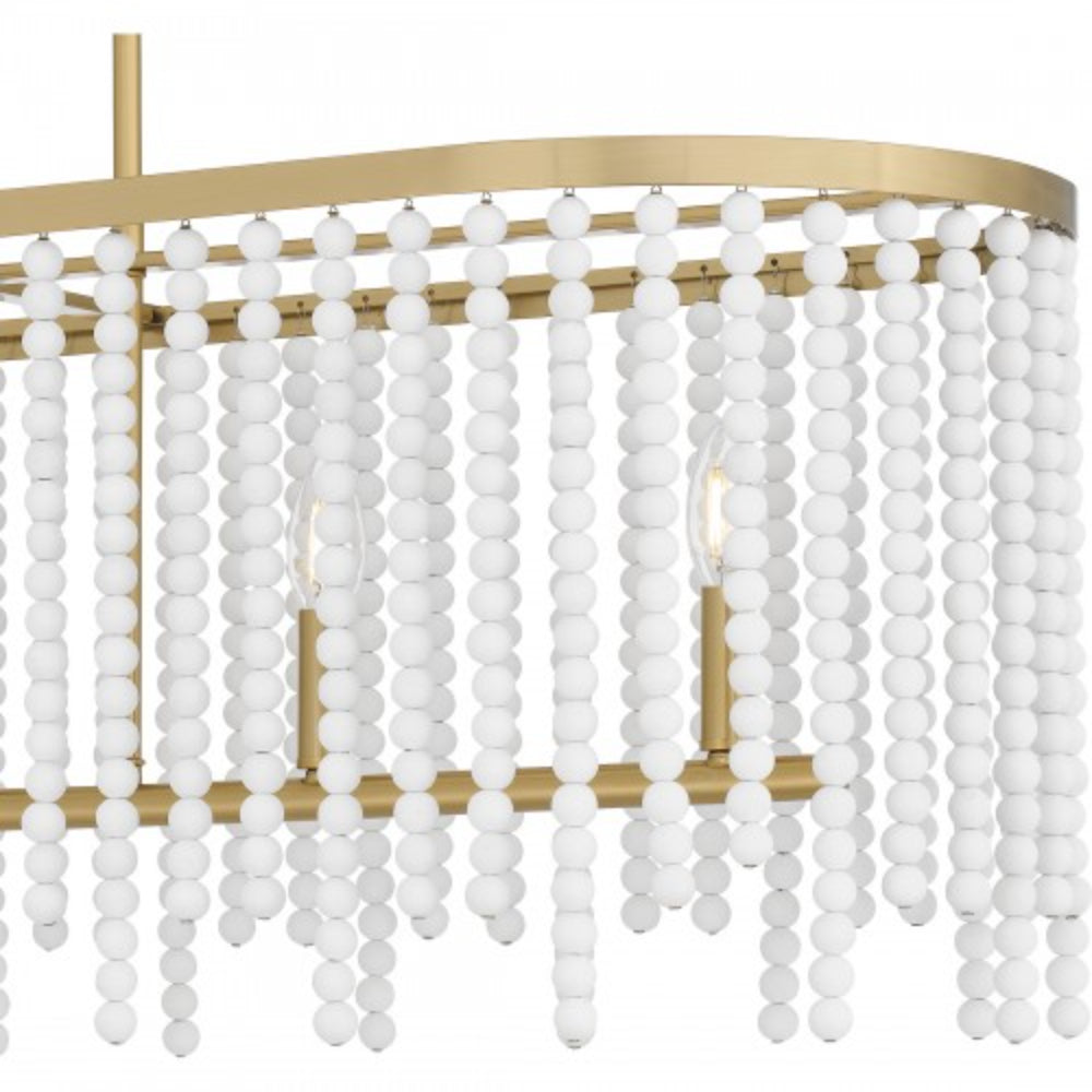 The Apelle collection takes a fun, playful approach to classic lighting design. White wood beads add a touch of glamour to the otherwise simple silhouette, while an aged brass finish completes the look with warmth. Choose from a pendant light, semi-flush mount, or linear island chandelier to brighten up your home in style.