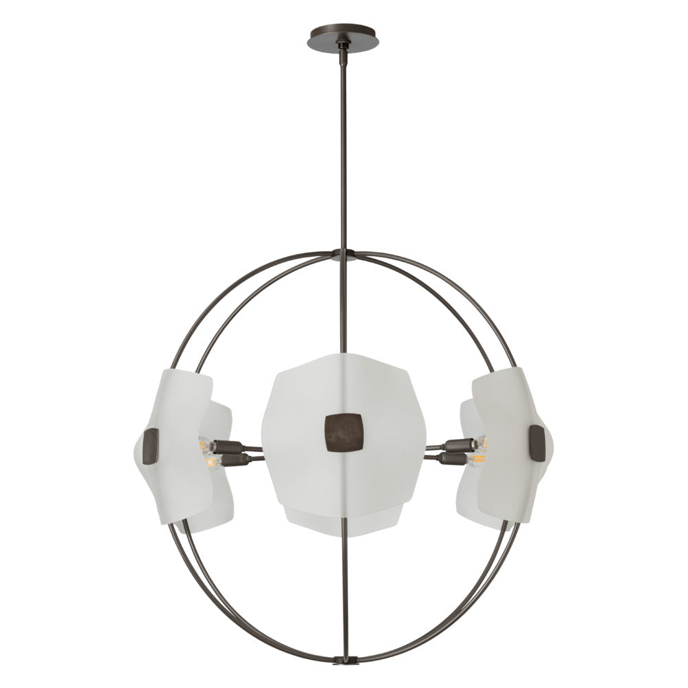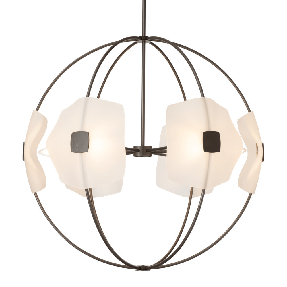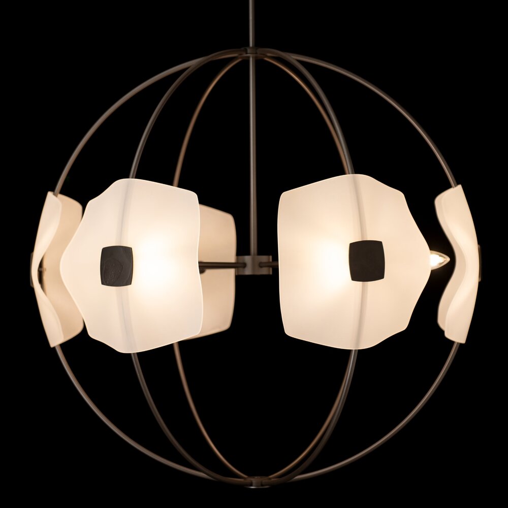 The six light Astra Orb Small Pendant features gently slumped handmade glass, complementing each curved metal arm of the fixture. Each stunning piece of glass is held in place by a hand-forged medallion for a sophisticated look.