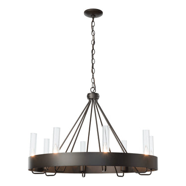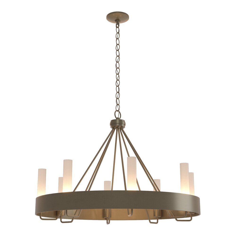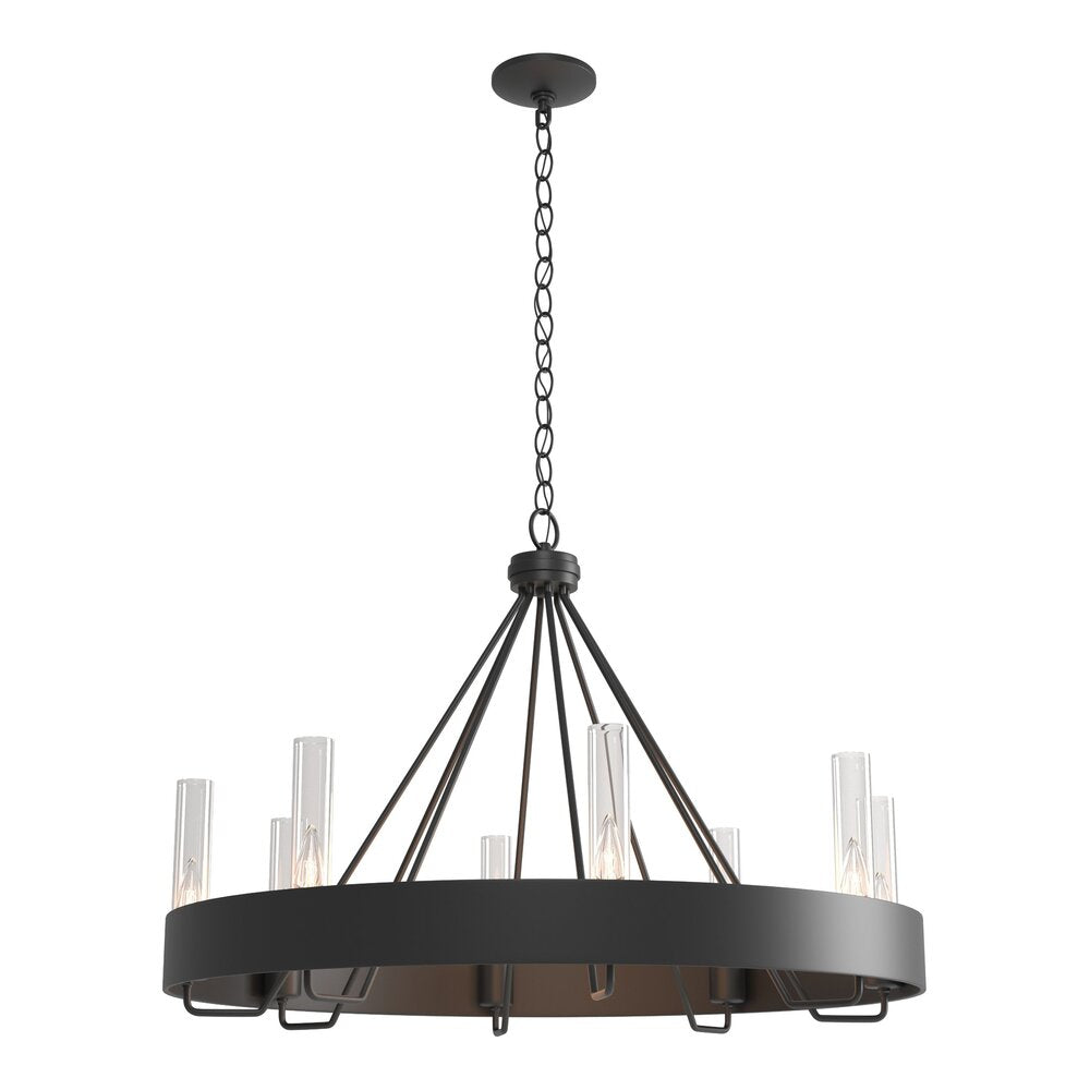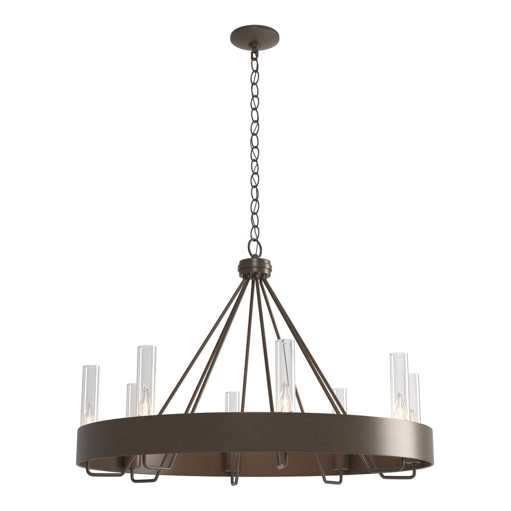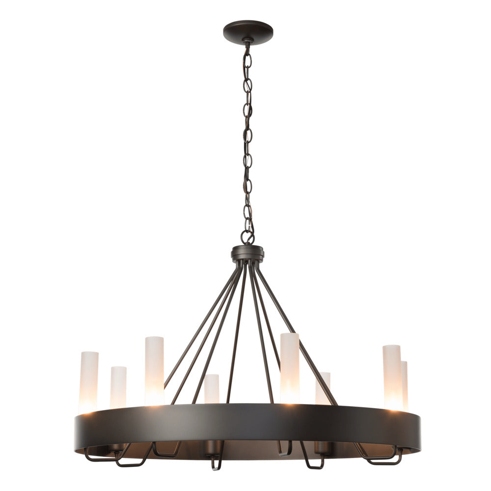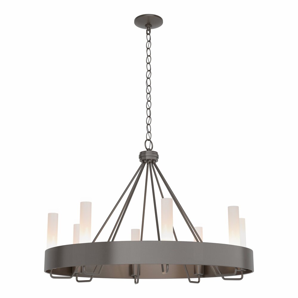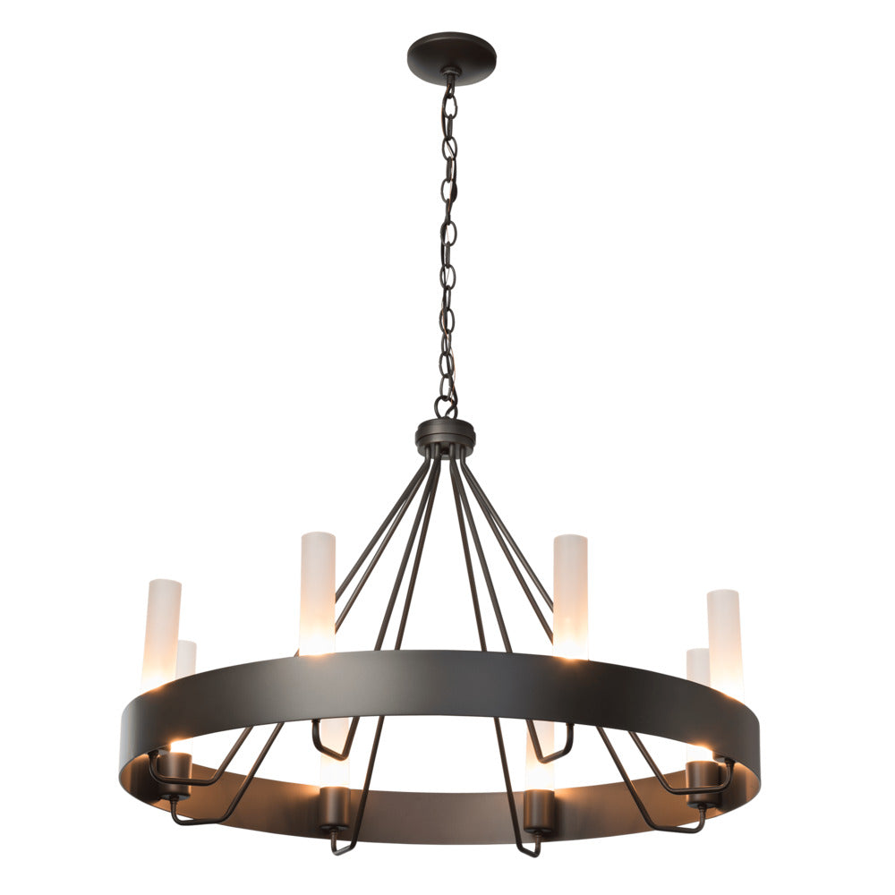 As at home in a modern lodge with exposed beams, as in a contemporary city loft, the Banded Ring Chandelier is far-reaching in its appeal. Clean lines radiate upward from a wide steel band, as candelabra bulbs warmly illuminate within 8 glass cylinders. Available in clear or opal glass options.