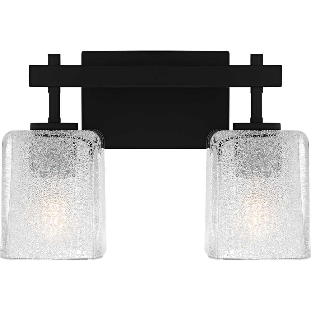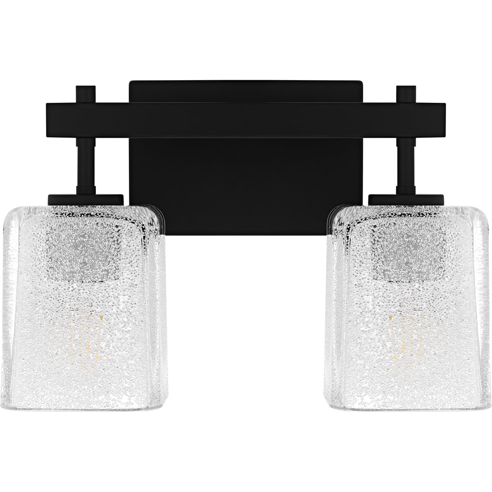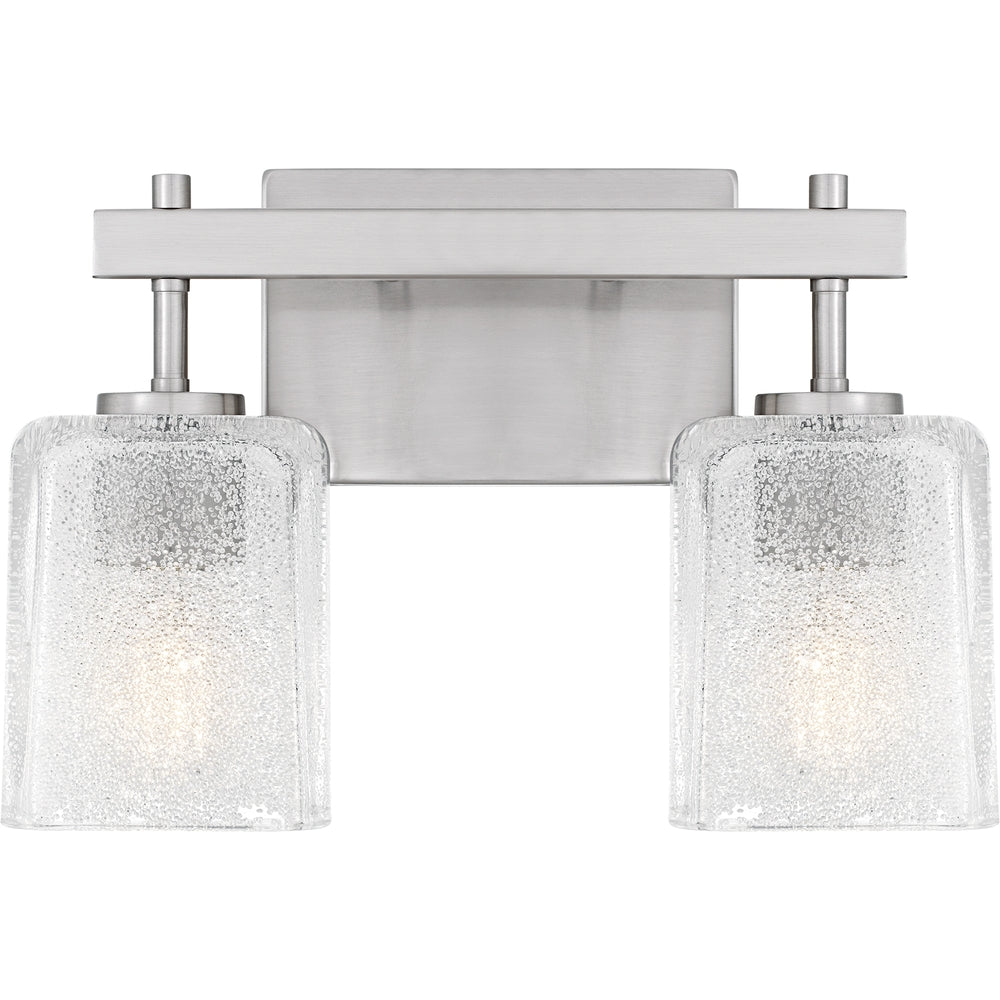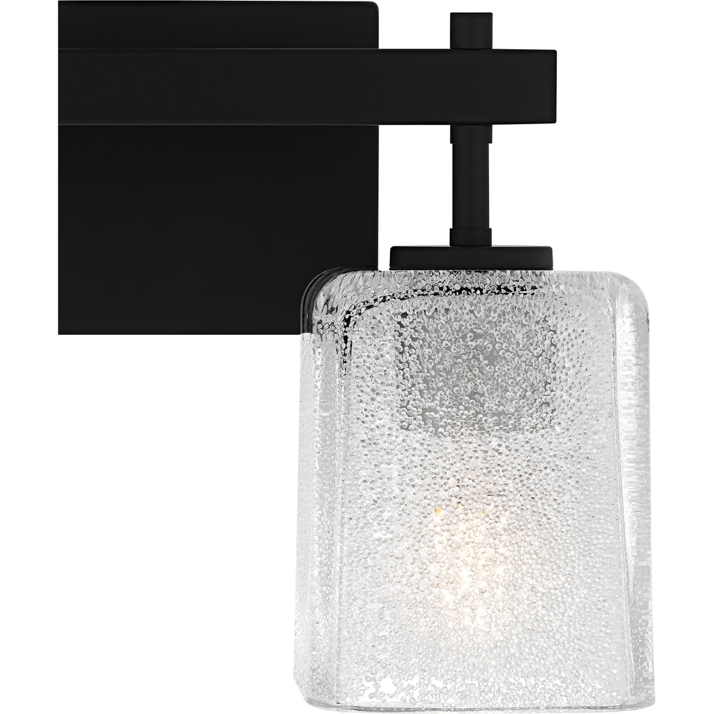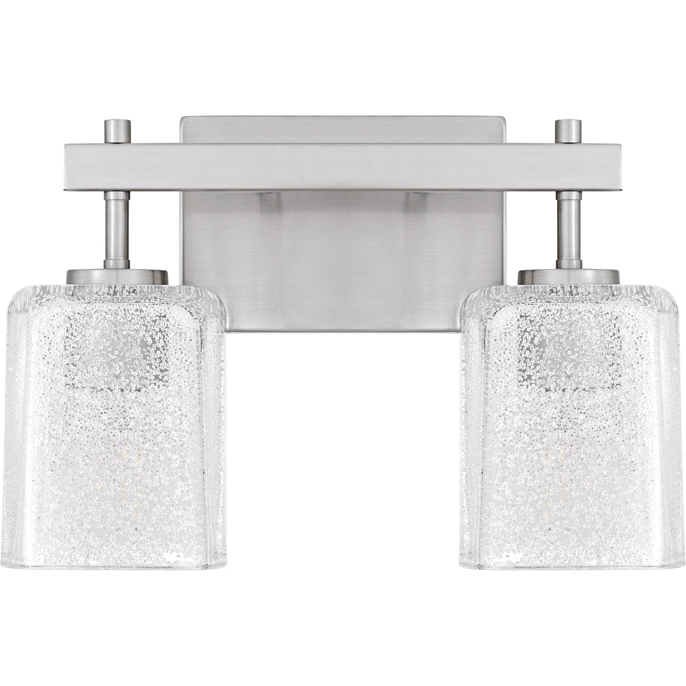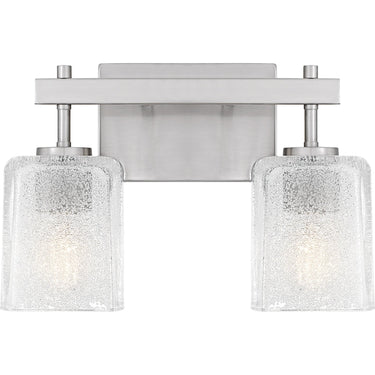 The Brenthouse bath light features a clean, minimalist design with a striking visual impact. Square glass shades cast a soft, diffused glow while adding a touch of texture to the simple silhouette. The thick glass shades feature tiny crystals on the inside, creating a look reminiscent of sparkling sand. The vanity light's slender metal frame, available in a versatile matte black or brushed nickel finish, complements a variety of bathroom styles.