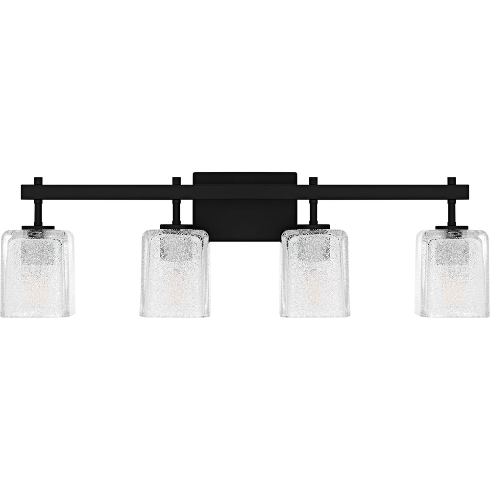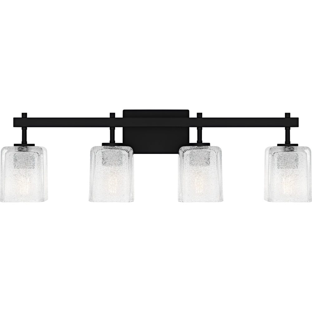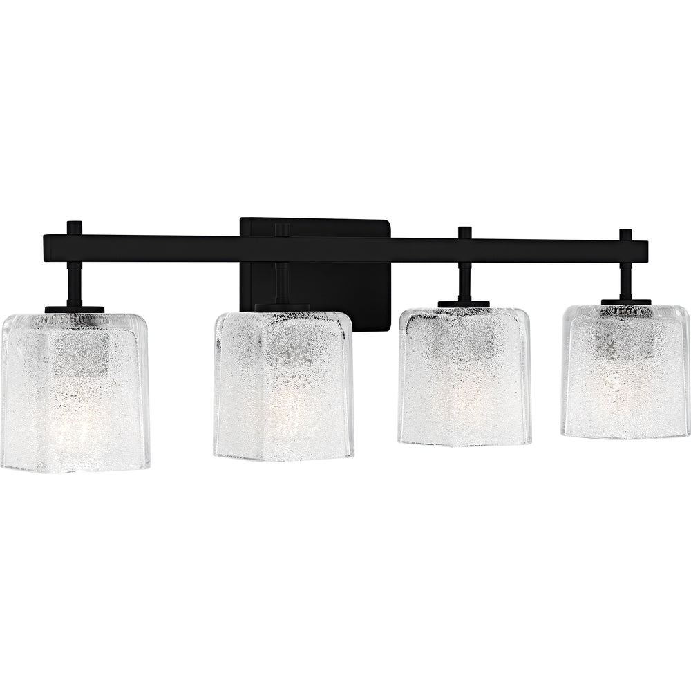 The Brenthouse bath light features a clean, minimalist design with a striking visual impact. Square glass shades cast a soft, diffused glow while adding a touch of texture to the simple silhouette. The thick glass shades feature tiny crystals on the inside, creating a look reminiscent of sparkling sand. The vanity light's slender metal frame, available in a versatile matte black or brushed nickel finish, complements a variety of bathroom styles.