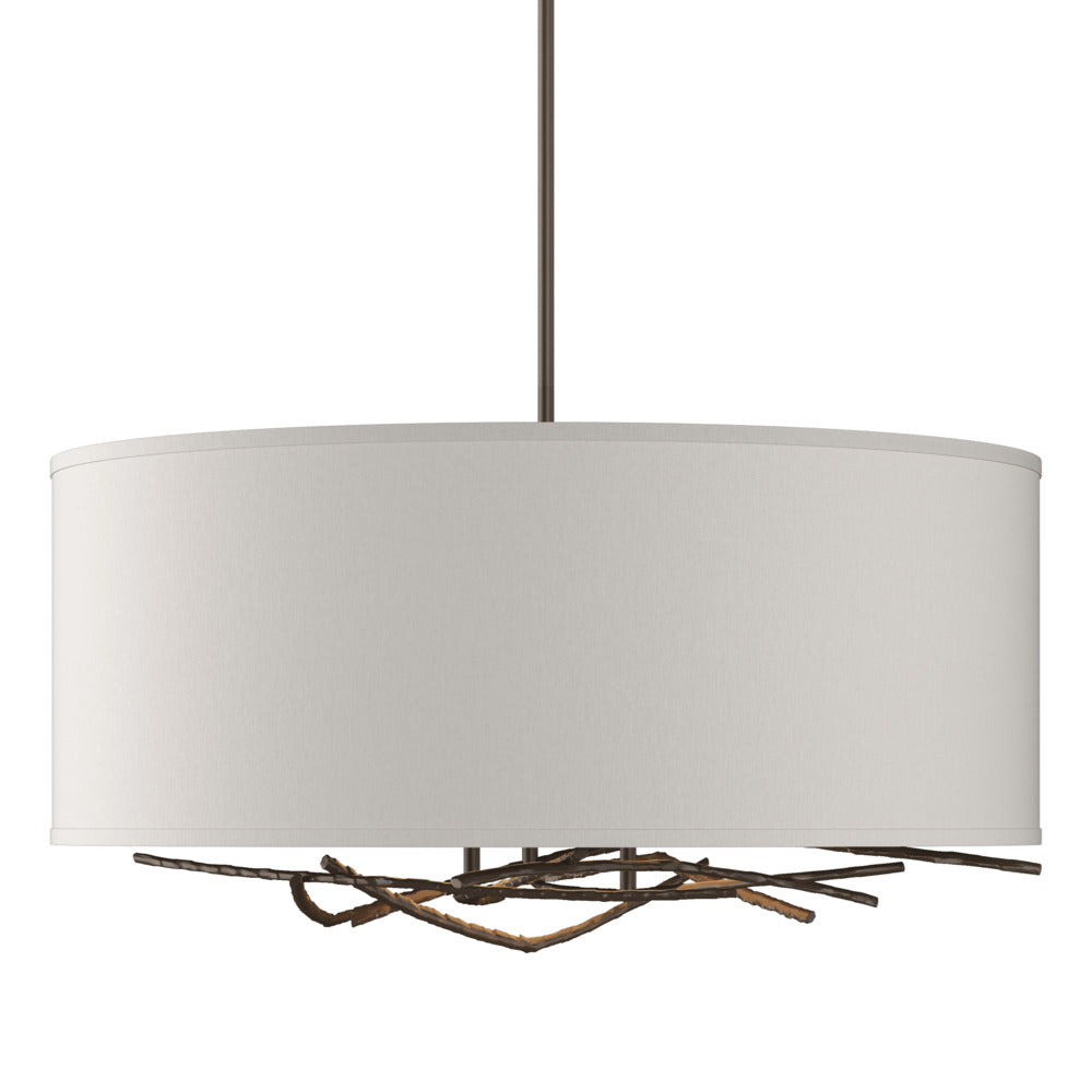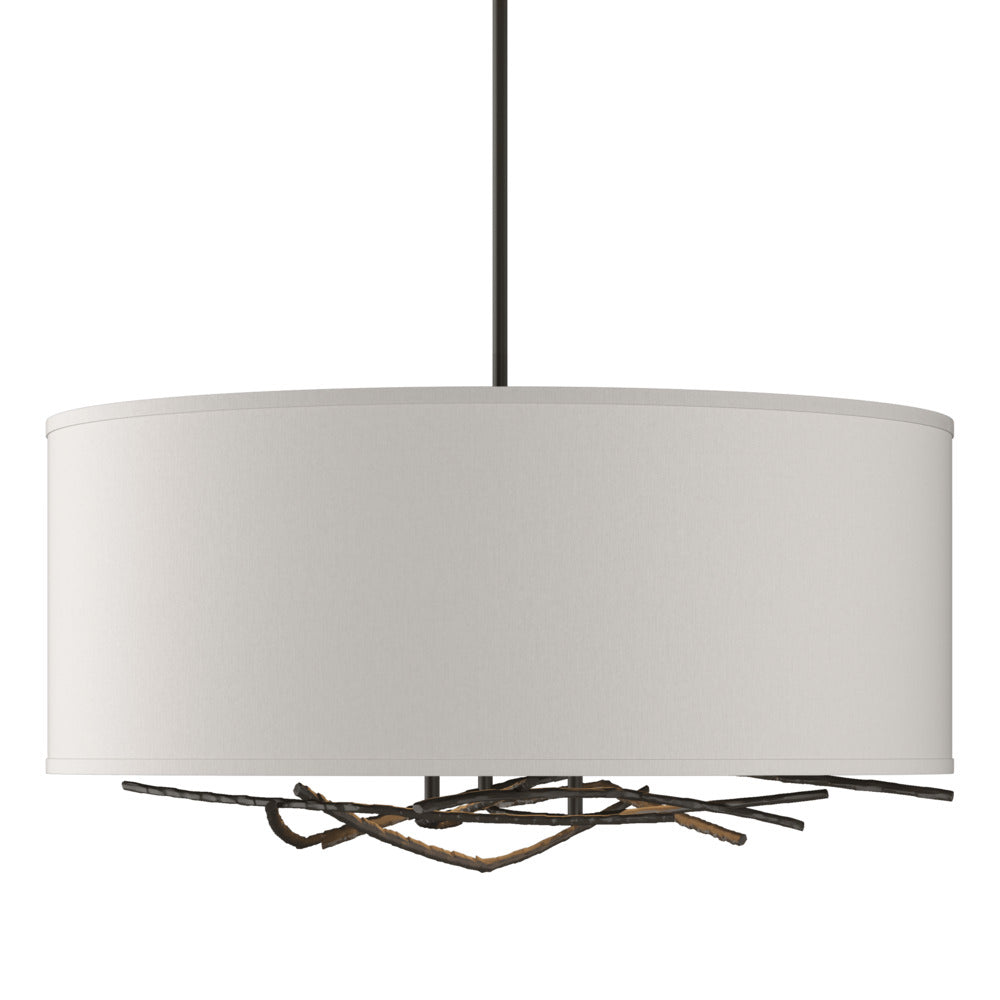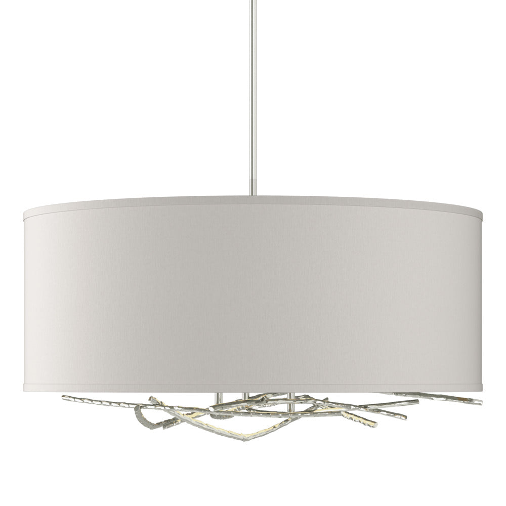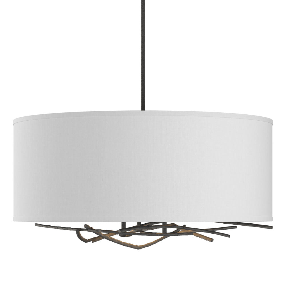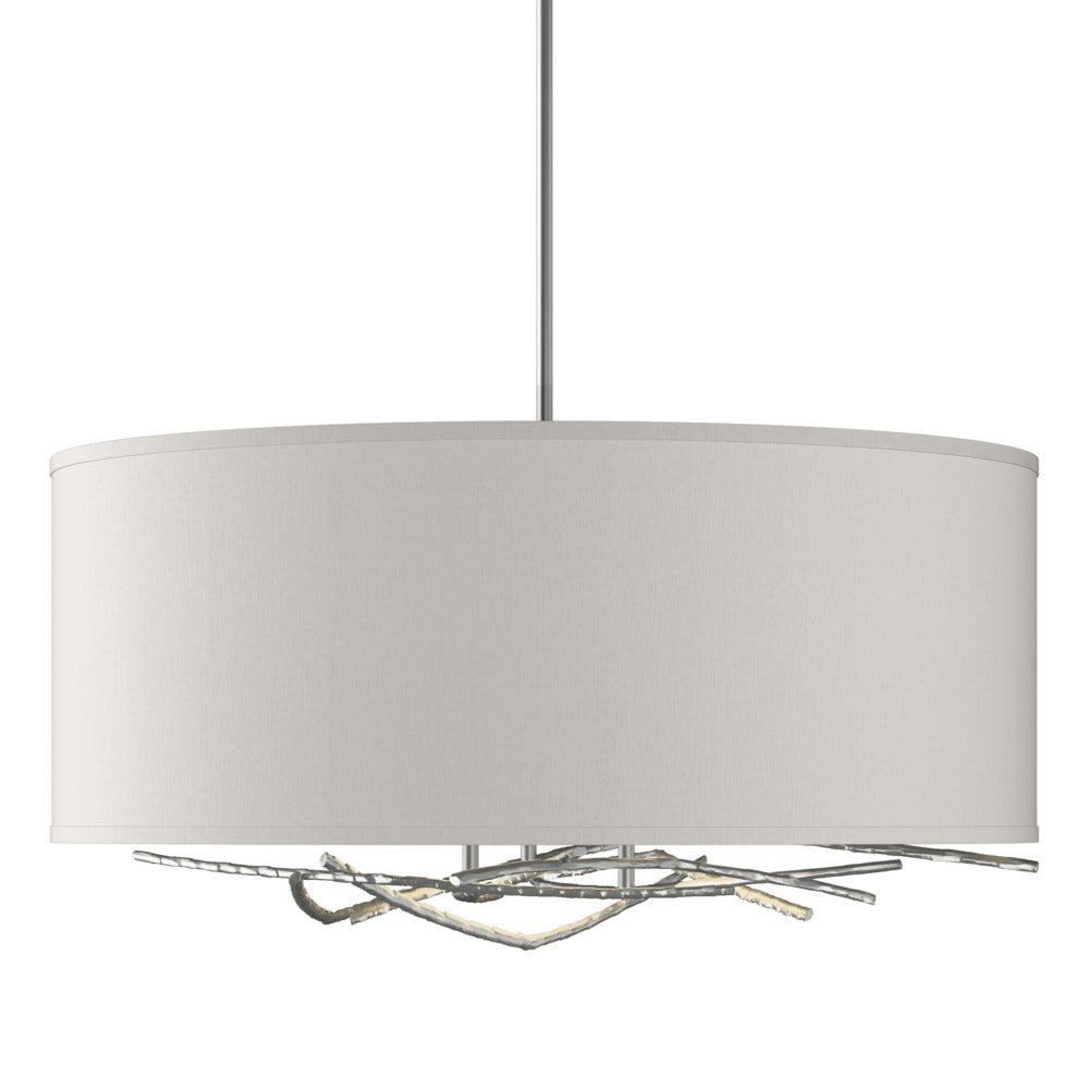 Sylvan meets steel with multi-faceted "twigs" forged from red-hot round bar stock hammered for texture and shape by our Vermont artisans. The twigs create the illusion of supporting the round shade that the sculpture hangs beneath.