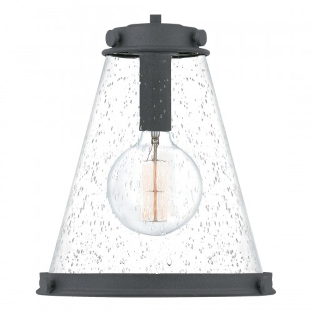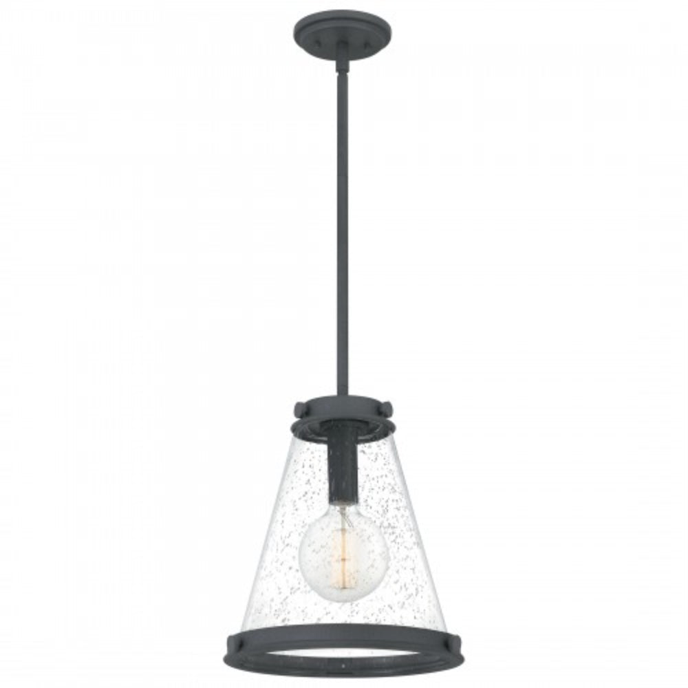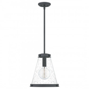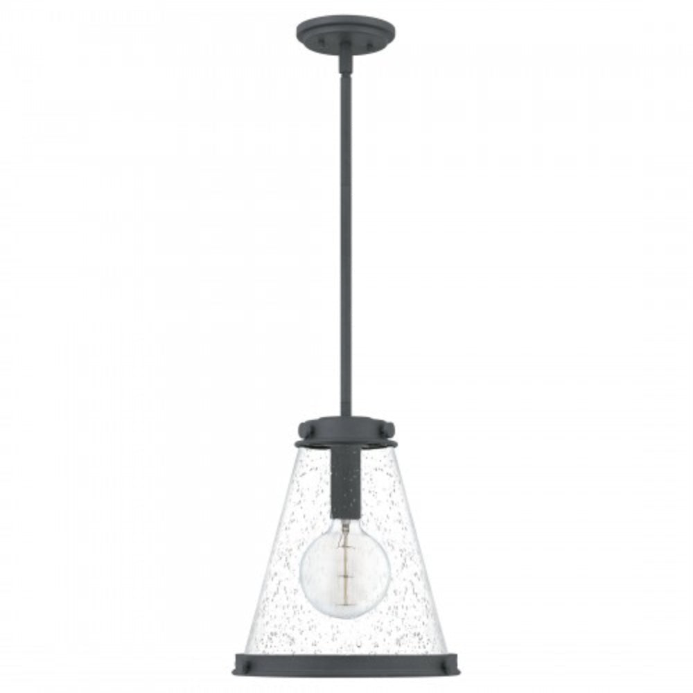 Clear seeded glass shades amplify illumination in the Bristol pendant, available with your choice of a mottled black, polished nickel, or weathered brass finish. A decorative band at the top and bottom of the shade grounds the look, while tonal rivets are a clever nod to industrial style.